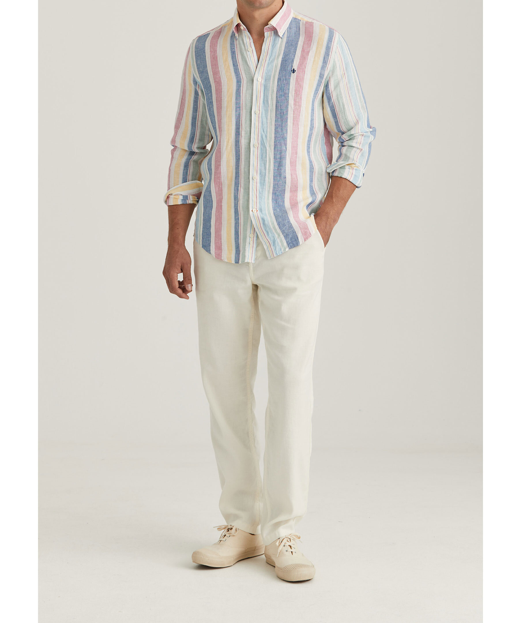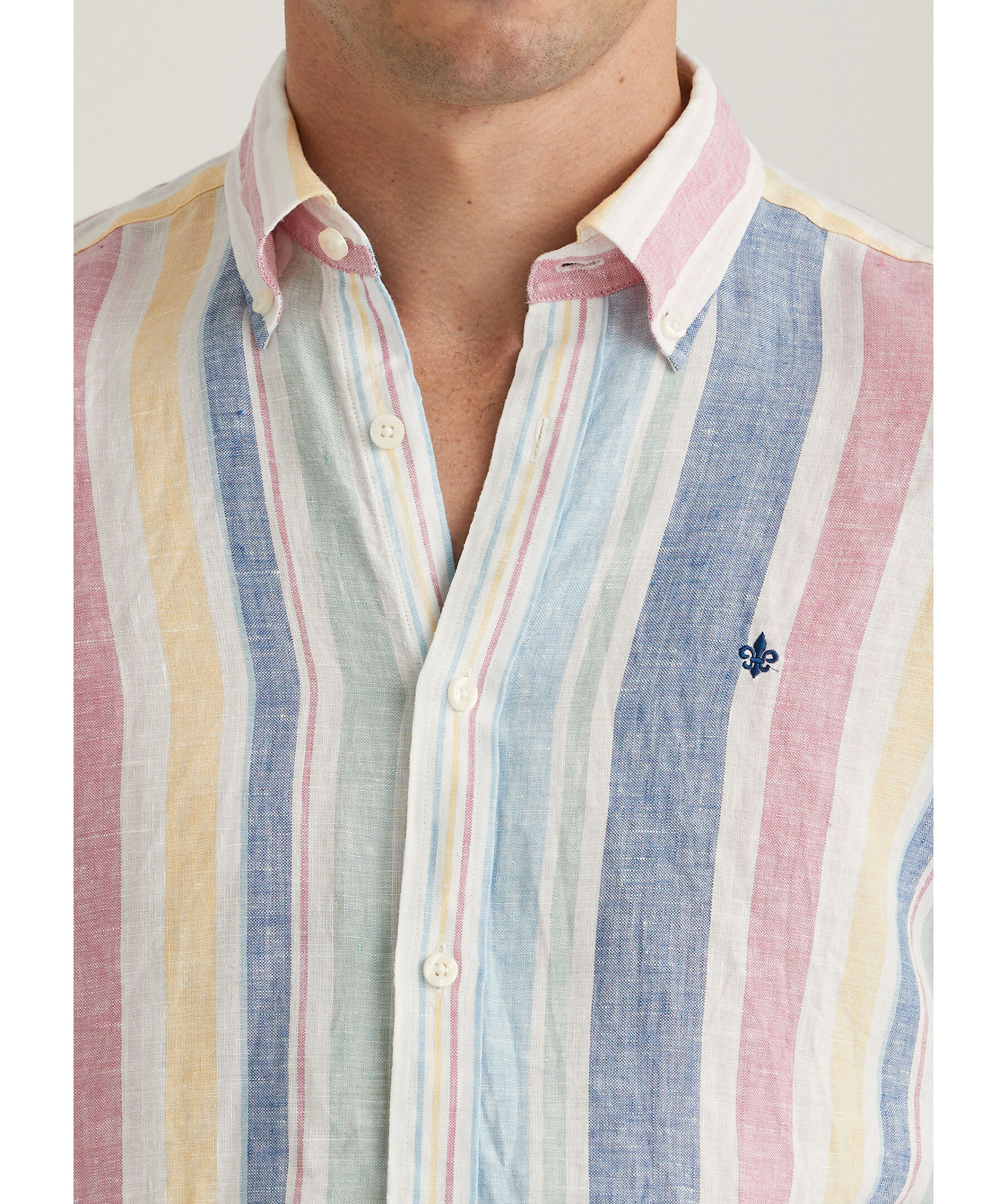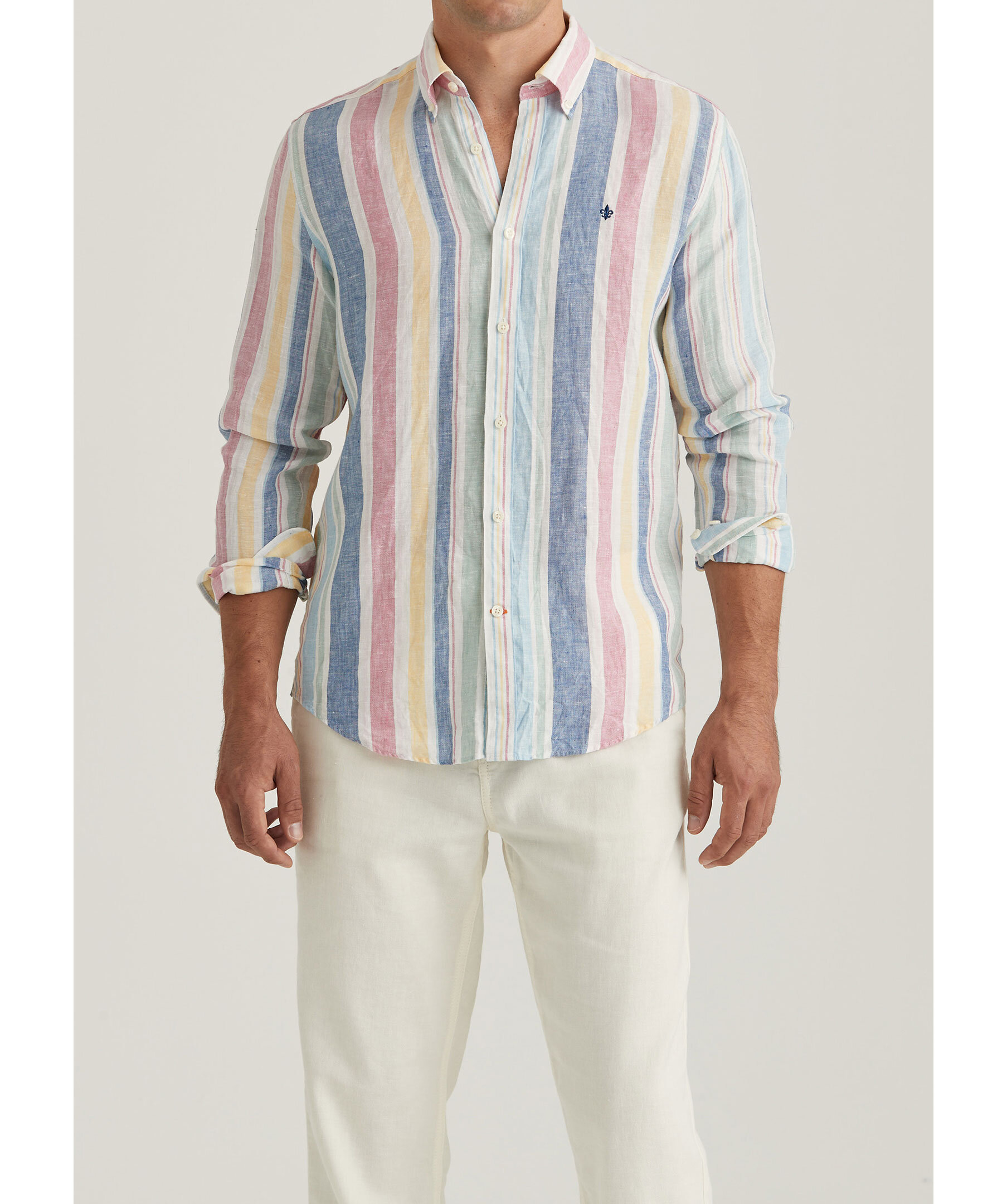 Multifärgad, randig linneskjorta från Morris. Button down krage, enkel manschett lätt rundad med två knappar samt Morris signaturlilja broderad på vänster bröst. Tillverkad i 100% linne. Normal passform.