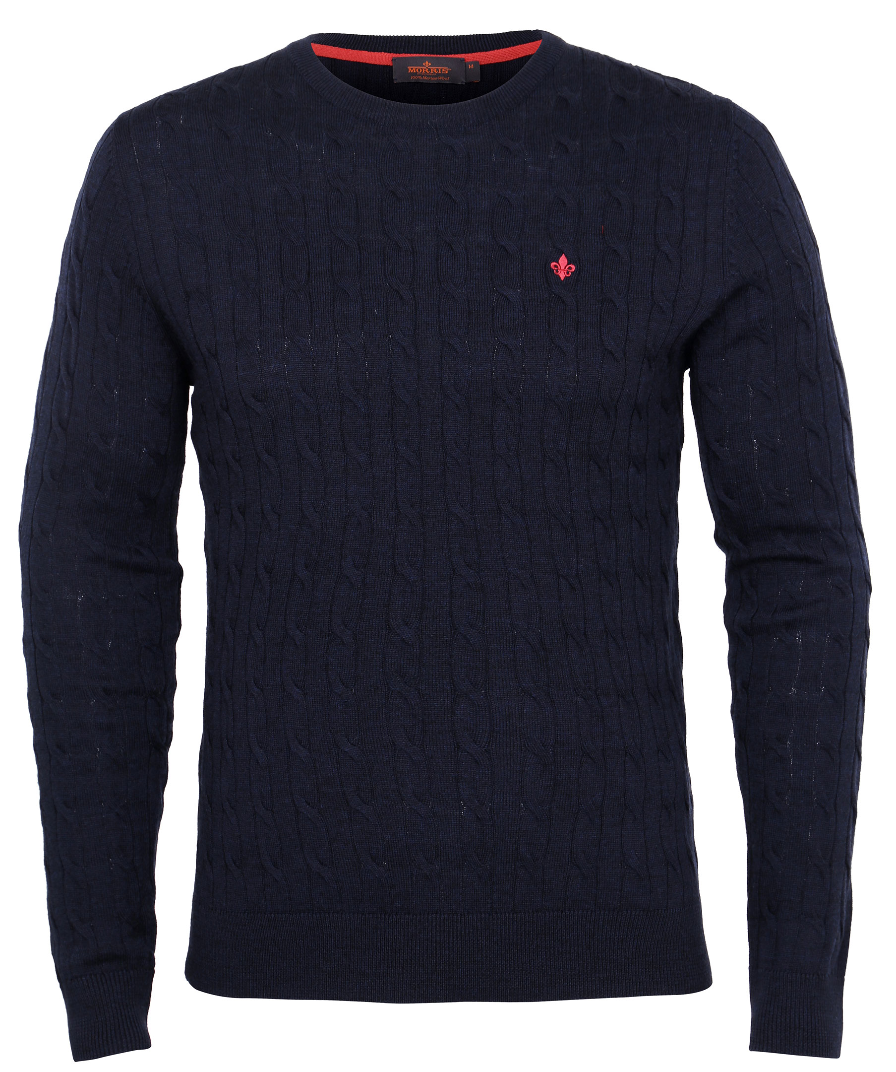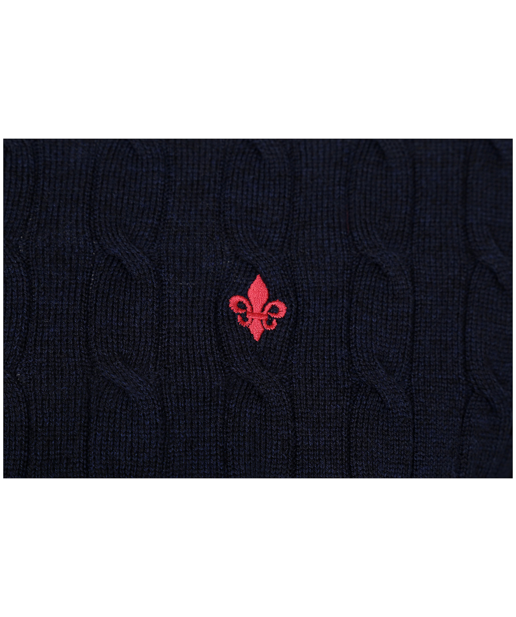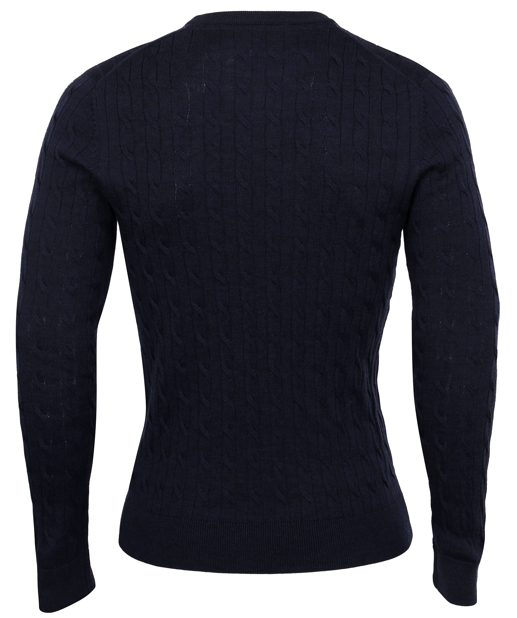 Kabelstickad tröja i ull från Morris med rundad hals och diskret brodyr på vänster bröst.