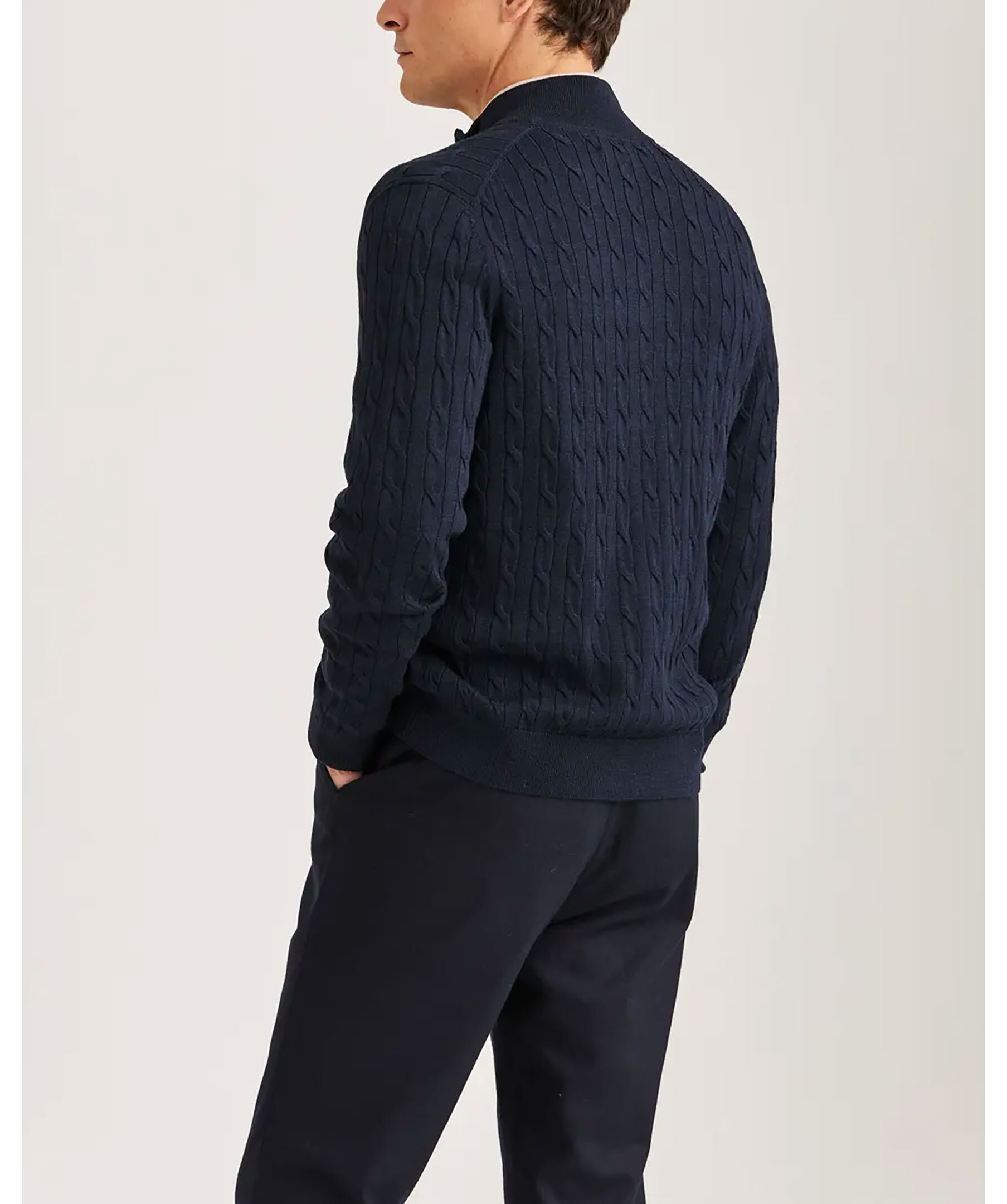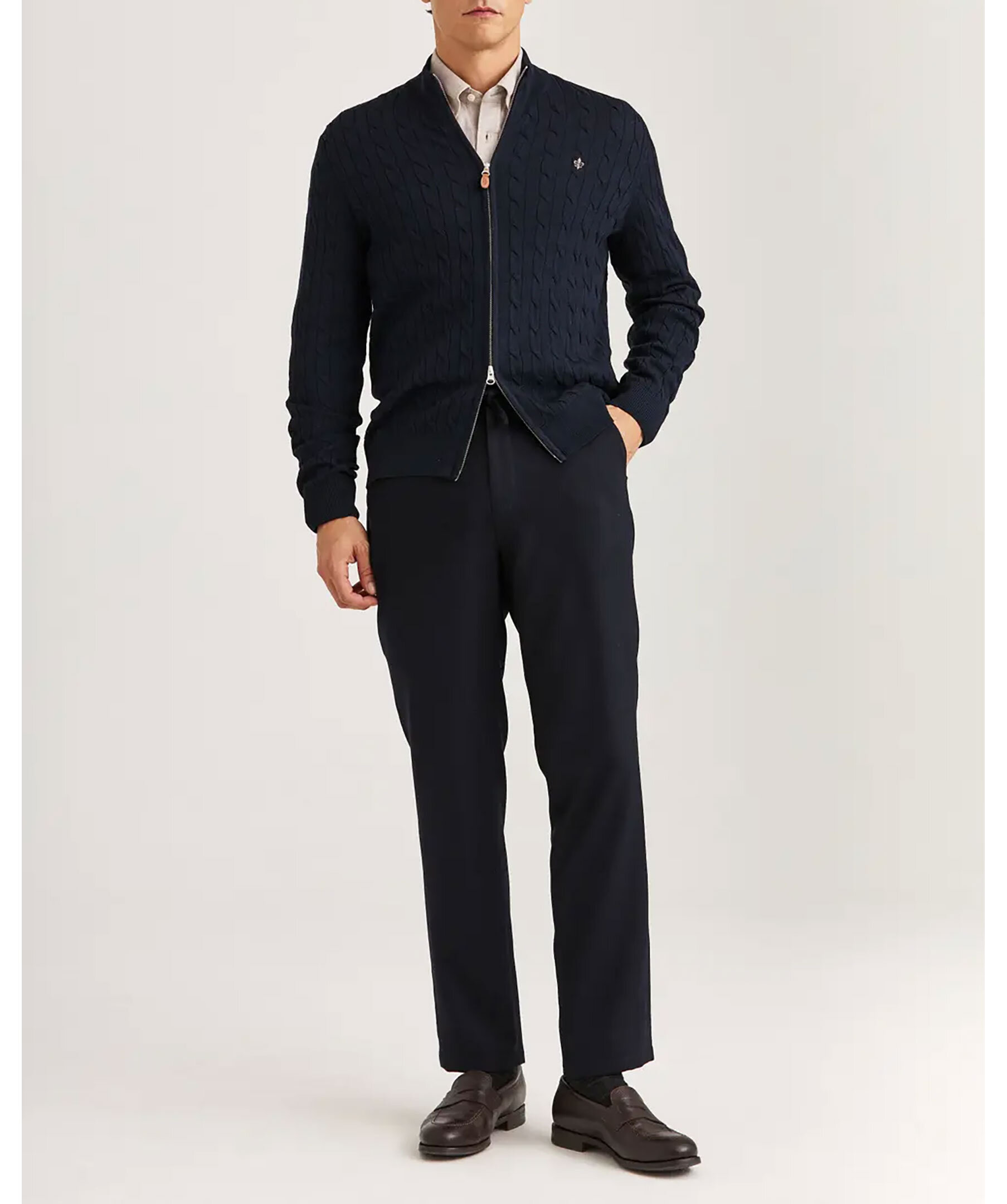 Merino Cable Zip Cardigan i färgen navy från Morris. Cardiganen har kabelstickad struktur, hel dragkedja framtill och en lyxig broderad lilja på bröstet. Tillverkad i 100 % merinoull, vilket ger värme och andningsförmåga samtidigt som den känns mjuk och följsam. En slim fit-modell som fungerar både över skjorta och för sig själv.