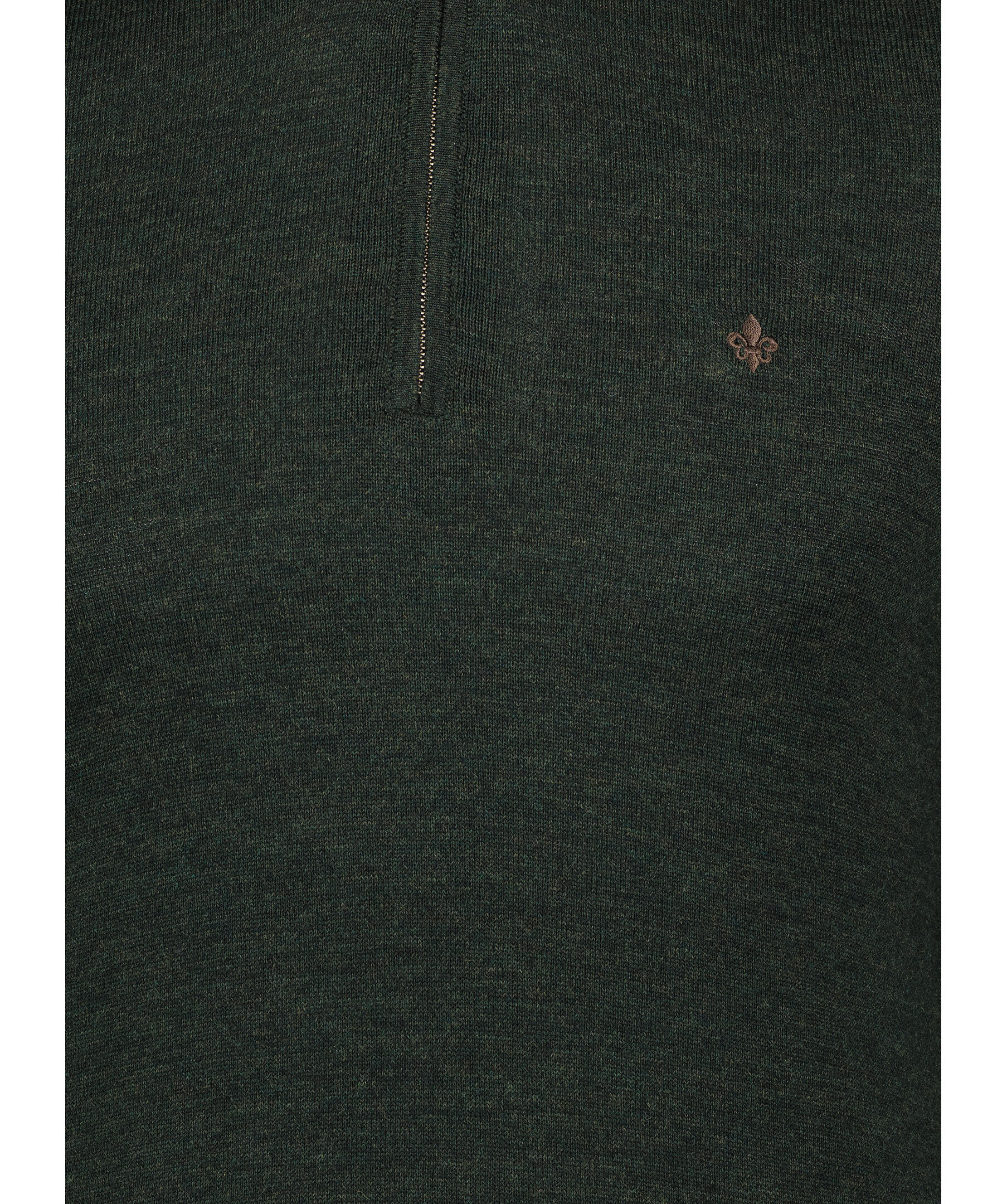 Grön finstickad tröja från Morris. Tröjan har en hög krage med halvzip. Gjord i 100% merinoull. Broderad lilja på bröstet och ribbstickade muddar. Smal passform.