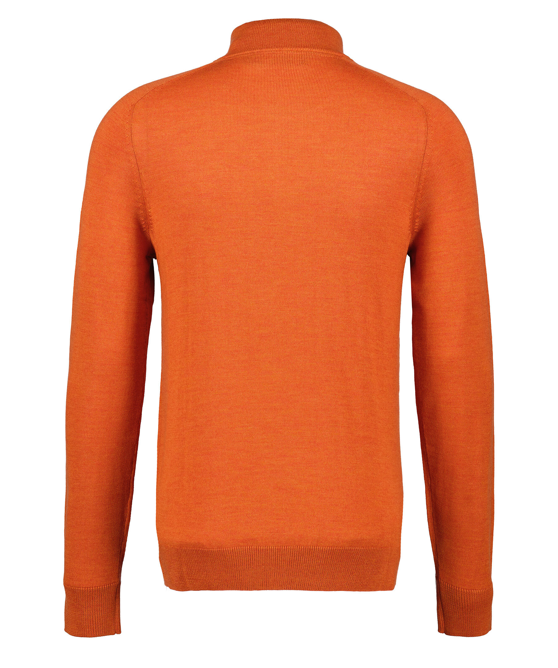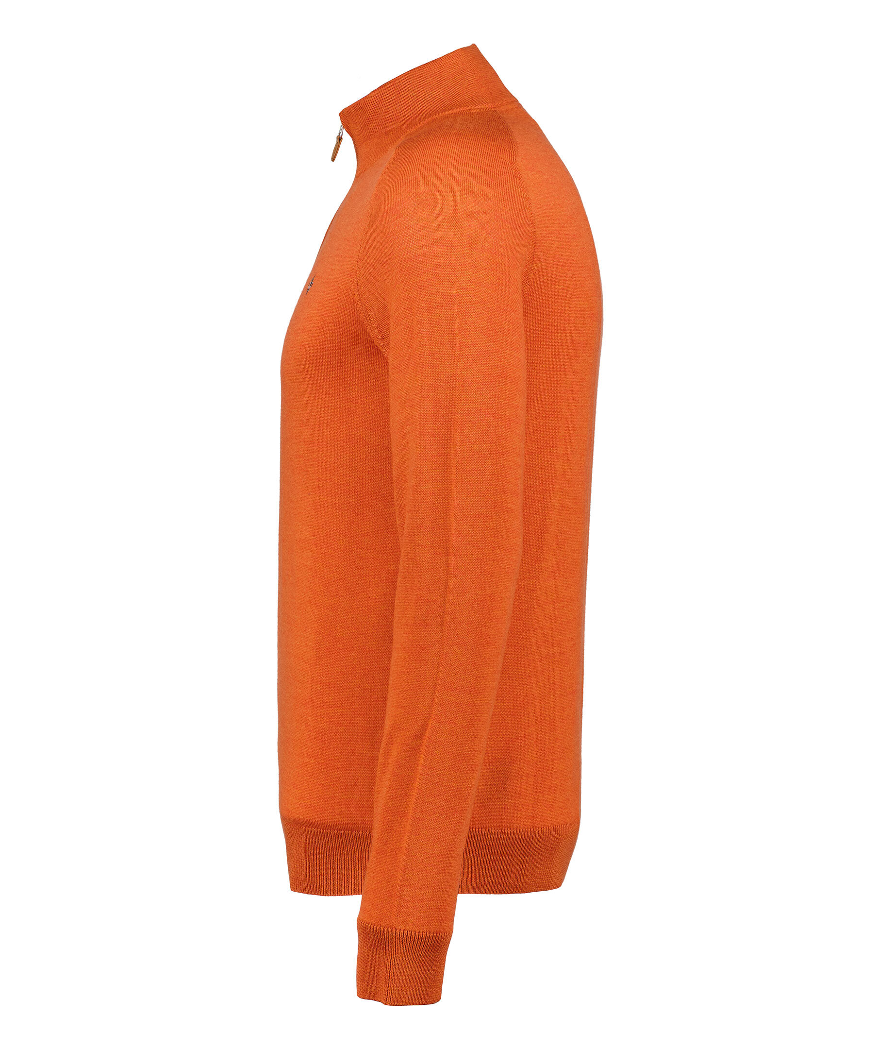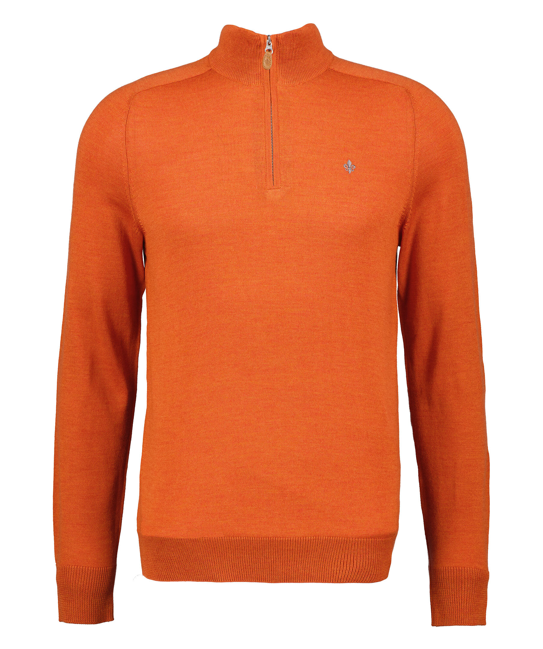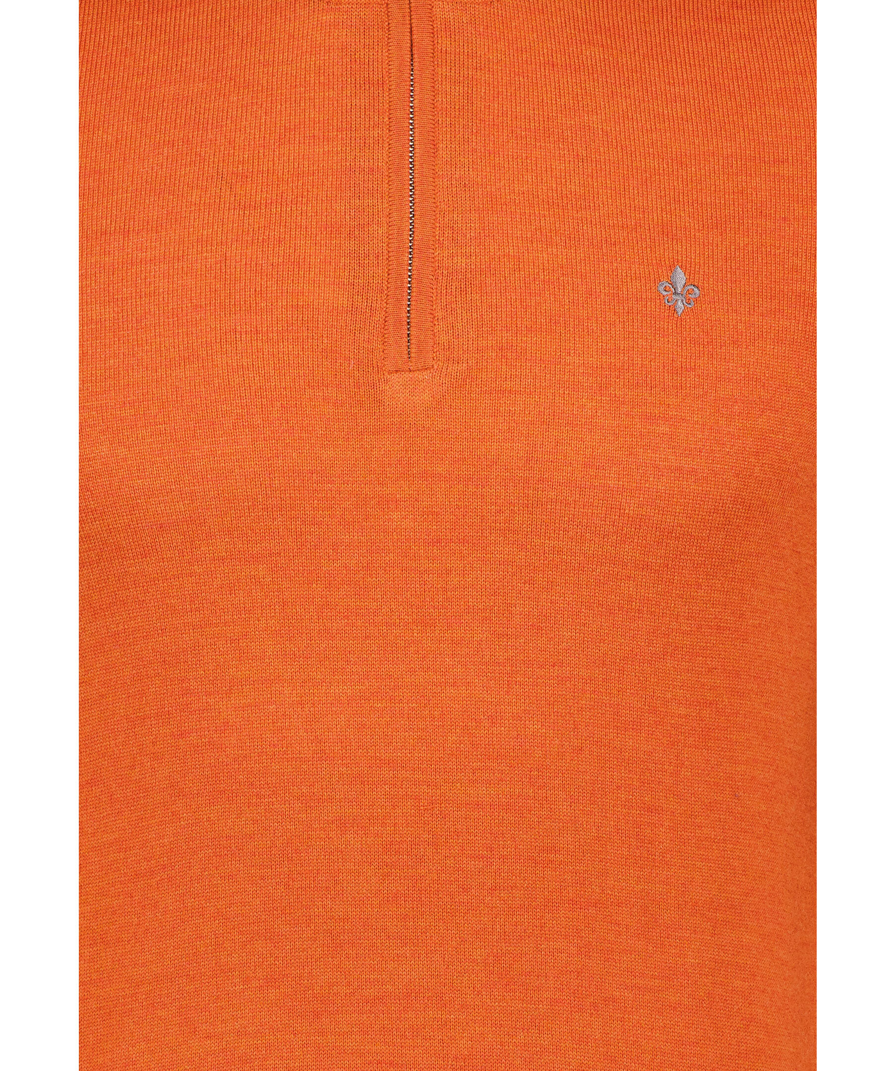 Orange finstickad tröja från Morris. Tröjan har en hög krage med halvzip. Gjord i 100% merinoull. Broderad lilja på bröstet och ribbstickade muddar. Smal passform.