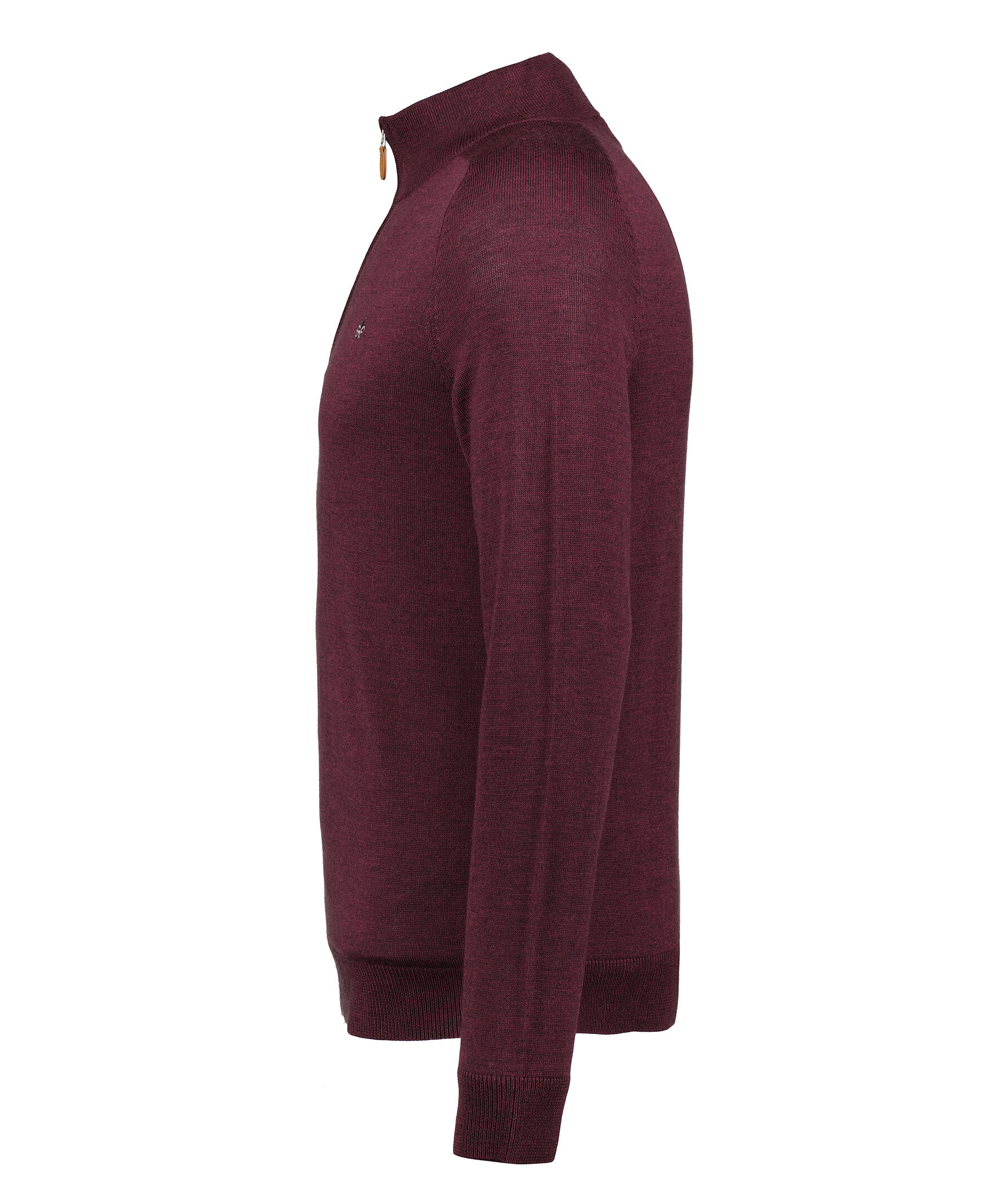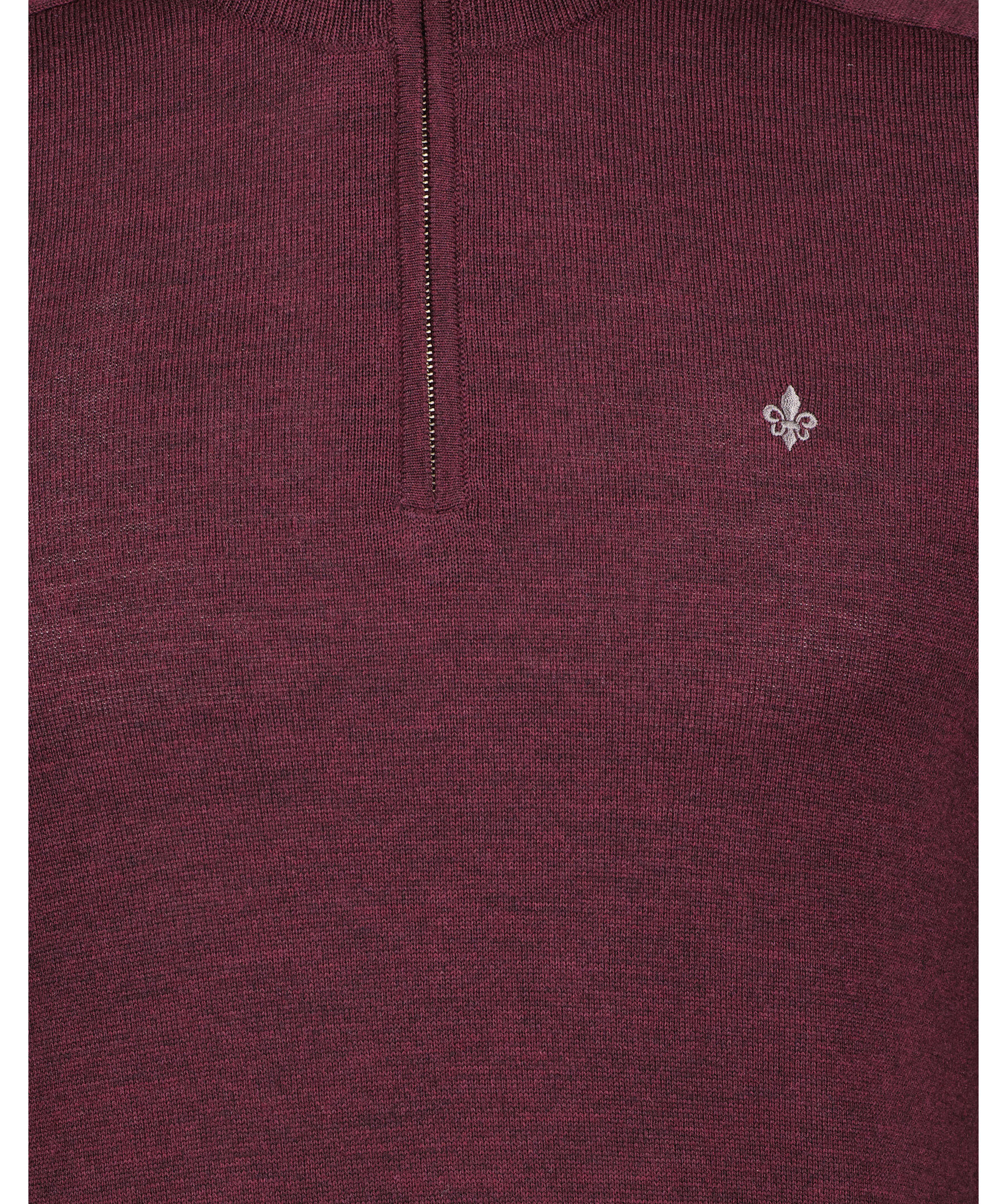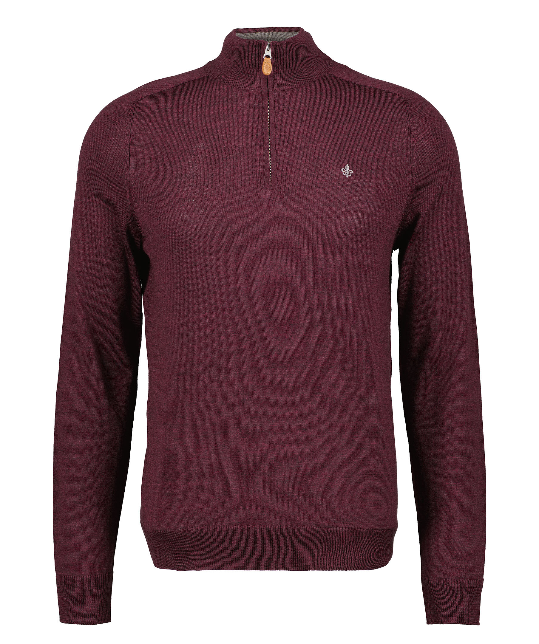 Vinröd finstickad tröja från Morris. Tröjan har en hög krage med halvzip. Gjord i 100% merinoull. Broderad lilja på bröstet och ribbstickade muddar. Smal passform.