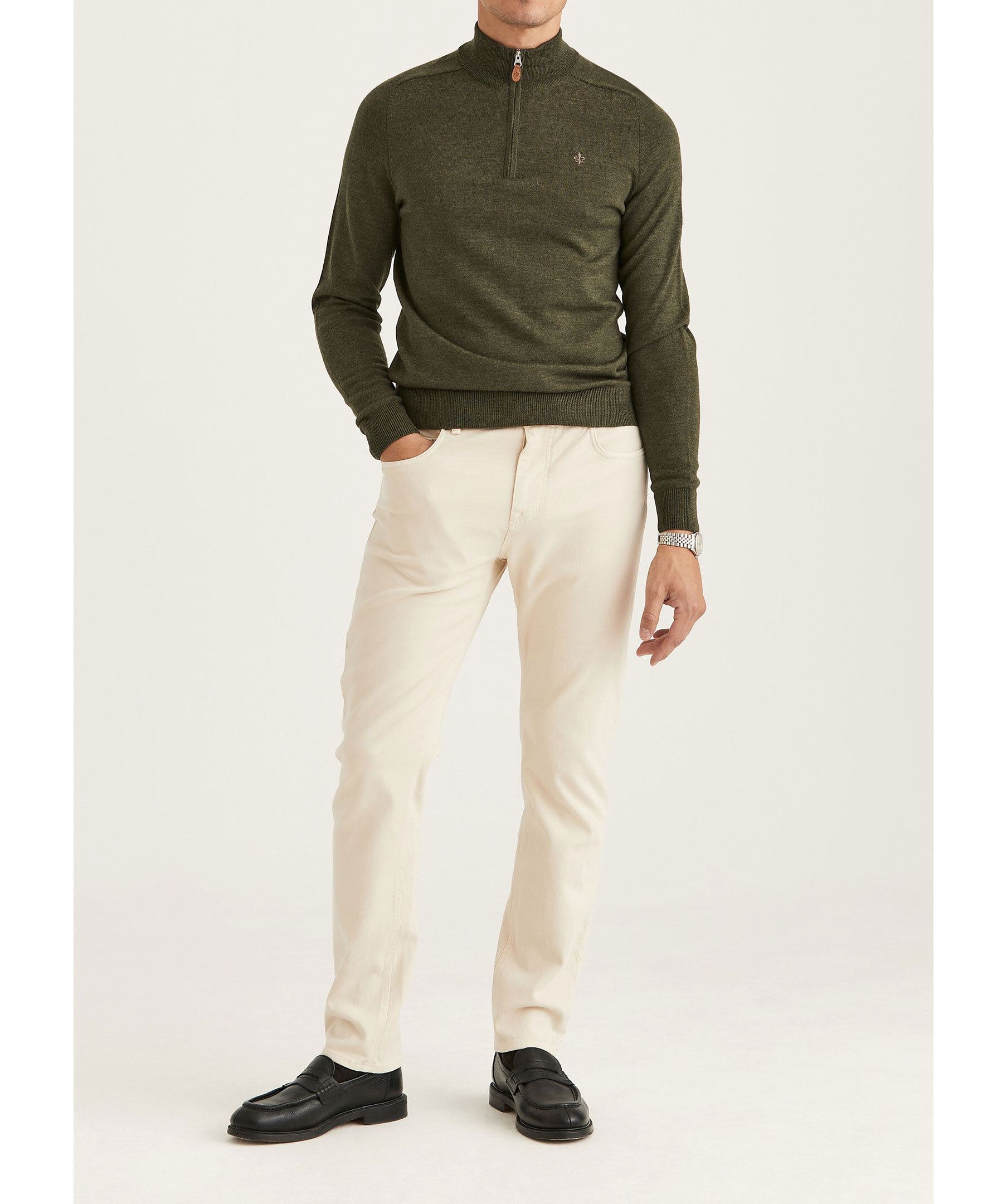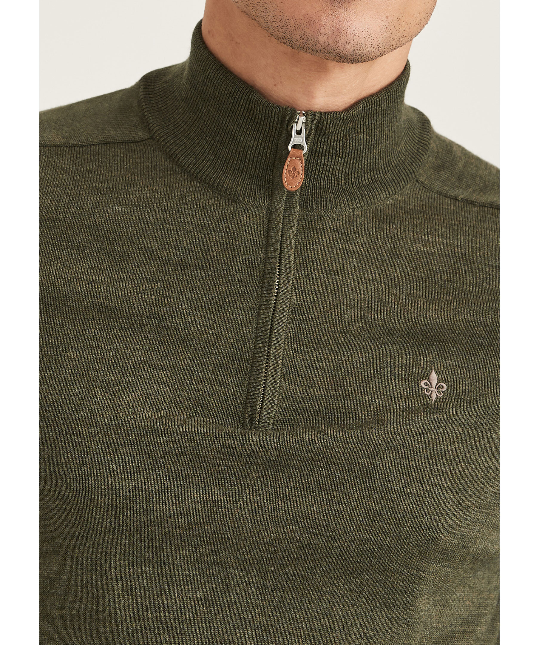 Olivgrön finstickad tröja från Morris. Tröjan har en hög krage med half zip. Broderad lilja på bröstet och ribbstickade muddar. Gjord i 100% merinoull.