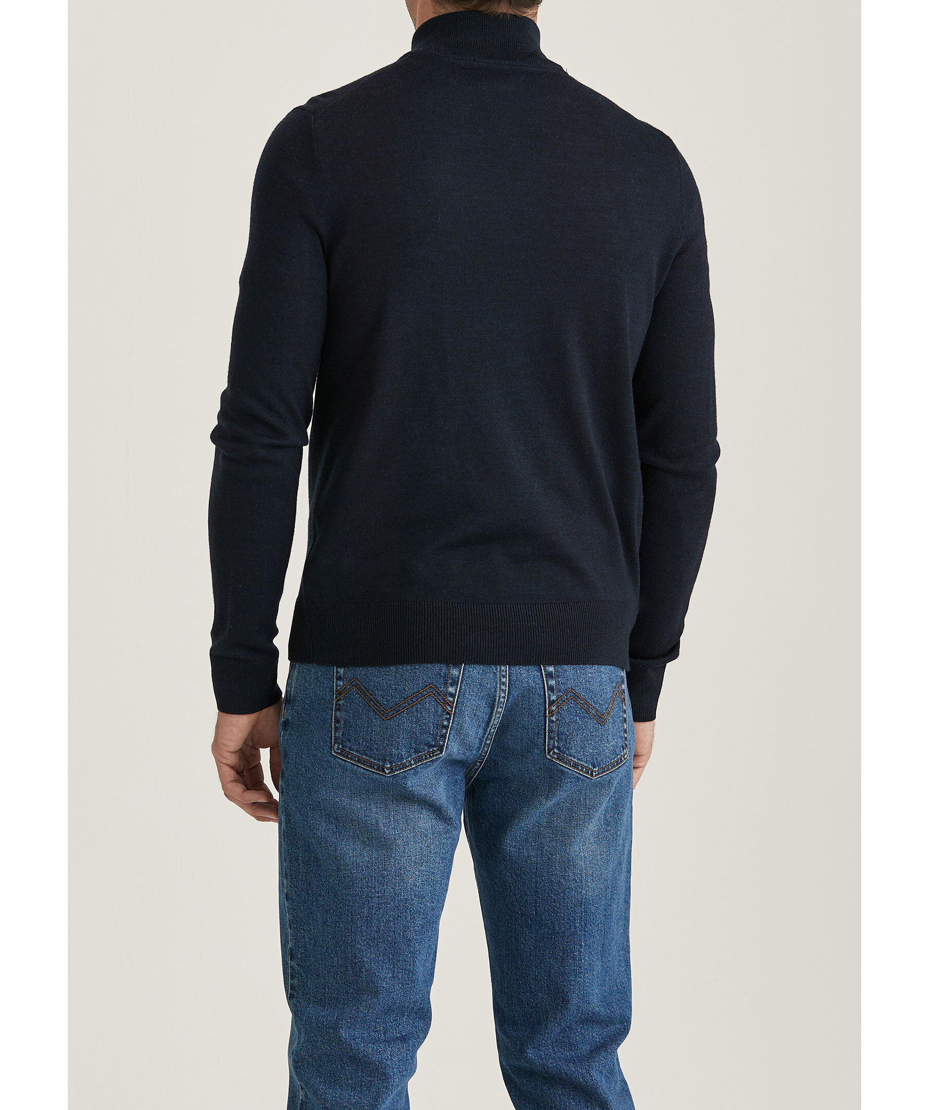 Mörkblå finstickad cardigan från Morris. Gjord i 100% merinoull. Broderad lilja på bröstet och ribbstickade muddar. Cardigan stängs med en tvåvägsdragkedja.