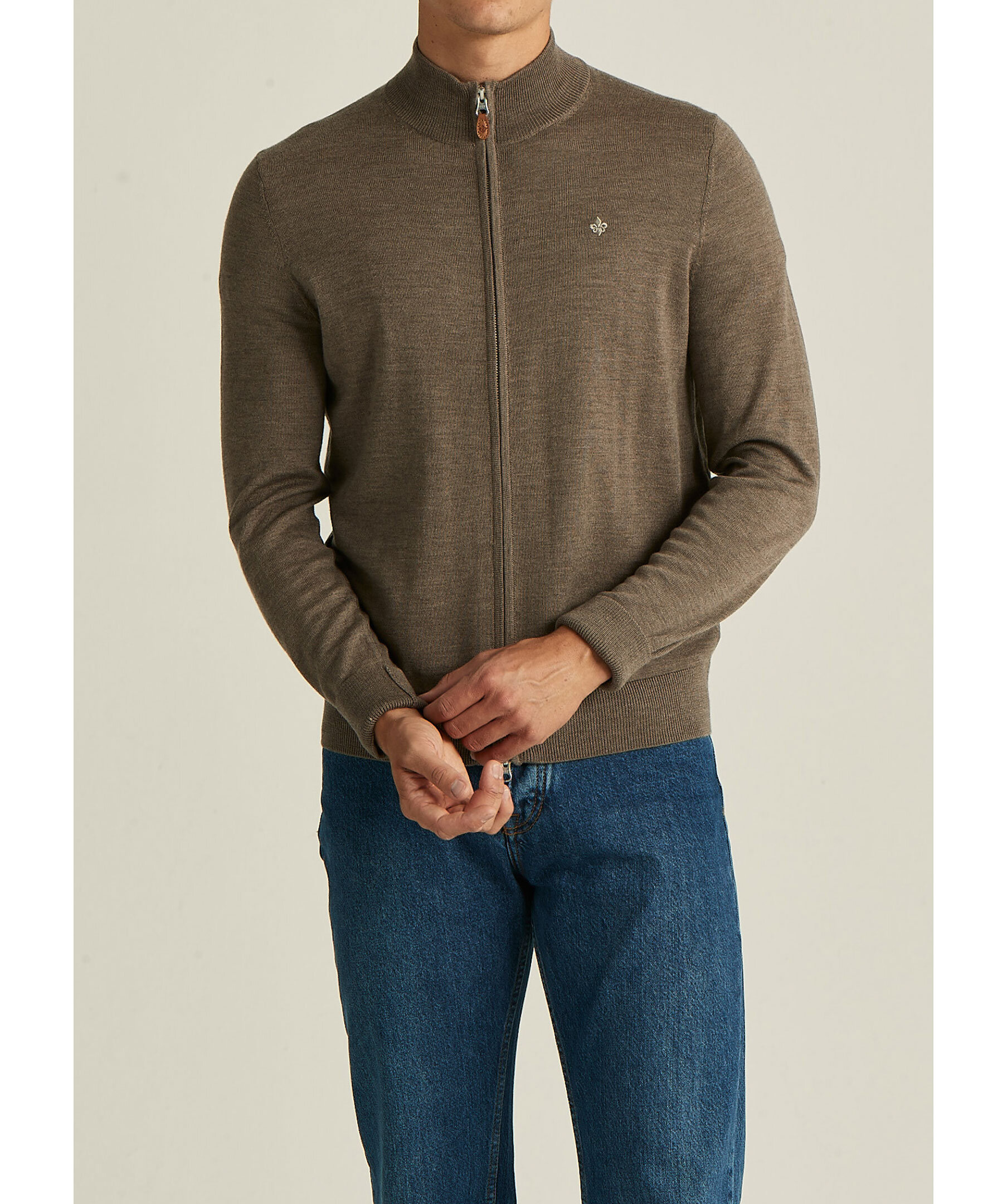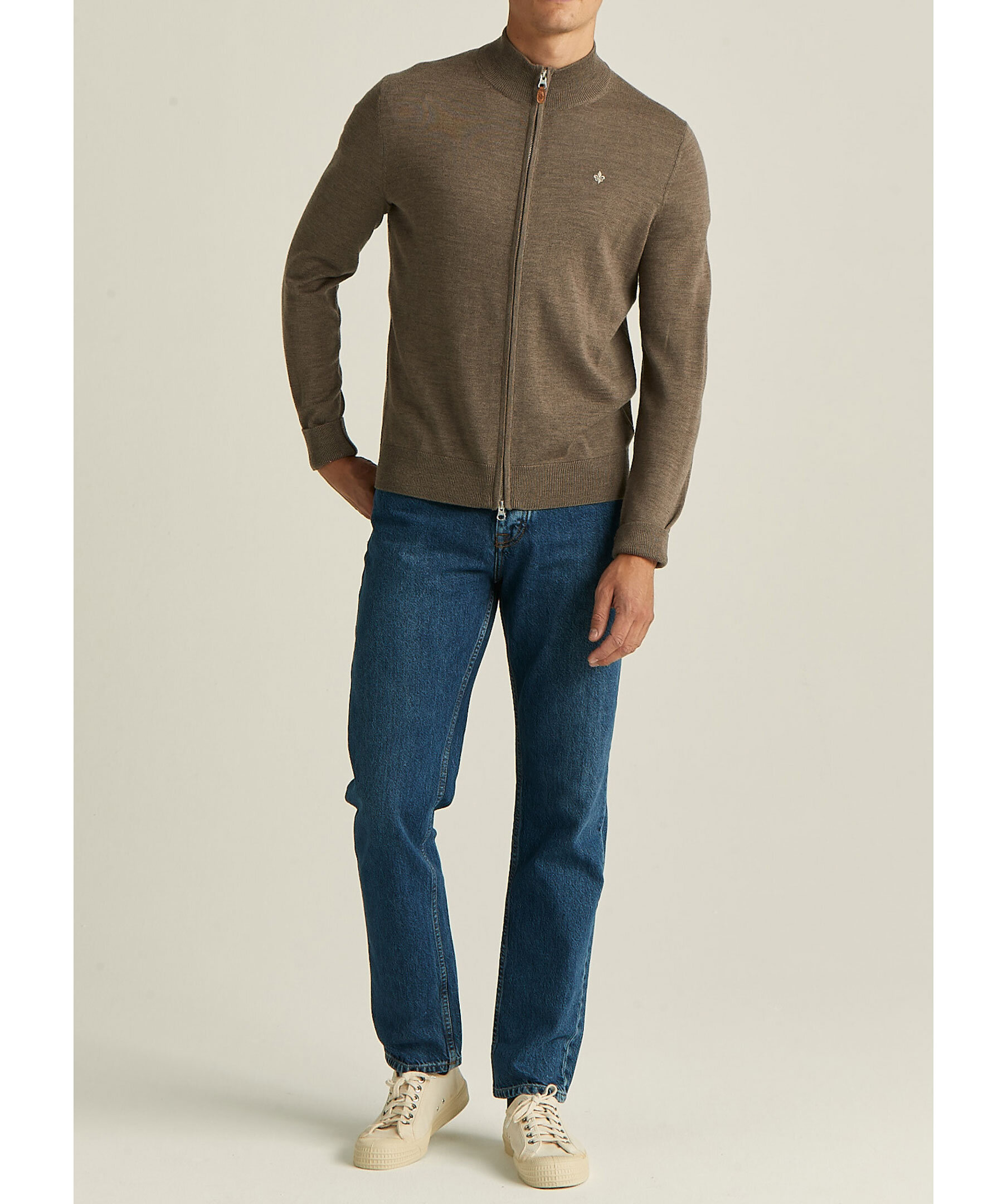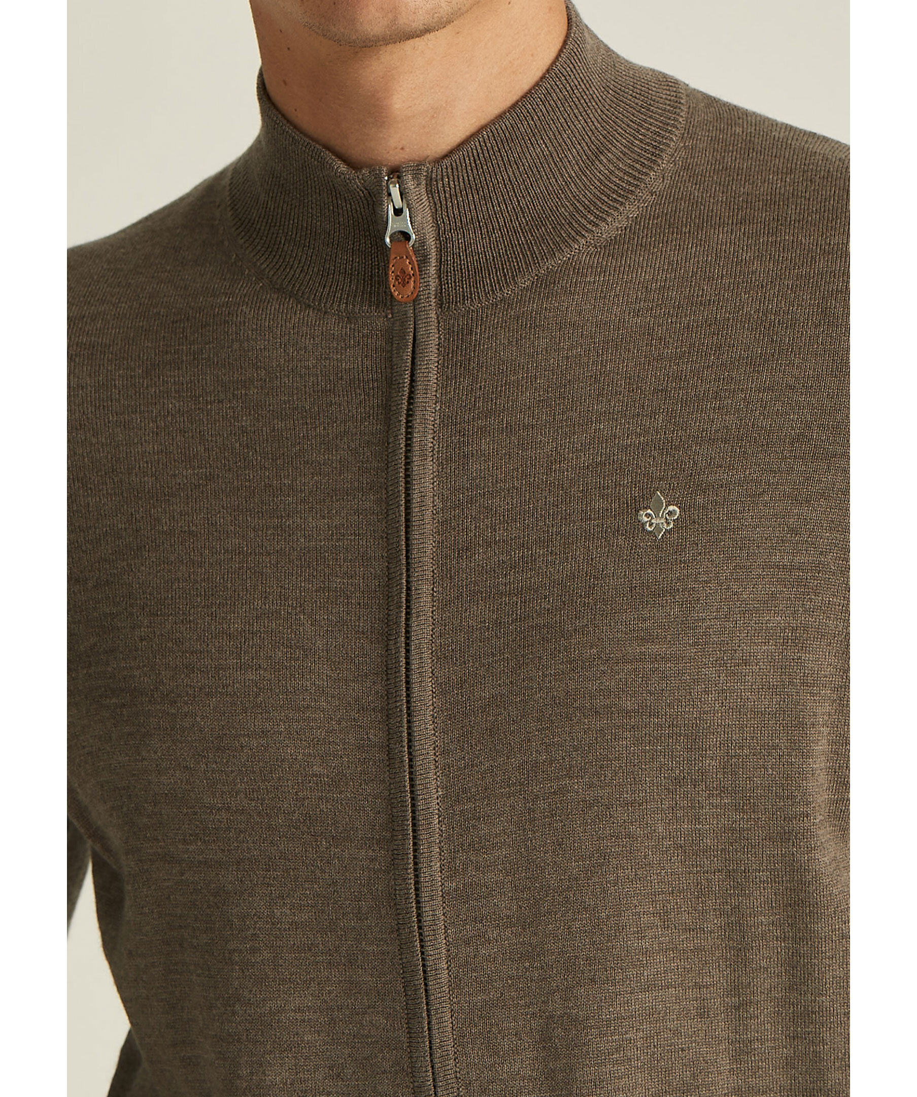 Brun finstickad cardigan från Morris. Gjord i 100% merinoull. Broderad lilja på bröstet och ribbstickade muddar. Cardigan stängs med en tvåvägsdragkedja.