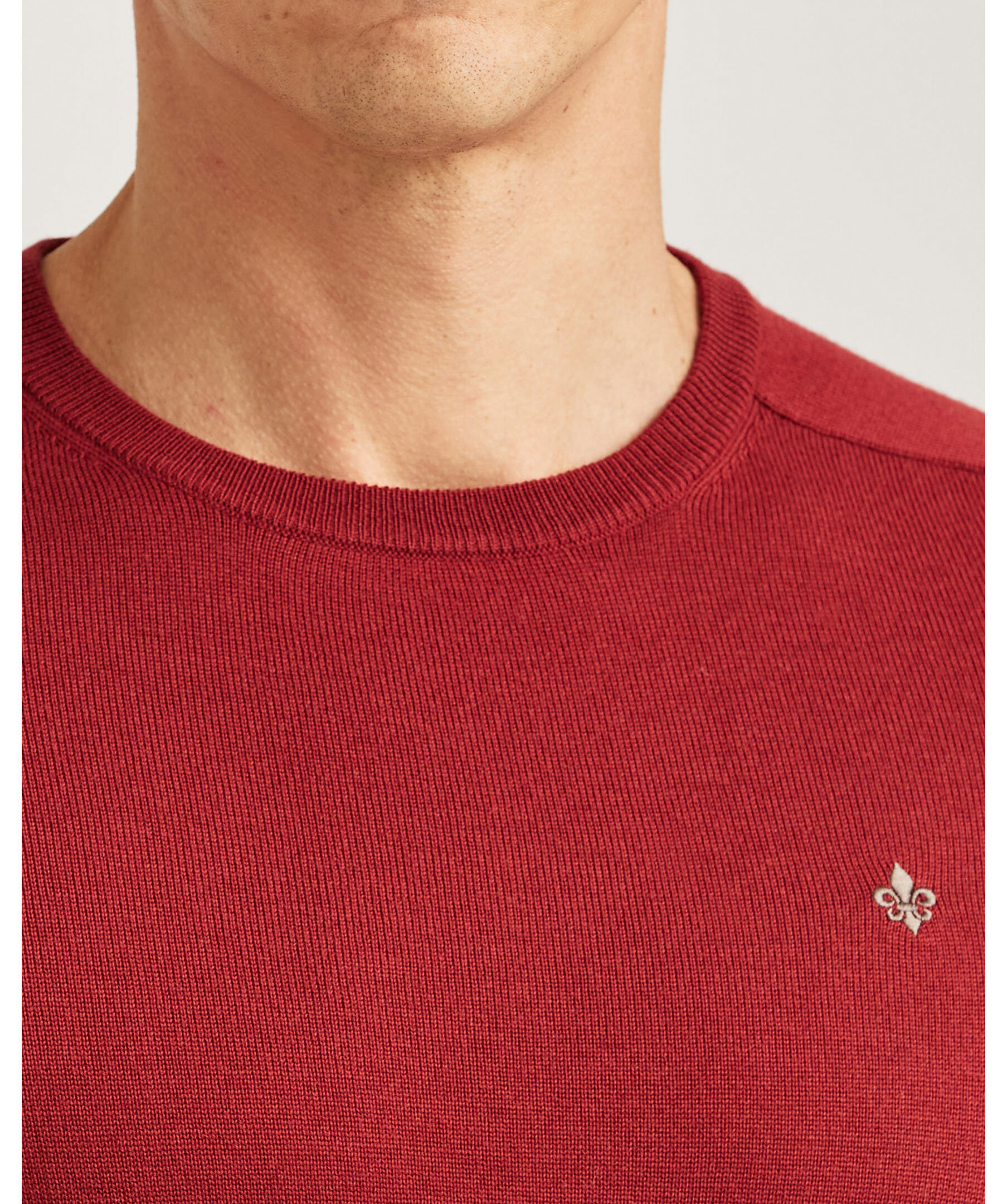 Röd, finstickad merinoullströja från Morris. Tröjan har en smal passform och är gjord i 100% merinoull. Ribbstickade muddar och en broderad Morris lilja på bröstet.