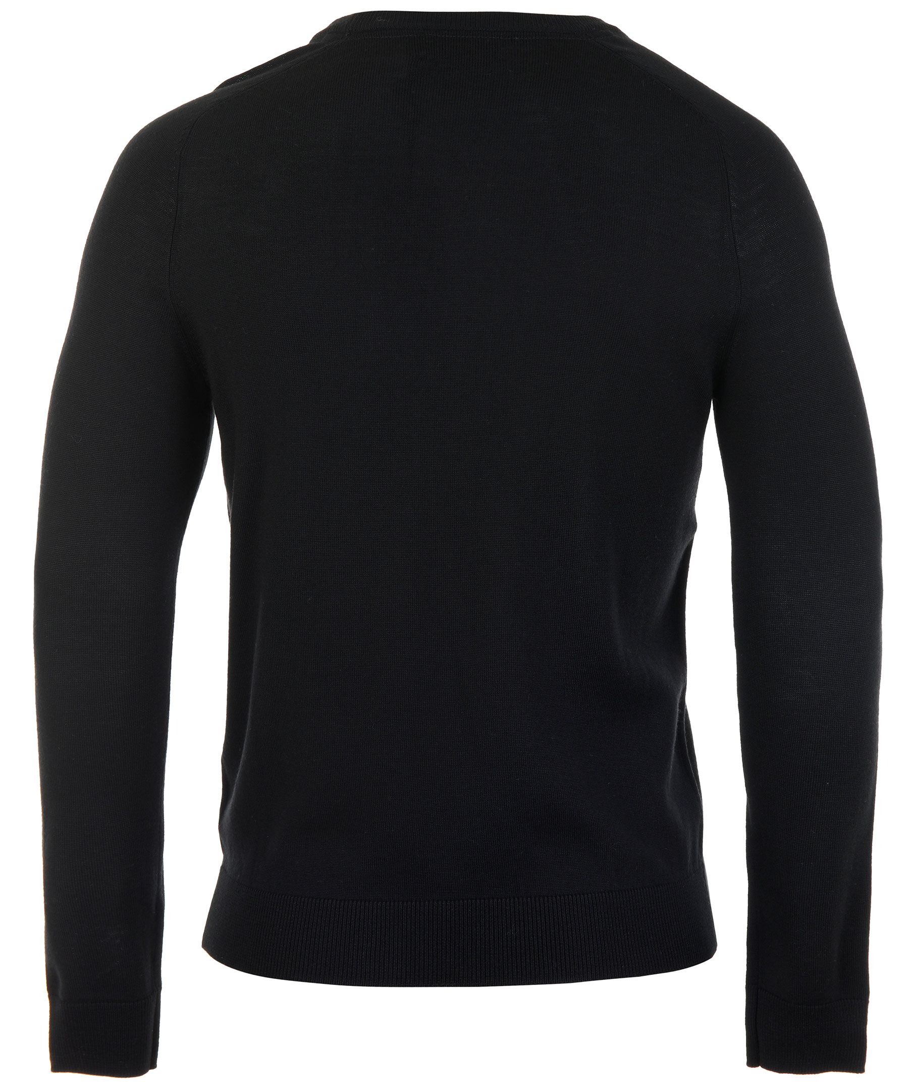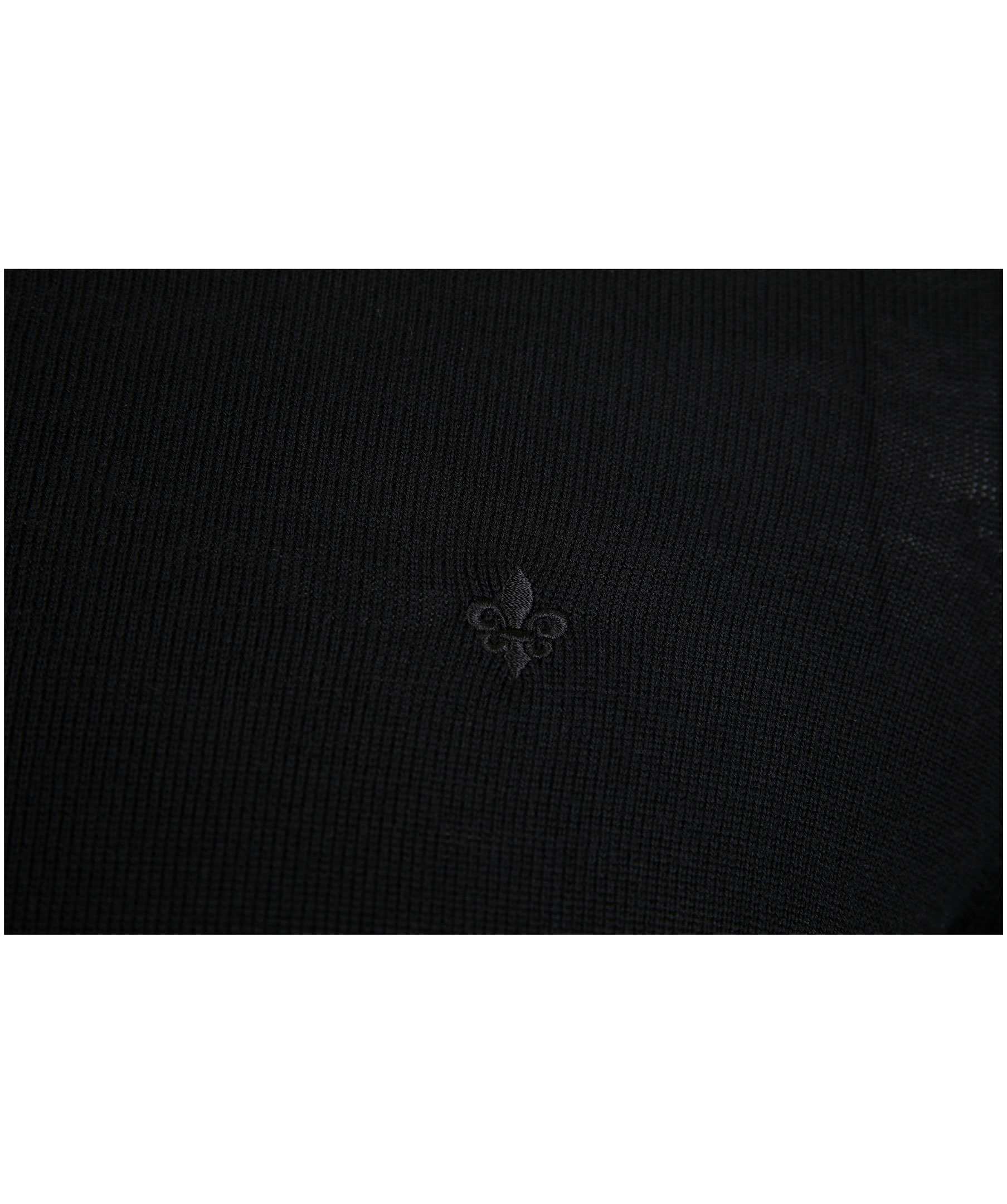 Svart, finstickad tröja från Morris. Tillverkad i 100% ull. Liten, broderad lilja på sidan av bröstet, normal passform. Rundad halsringning och ribbade muddar i ärmslut och plaggslut.