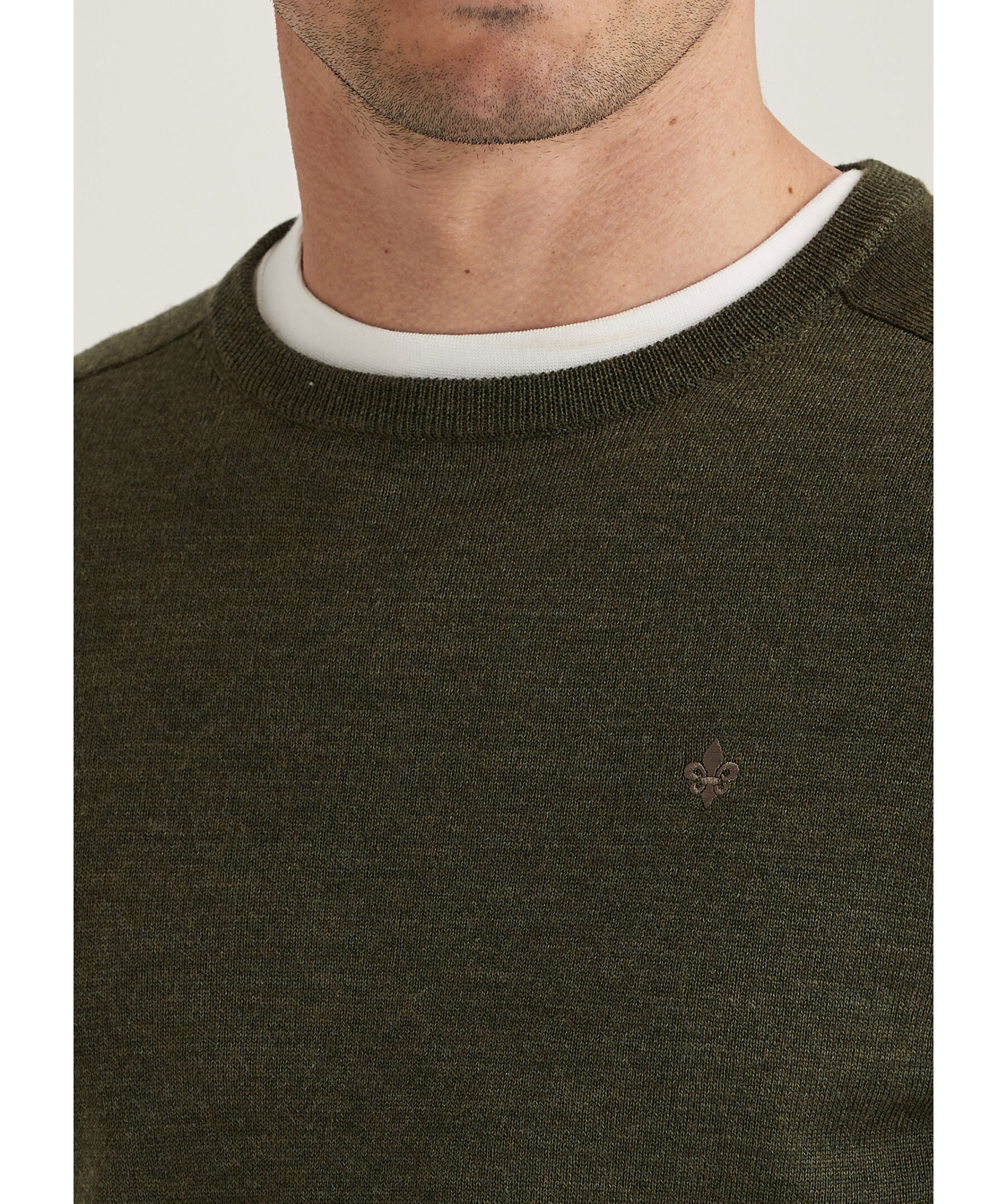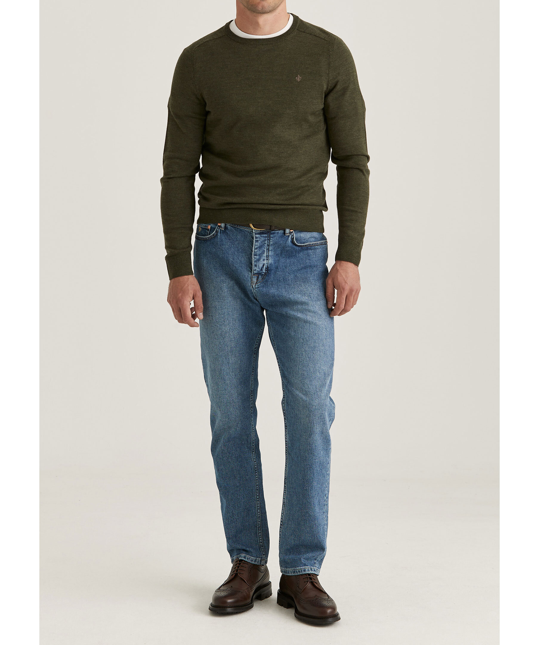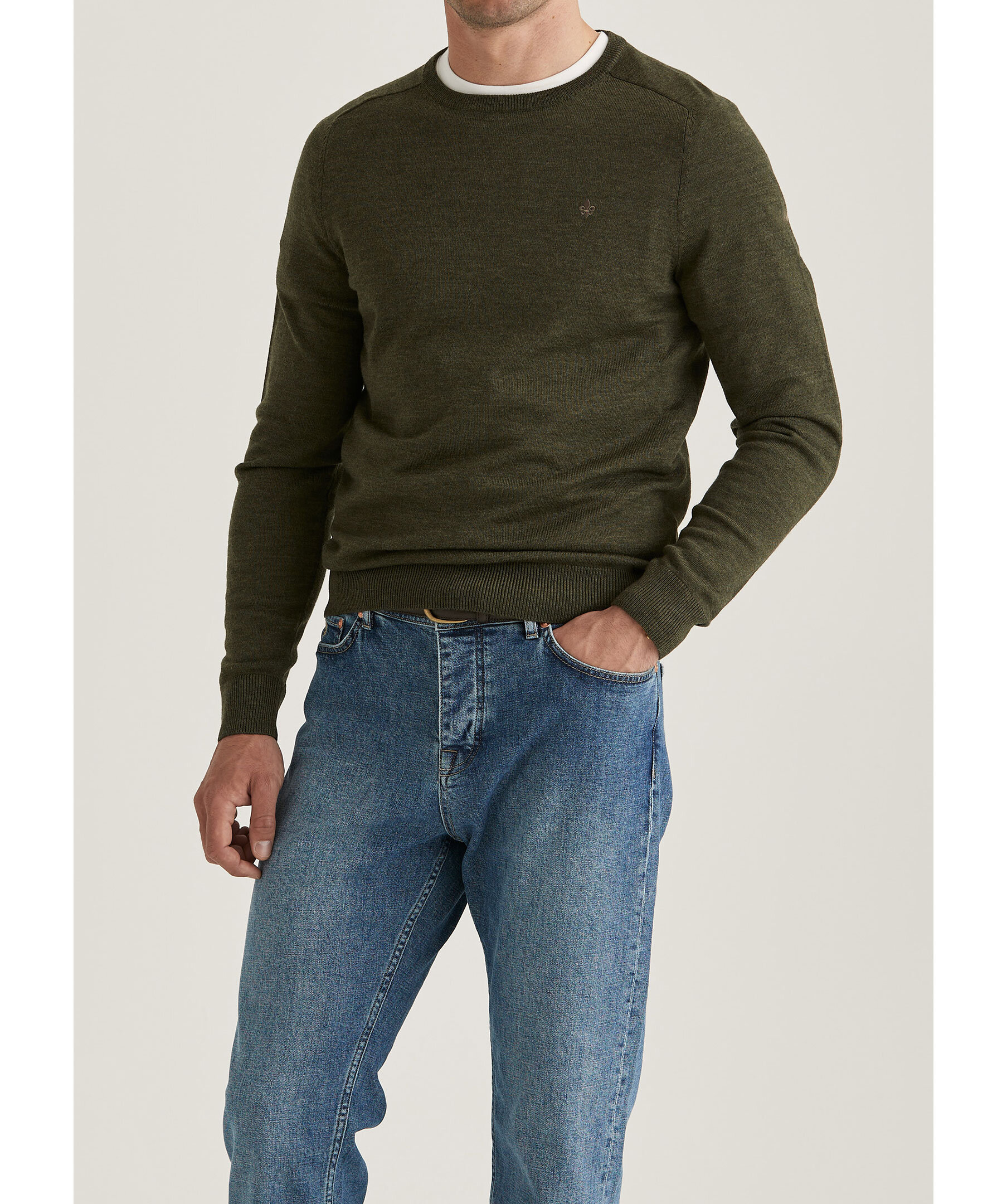 Olivgrön, finstickad tröja från Morris. Tröjan har rund, ribbstickad halsringning samt ribbstickade muddar vid ärm- och plaggslut och en broderad lilja på bröstet. Tillverkad i merinoull.