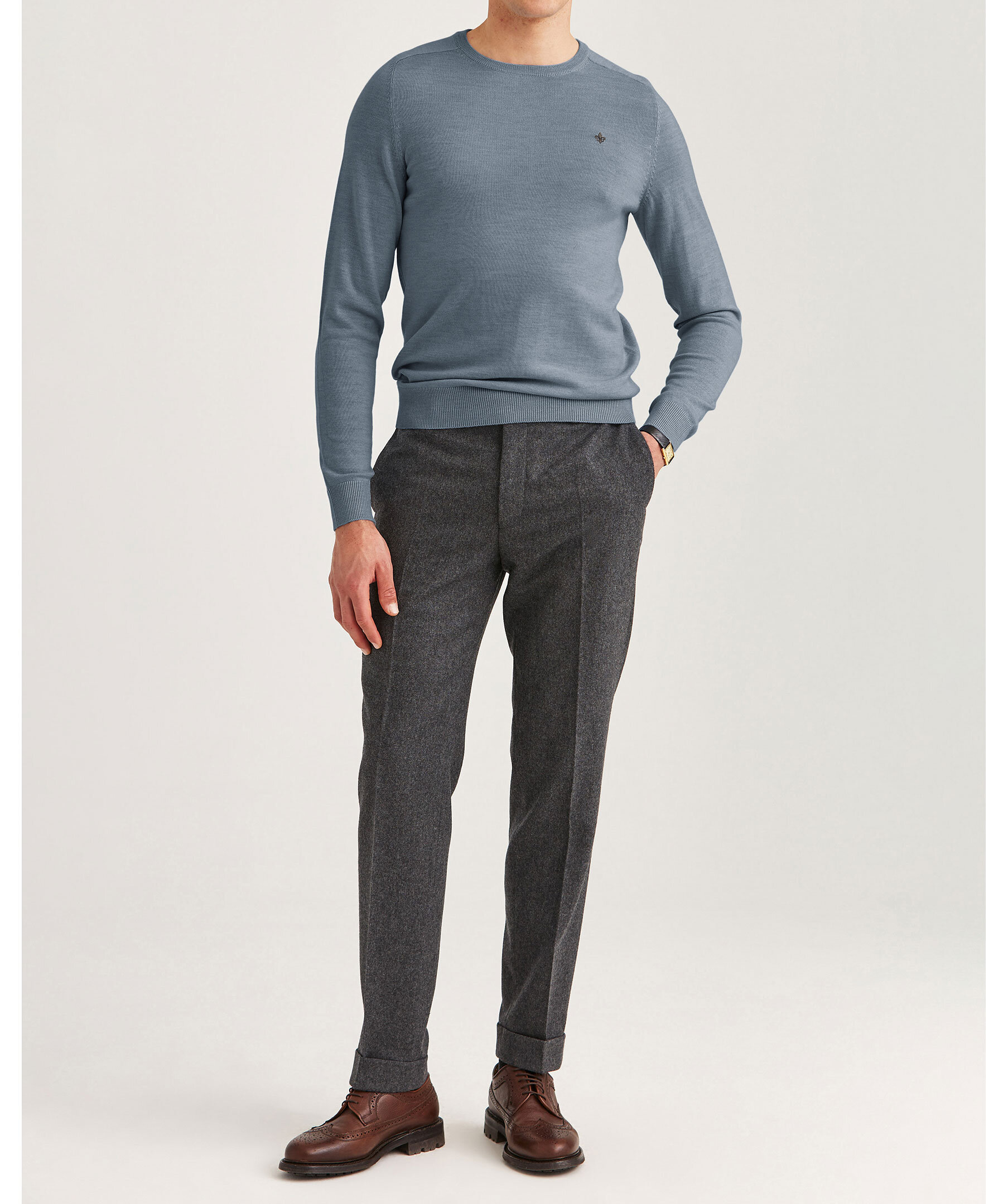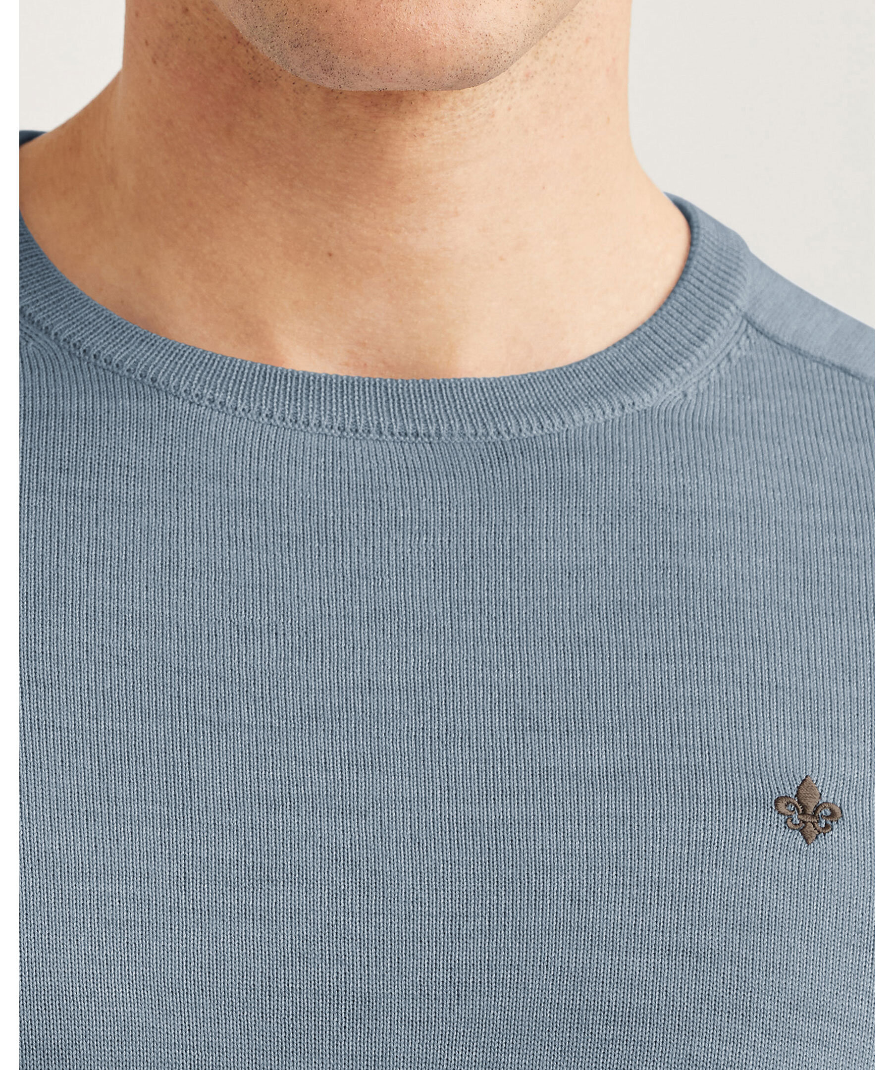 Blå, finstickad merinoullströja från Morris. Tröjan har en smal passform och är gjord i 100% merinoull. Ribbstickade muddar och en broderad Morris lilja på bröstet.