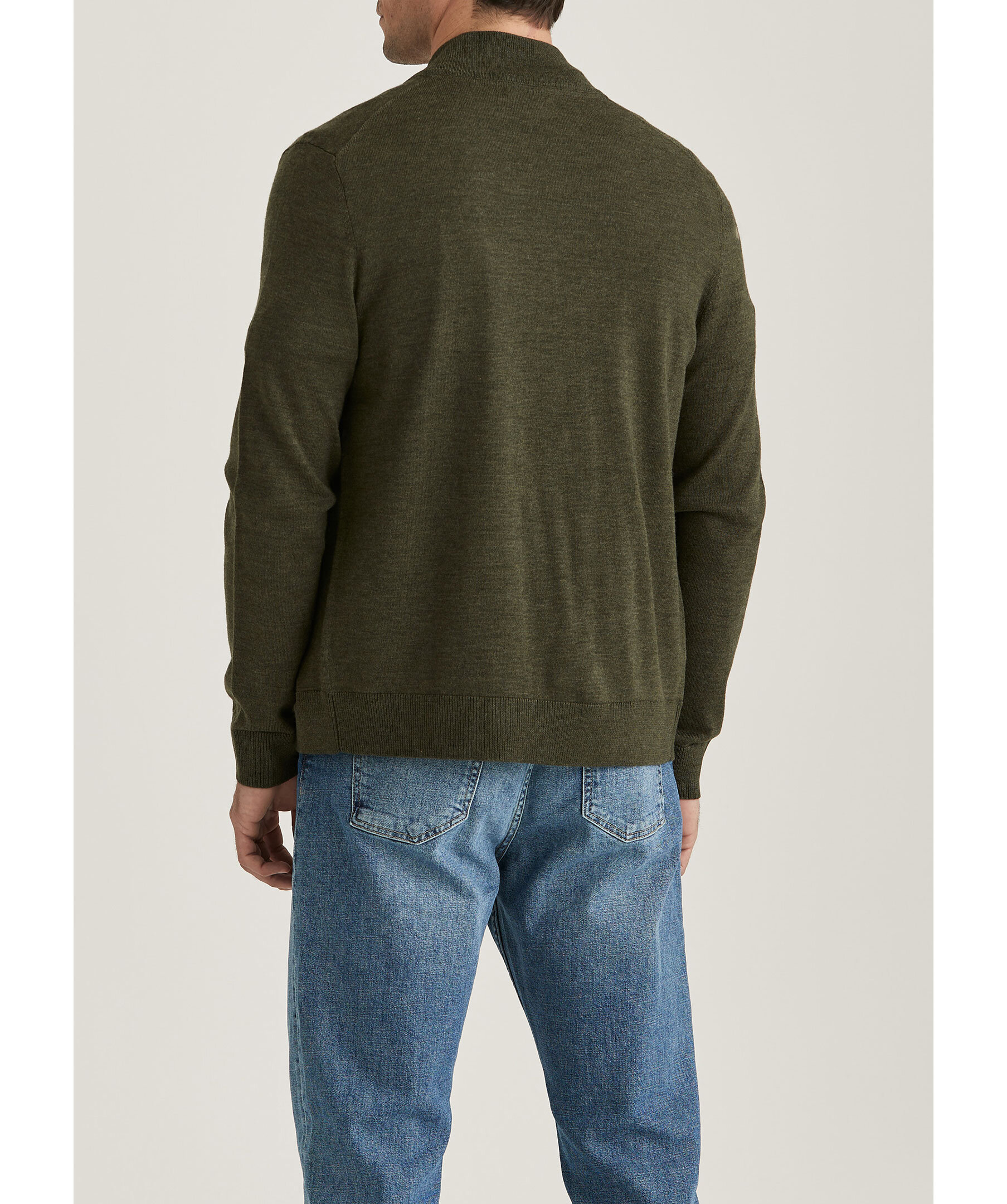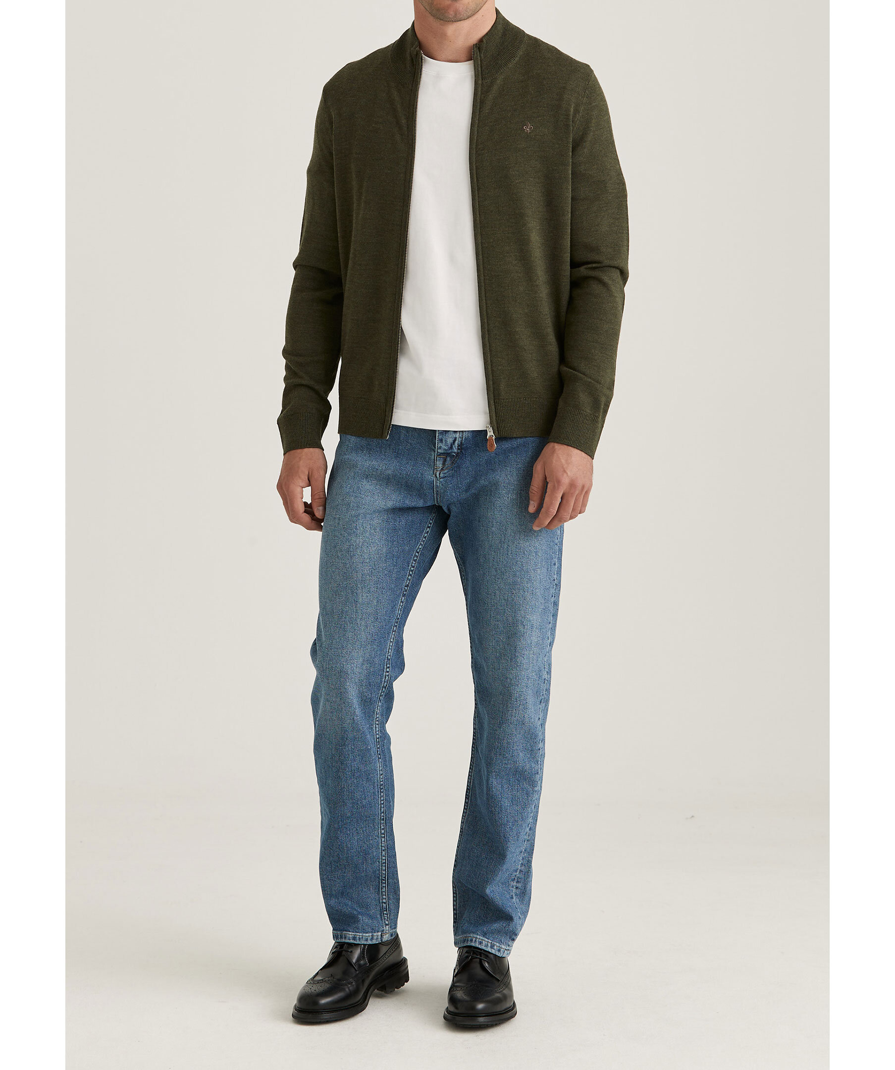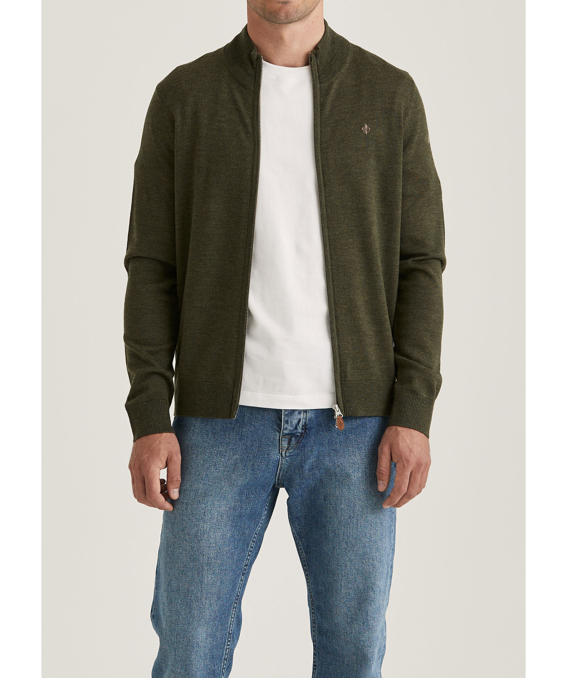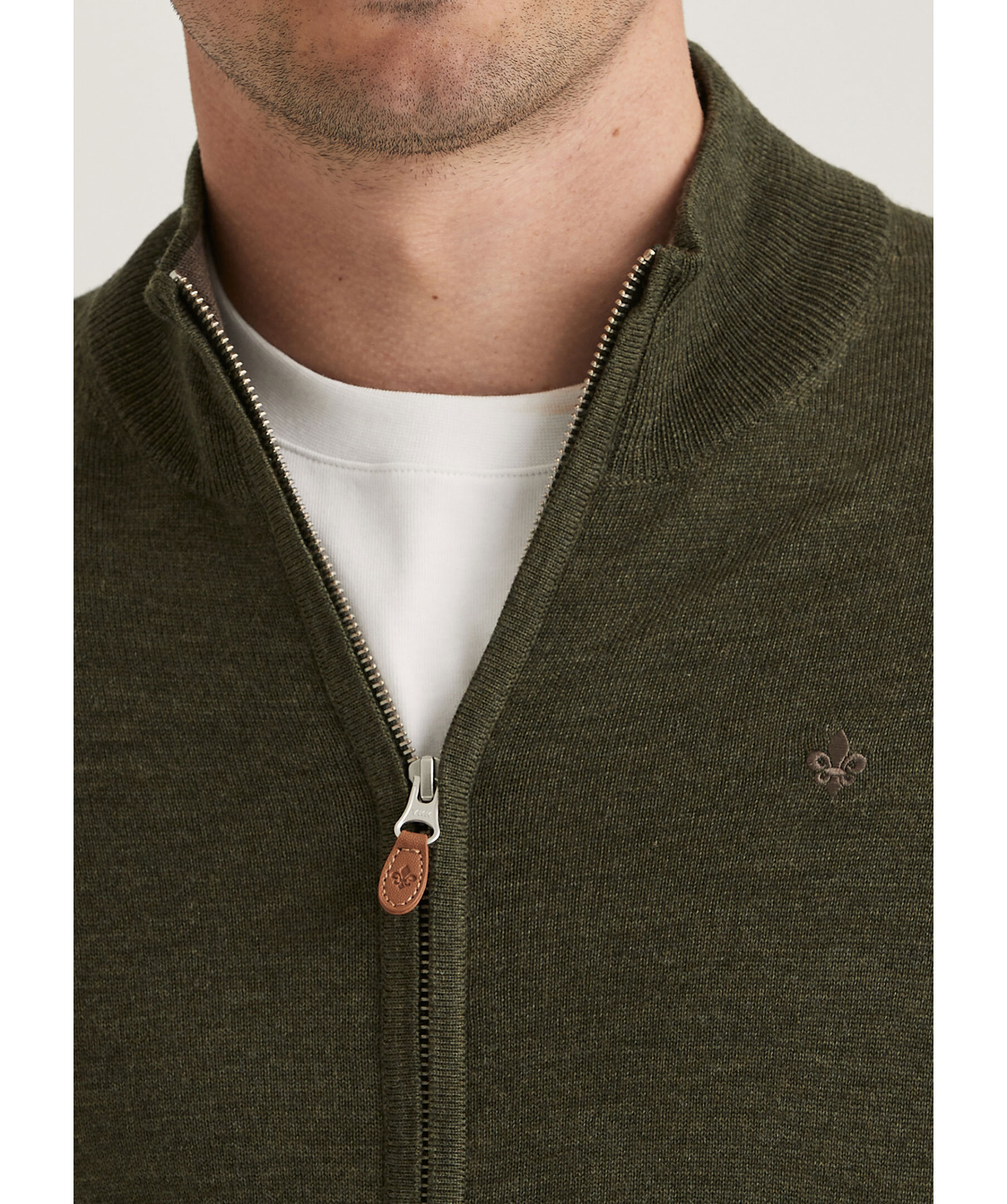 Olivgrön, finstickad cardigan från Morris. Stängs med dragkedja och har ribbstickad krage, ribbstickade muddar vid ärm- och plaggslut samt deras broderade signaturlilja på bröstet. Tillverkad i 100% merinoull.