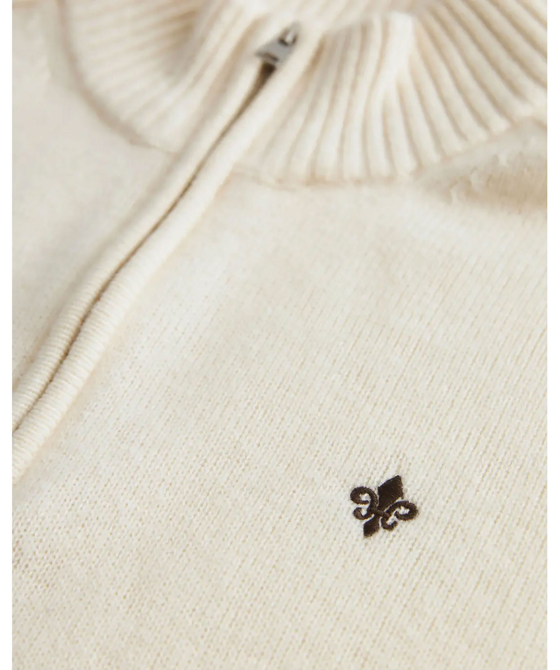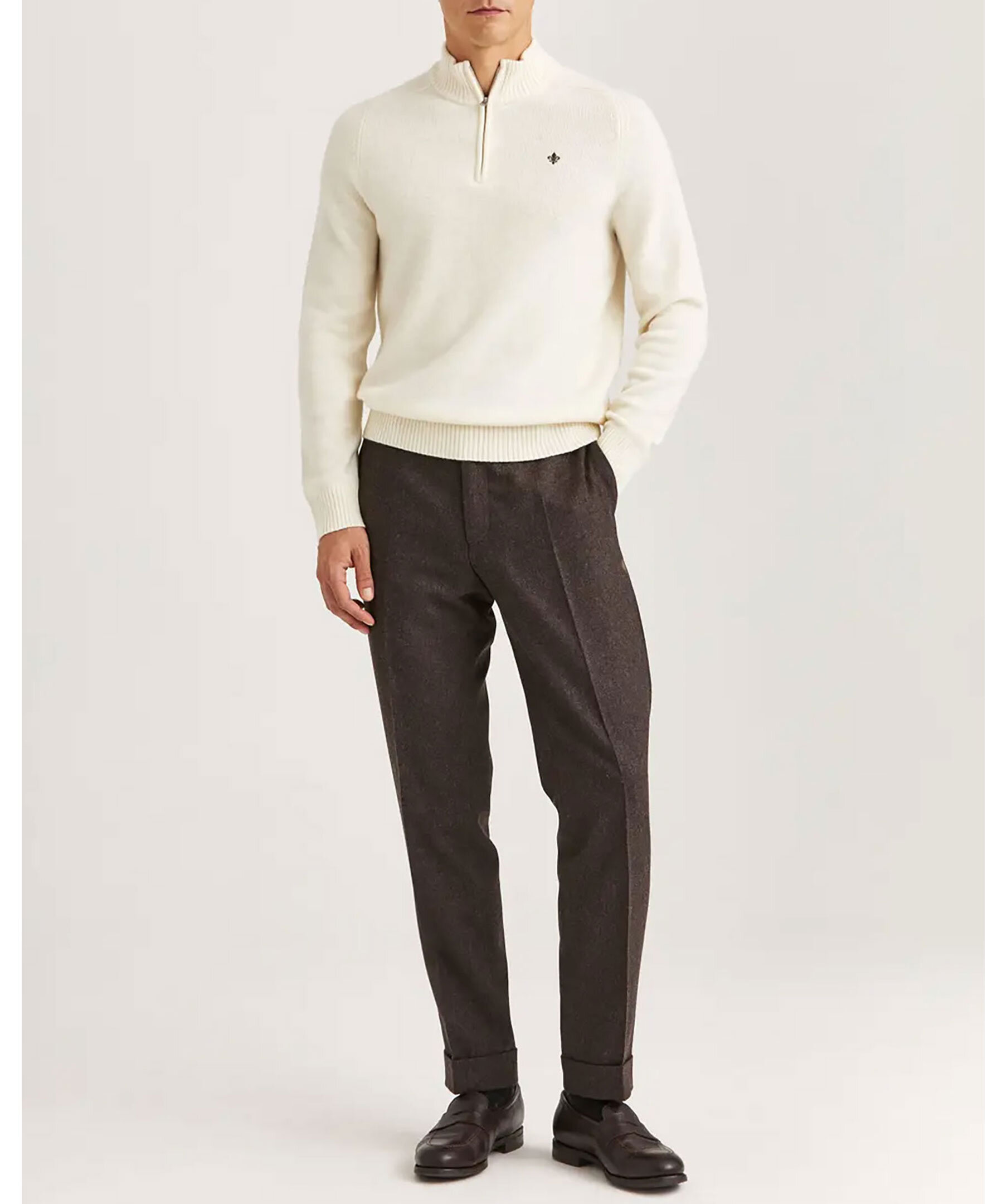 Stickad tröja från Morris med klassisk half zip och broderad lilja på bröstet. En mångsidig tröja i regular fit som passar lika bra till vardag som till kontoret. Tillverkad i 100 % mjuk merinoull.