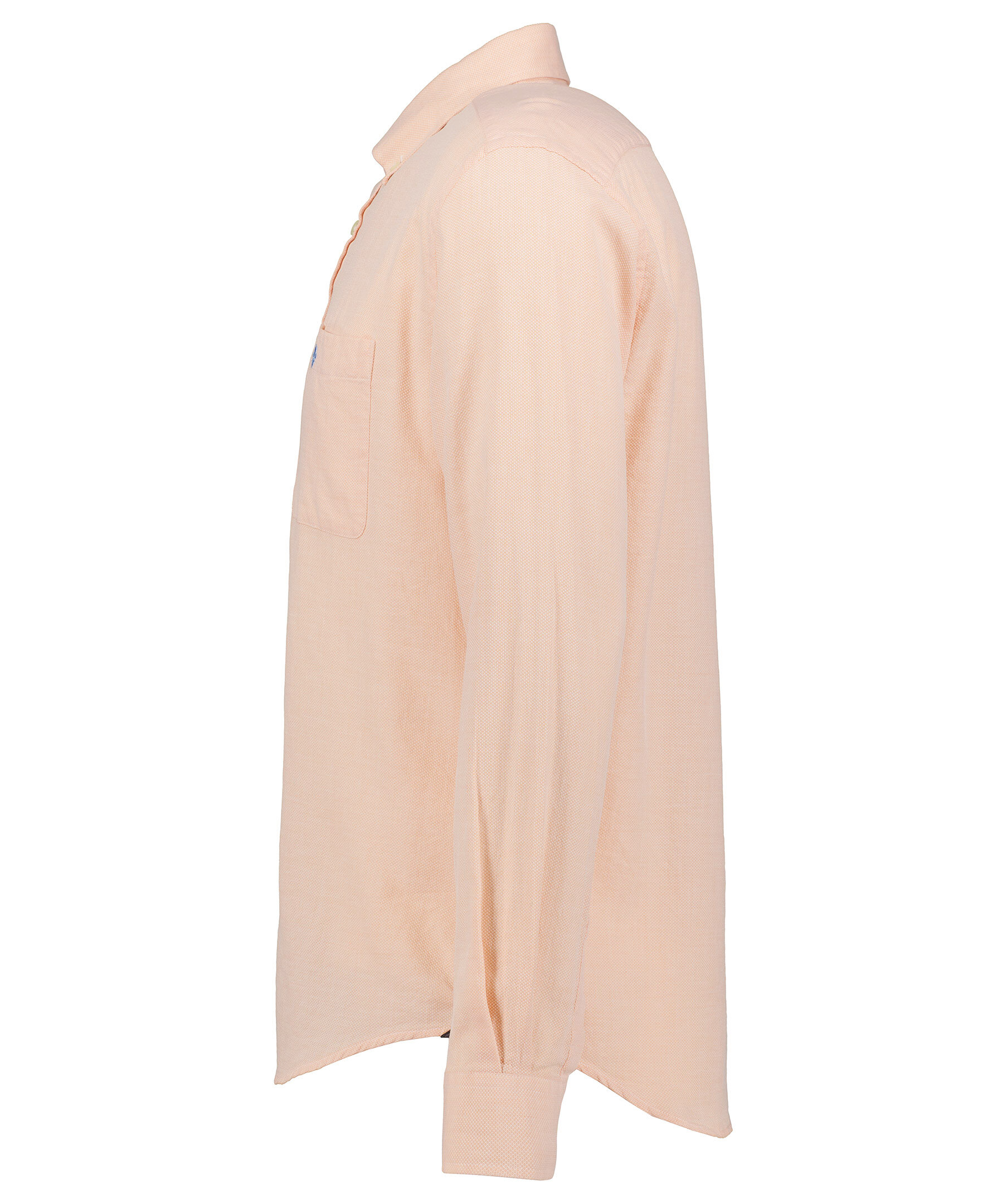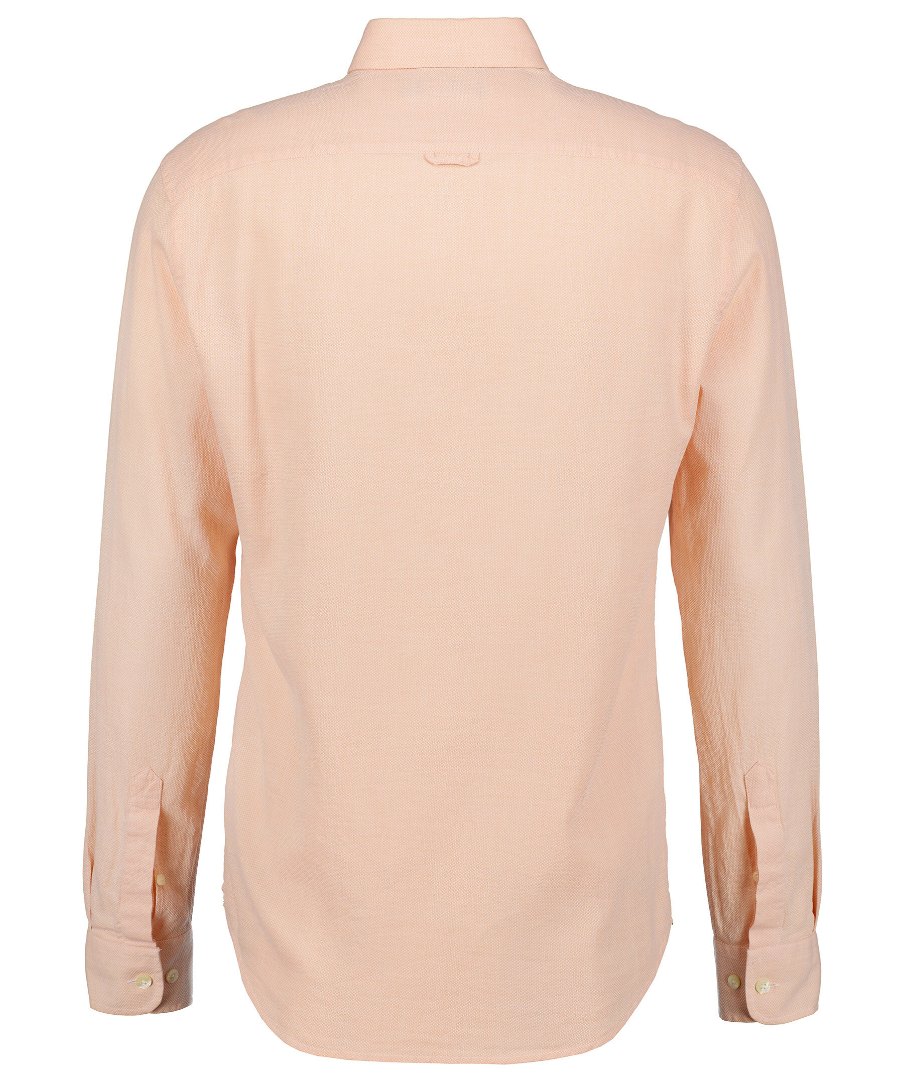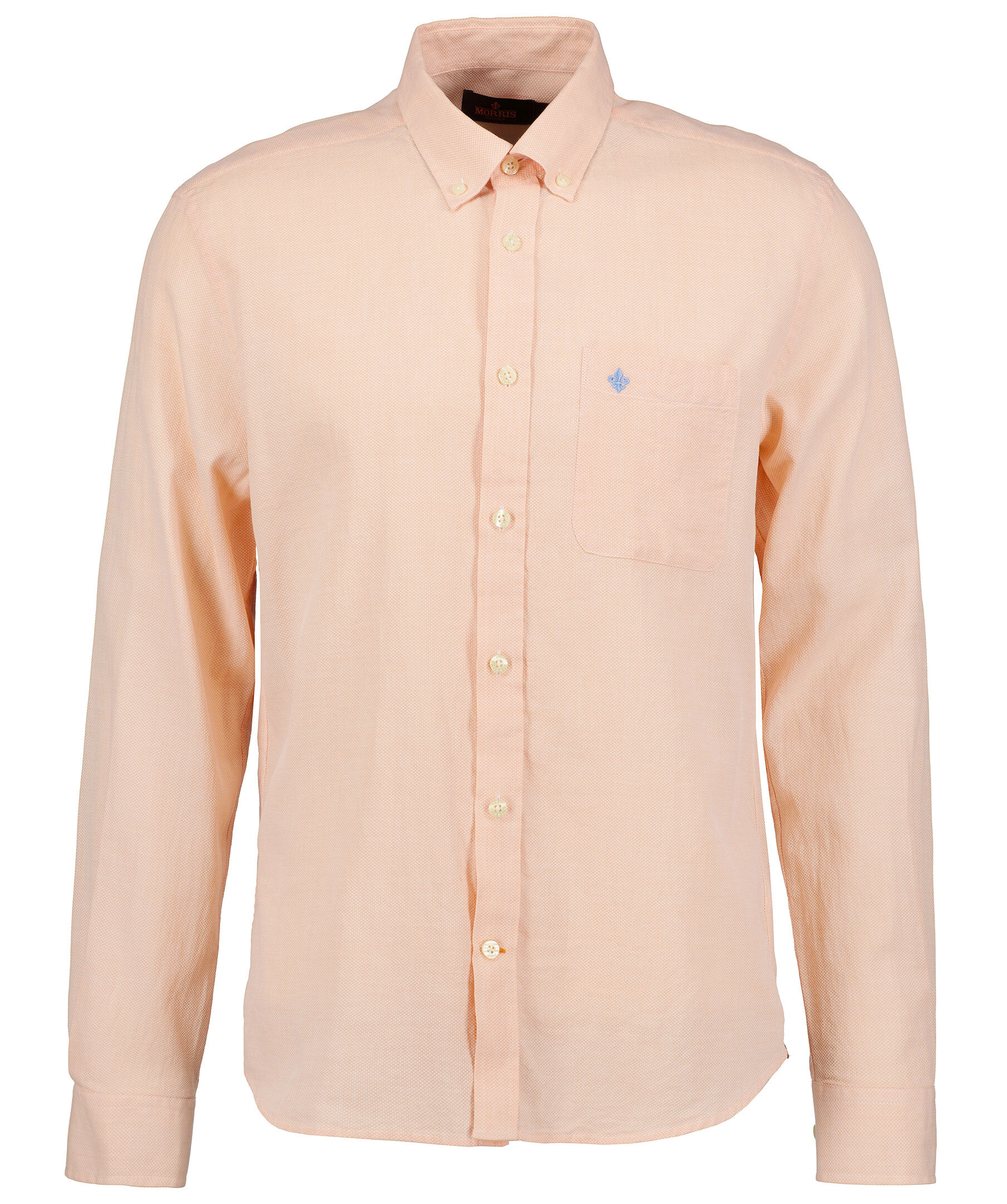 Aprikos skjorta i smal passform från Morris. Tillverkad i 100% bomull från Canclini, ett lätt och luftigt tyg med linneliknande egenskaper. Button down-krage, Morris signaturlilja broderad på bröstfickan och vita knappar hela vägen fram och på manschetterna.