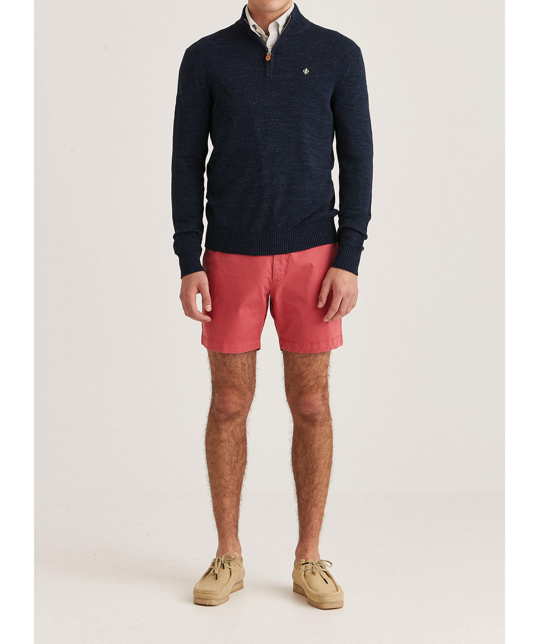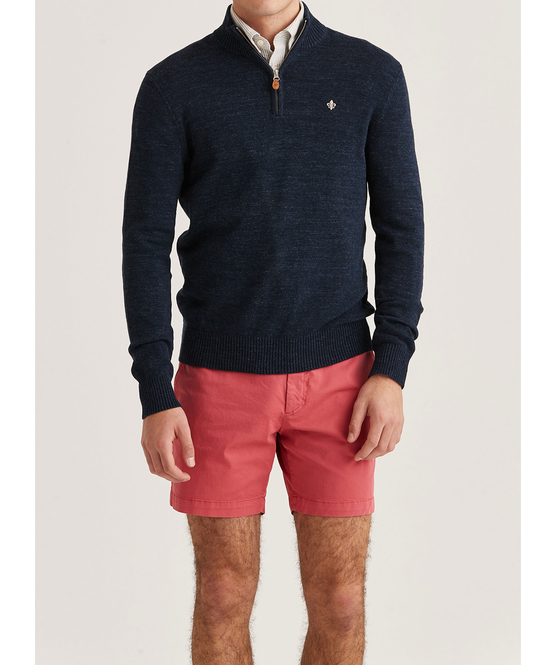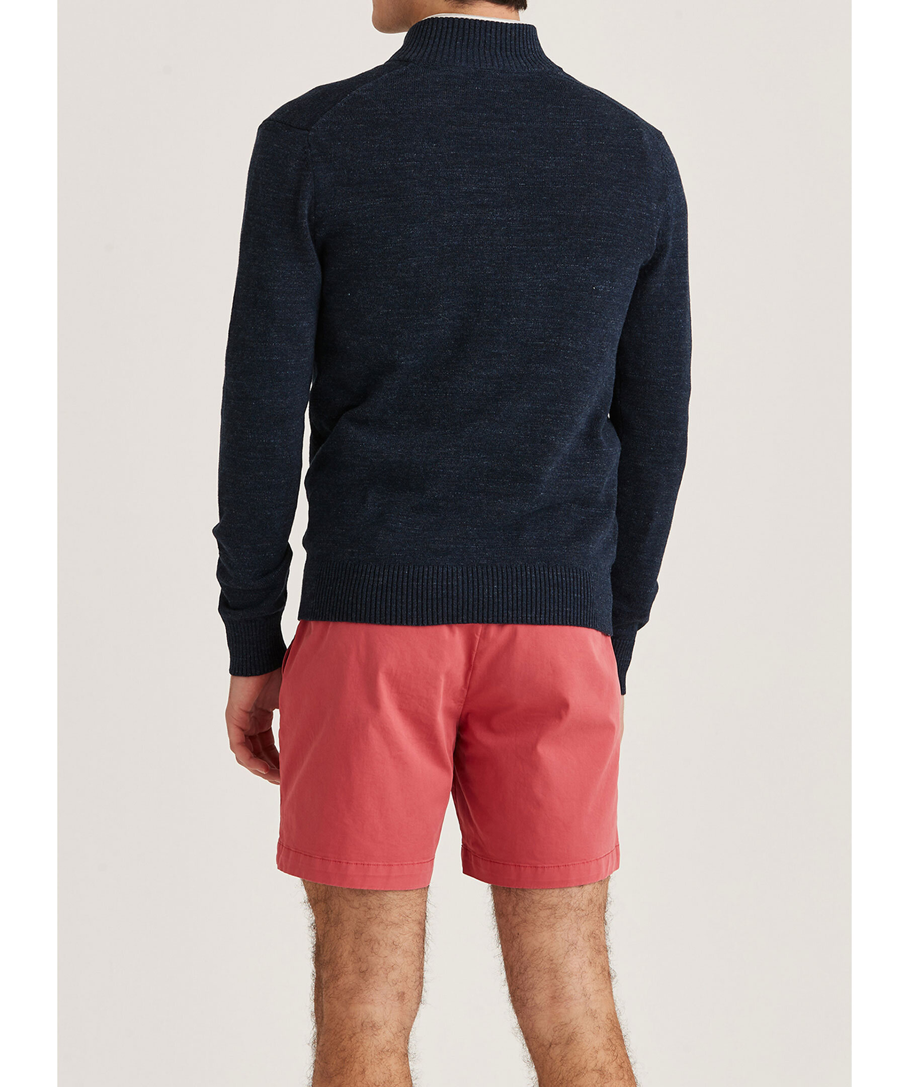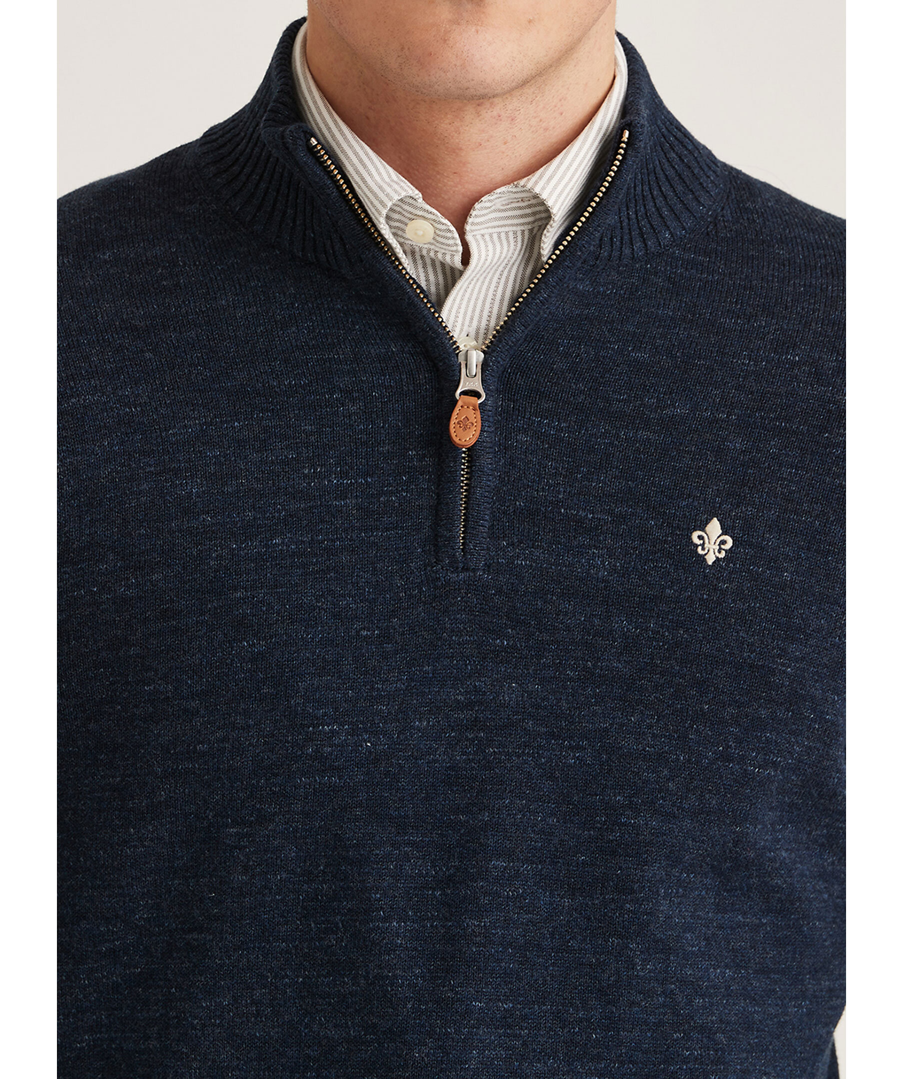 Melerad half zip i marinblått från Morris. Stickad i 100% bomull, ribbad polokrage och muddar vid ärm och plaggslut. Broderad fransk lilja på bröstet.