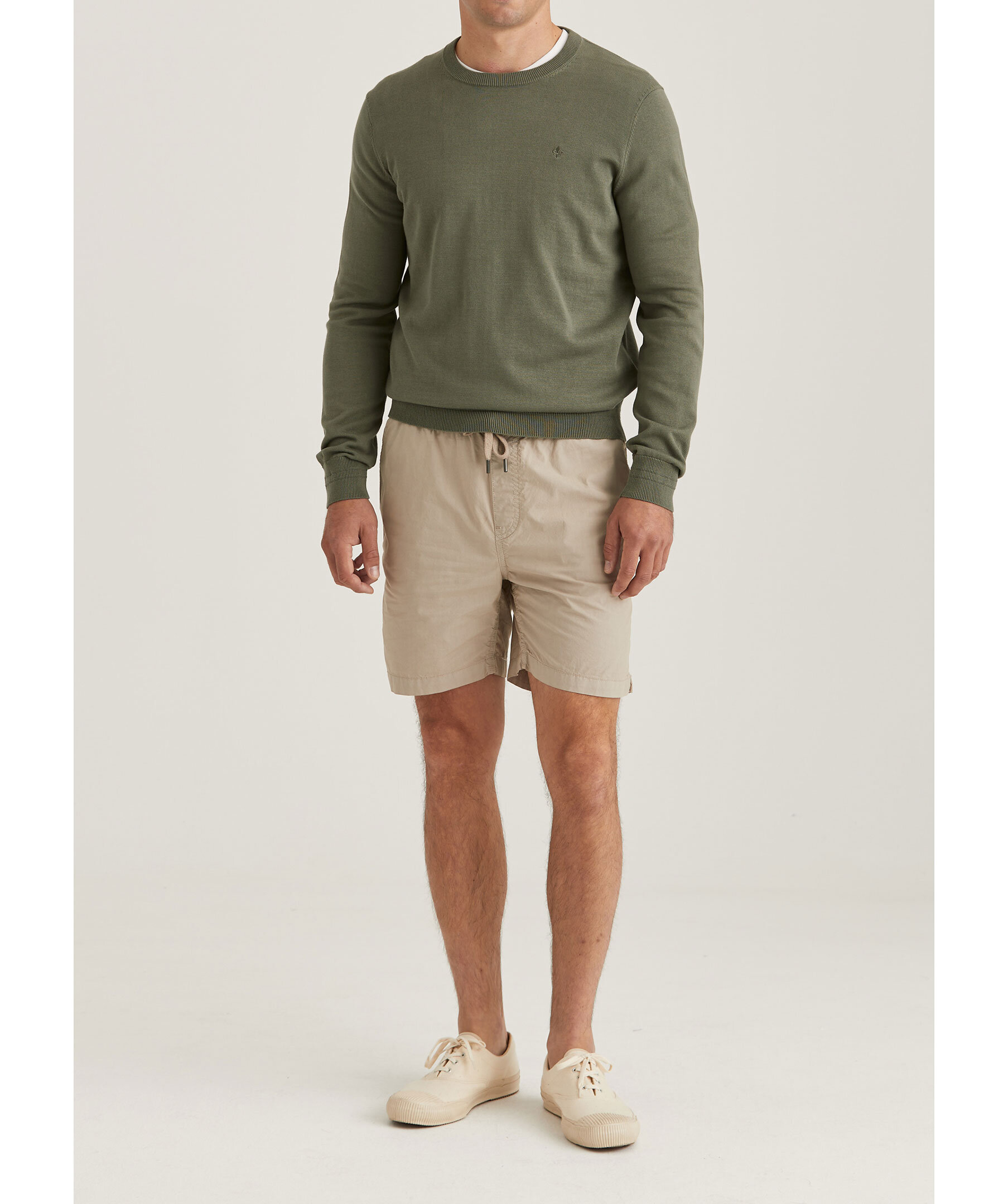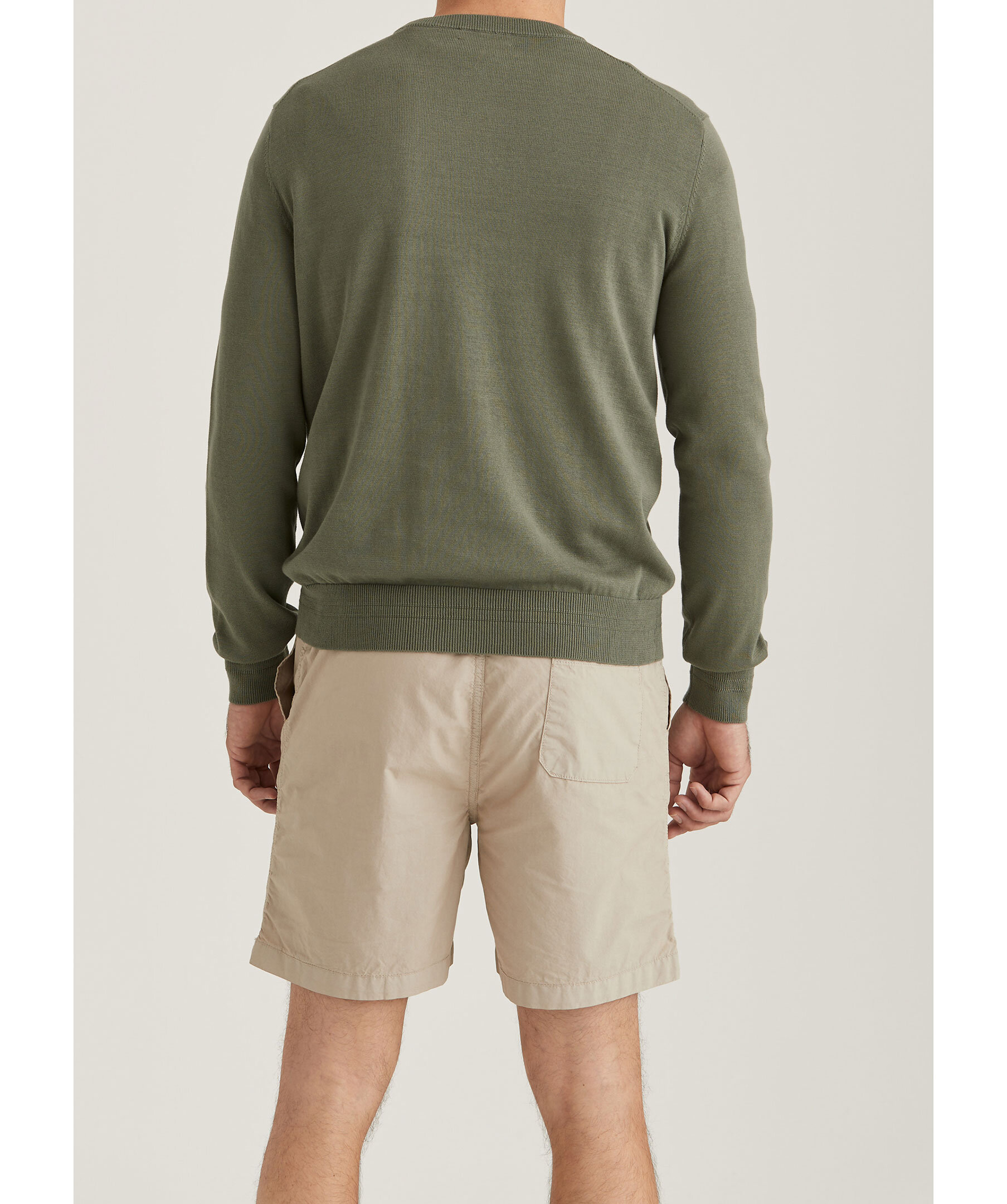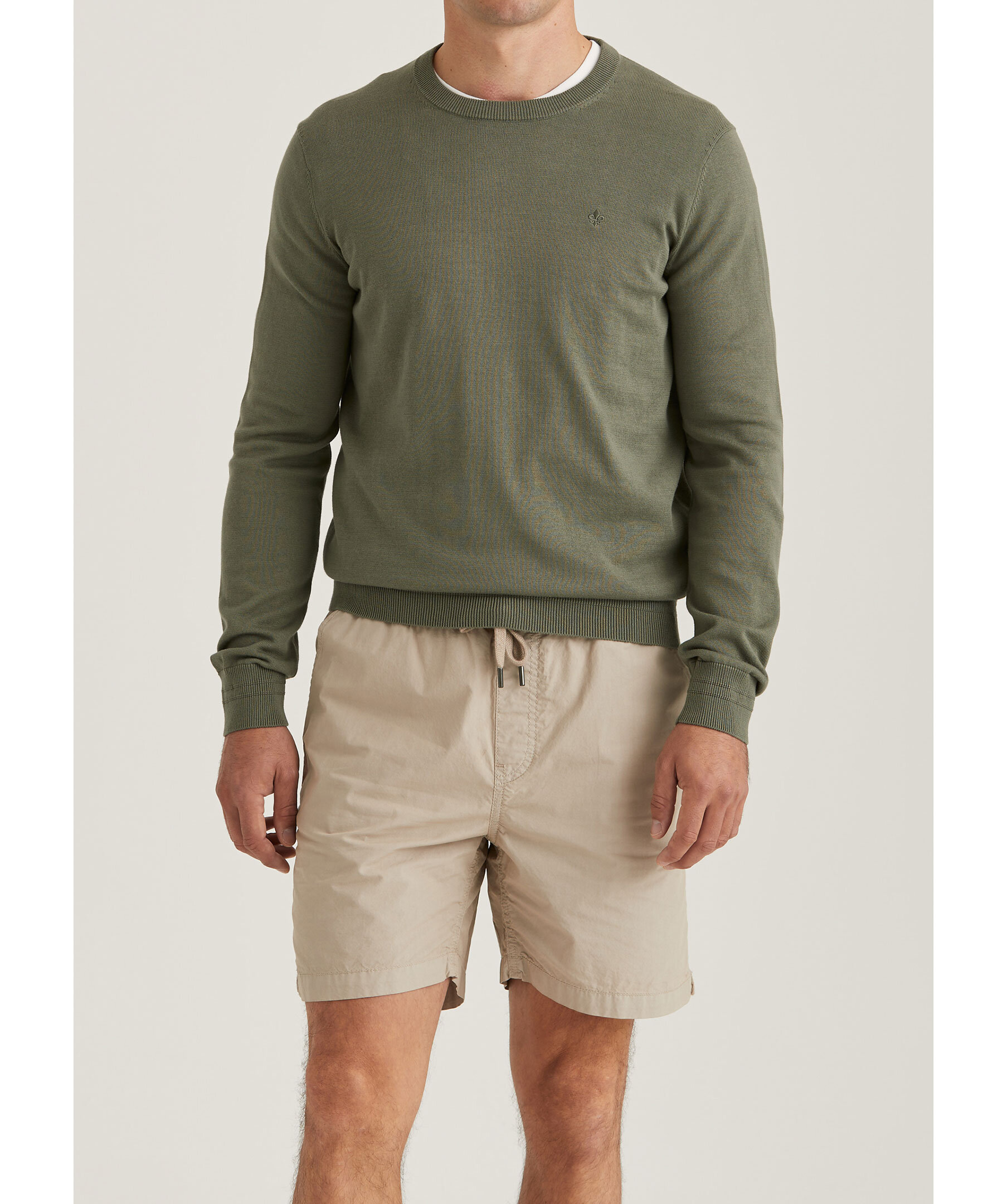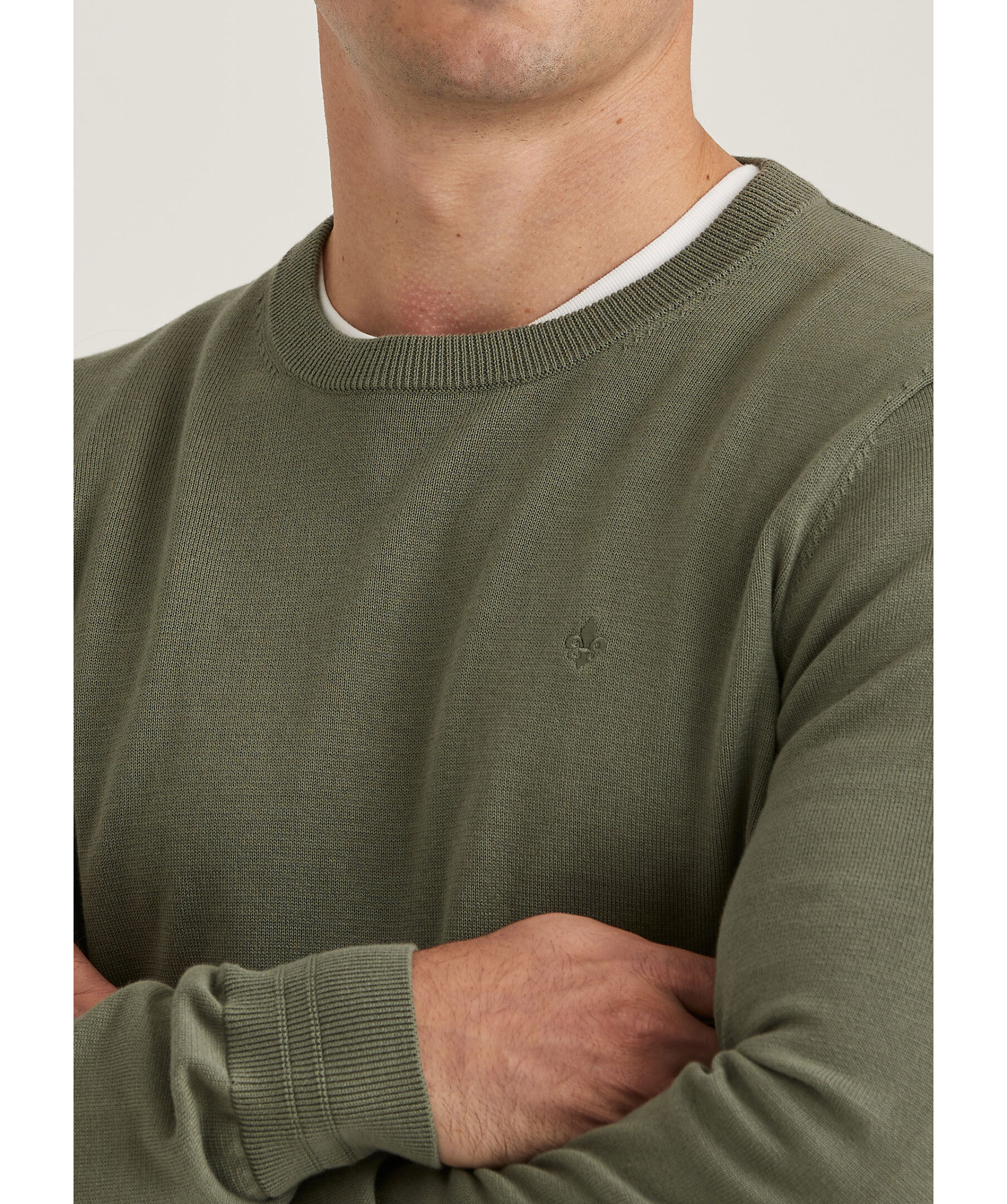 Olivgrön, finstickad tröja från Morris. Rundad, ribbstickad halsringning samt ribbstickade muddar vid ärm- och plaggslut. Broderad Morris signaturlilja på bröstet. Tillverkad i 100% bomull. Slim fit.