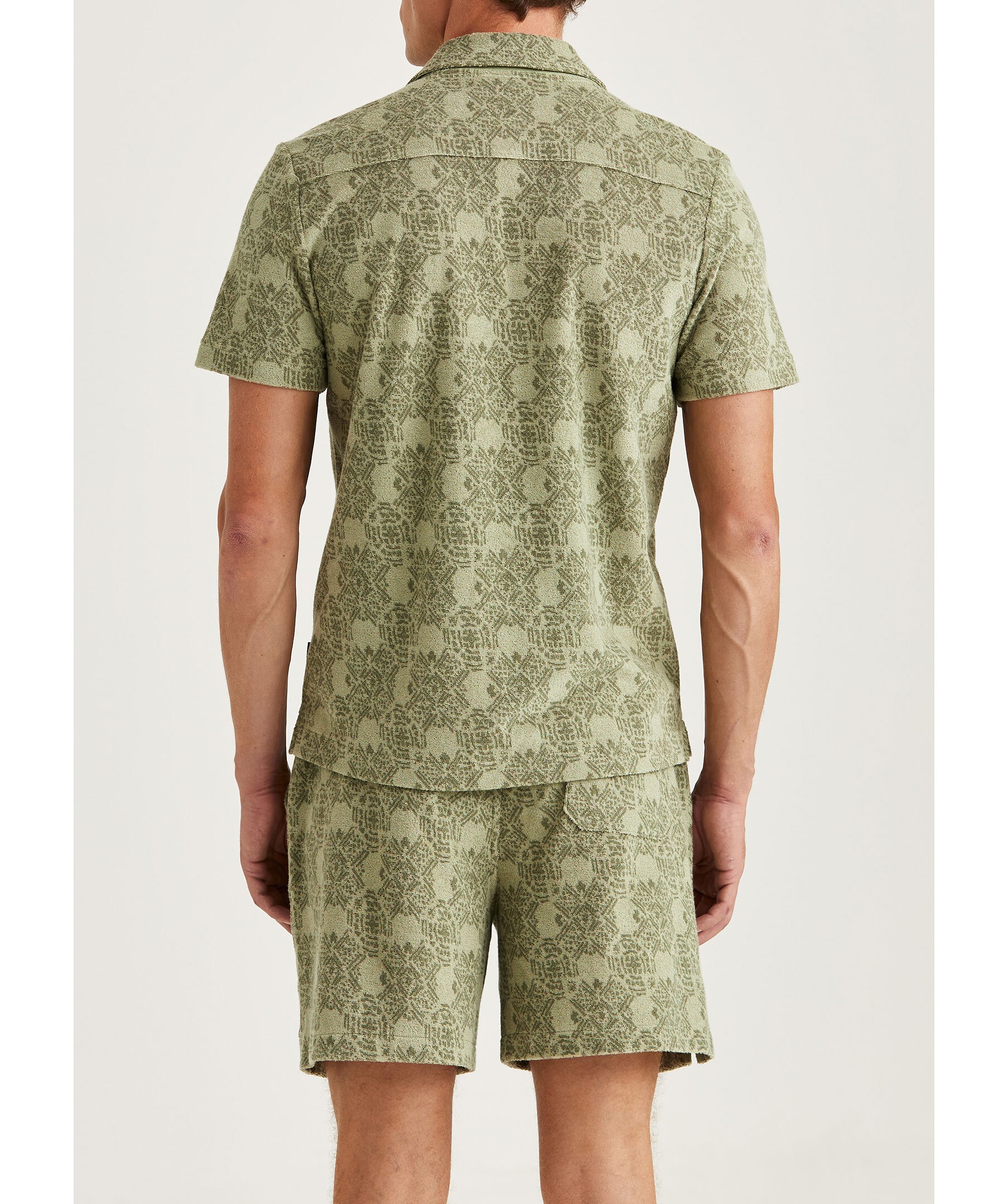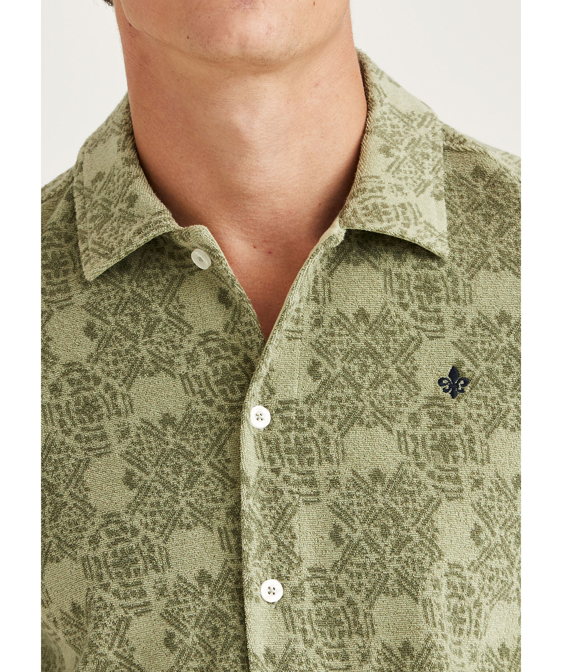 Grön, mönstrad och kortärmad skjorta i en mjuk frottékvalitet från Morris. Broderad logotyp på bröstet. Tillverkad i bomull.