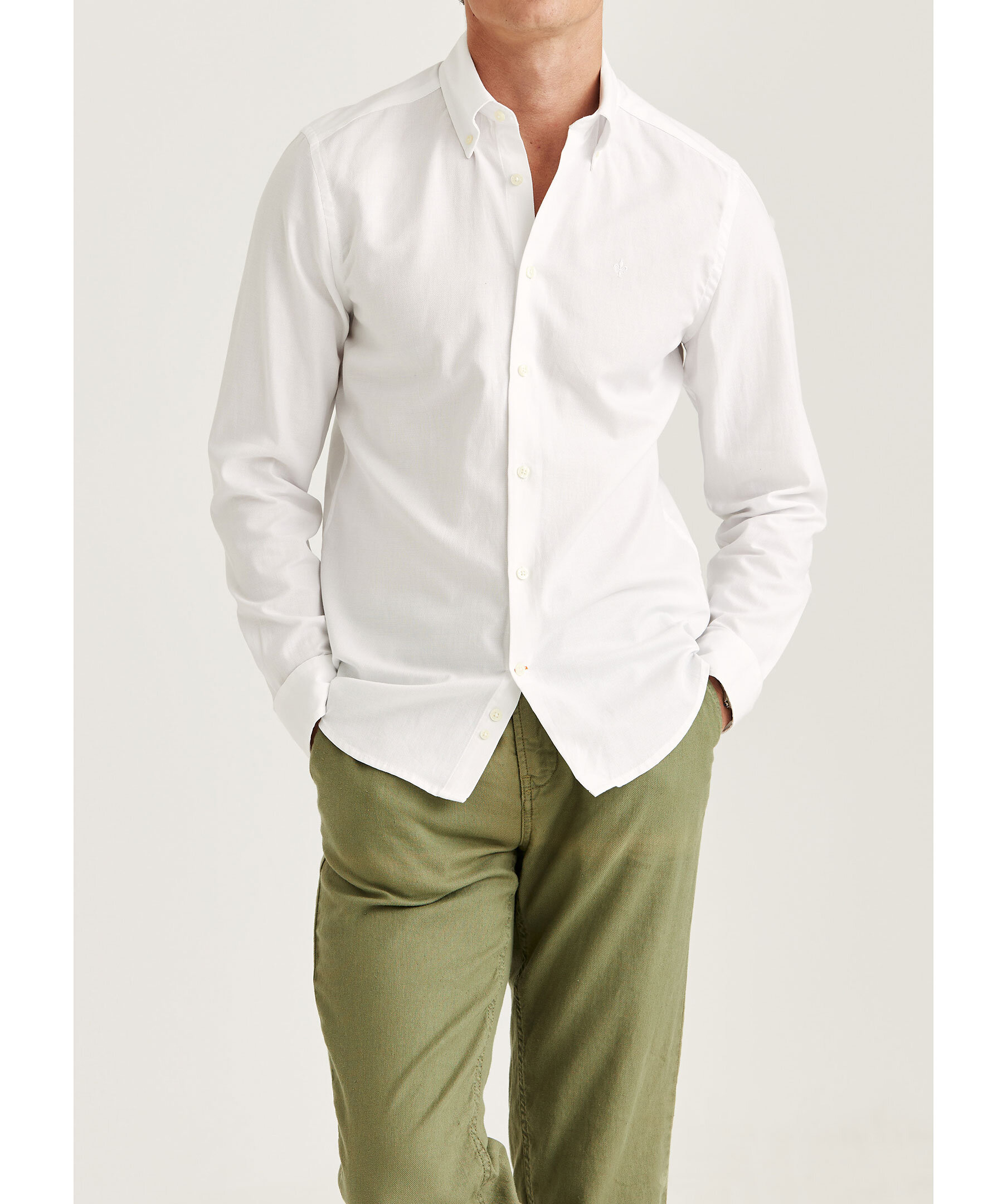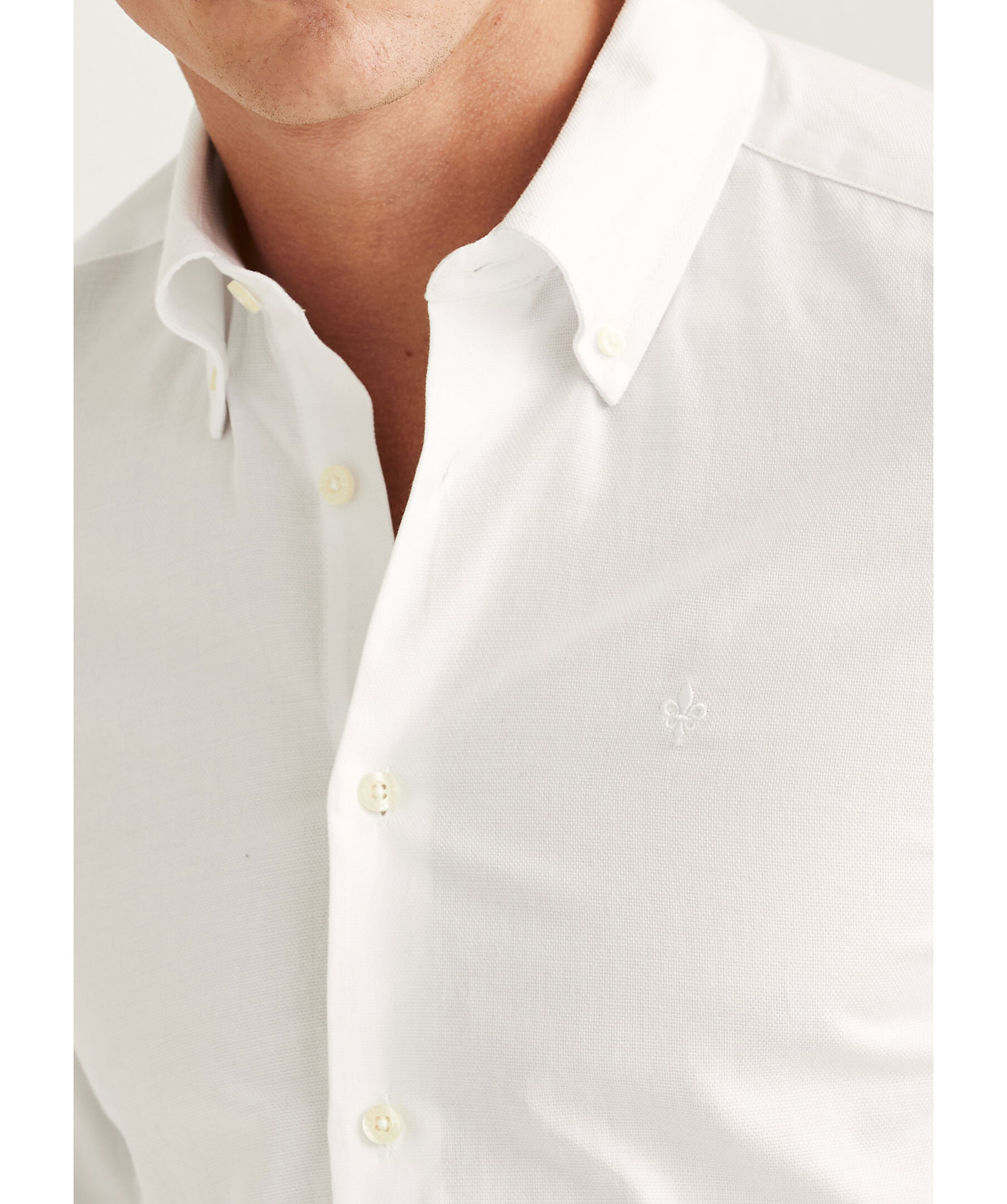 Vit, långärmad skjorta från Morris. Skjortan har subtil struktur, button-down krage, enkel samt lätt rundad manschett med två knappar och broderad signaturlilja på bröstet. Tillverkad i bomull.
