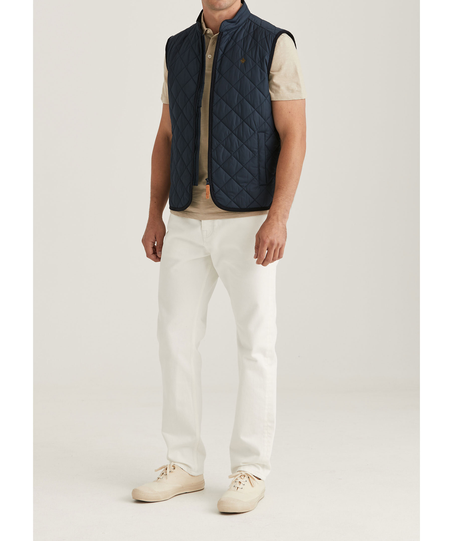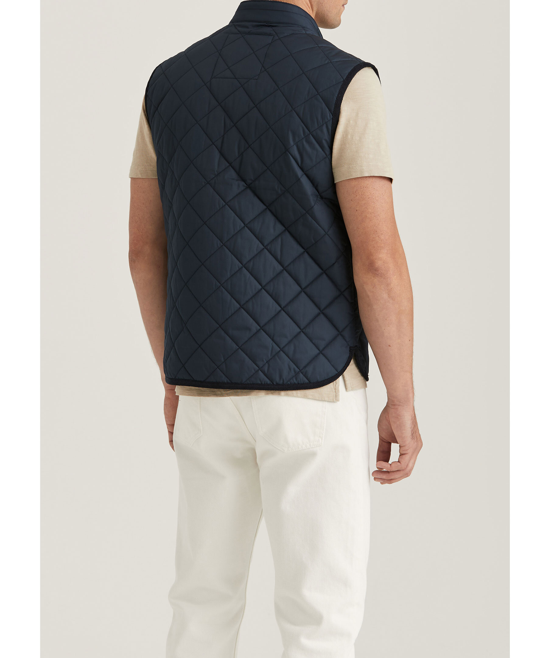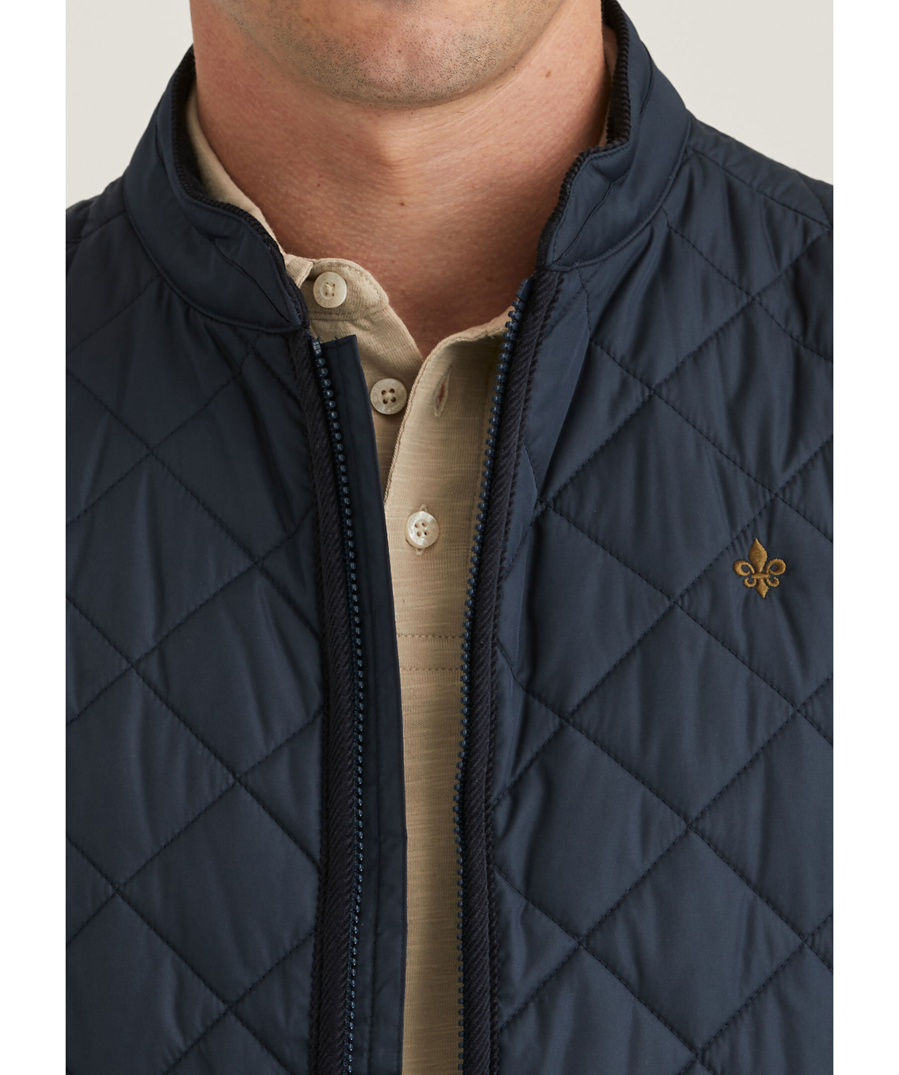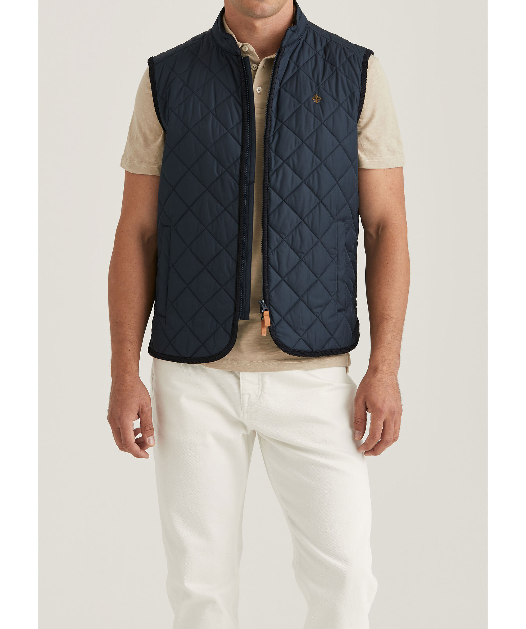 Marinblå, quiltad väst från Morris. Västen stängs med tvåvägsdragkedja fram och har två sidfickor samt en broderad lilja på bröstet. Tillverkad i polyester.