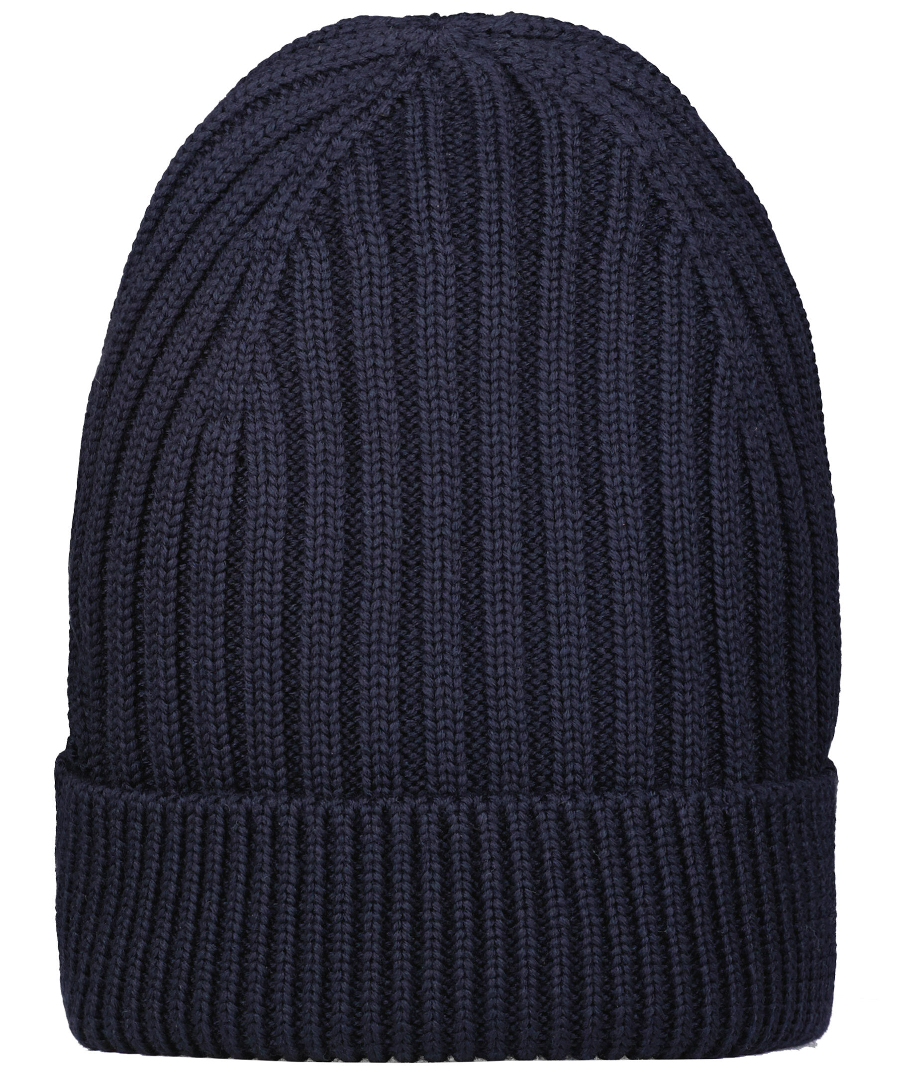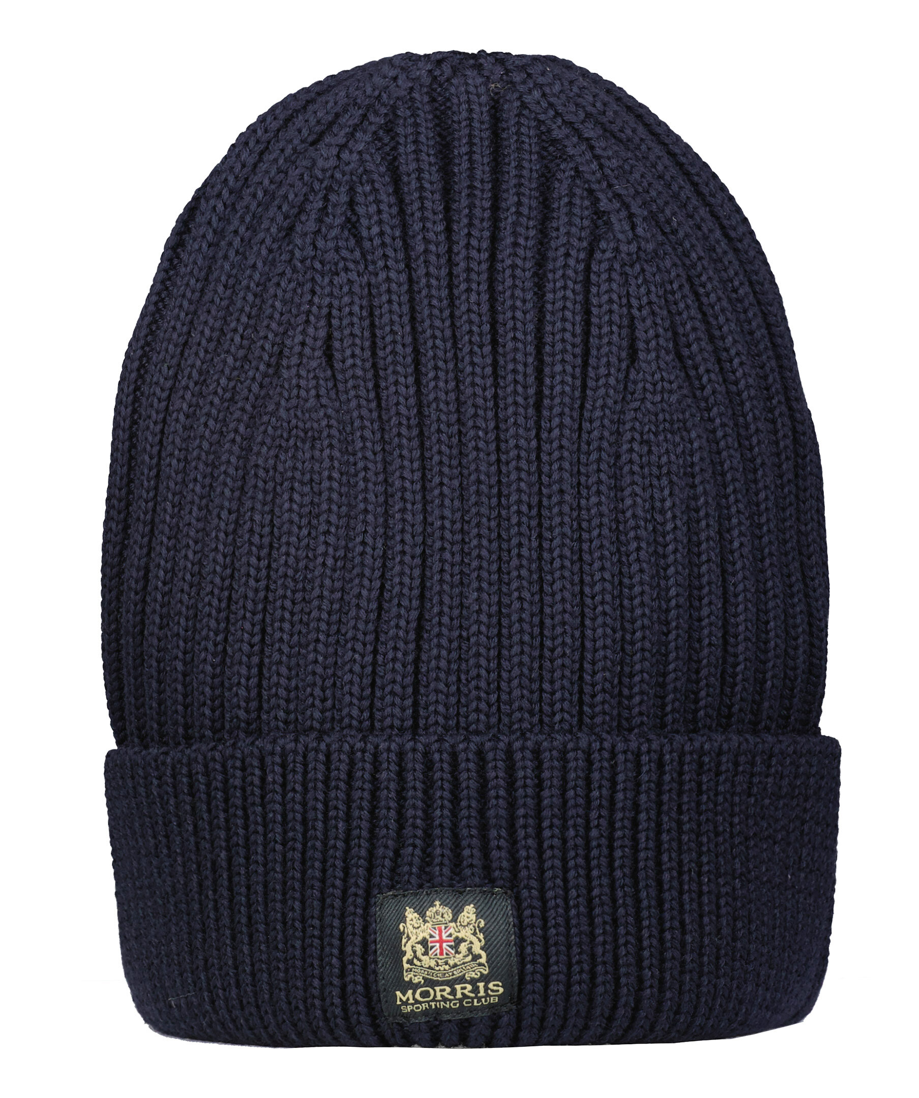 Marinblå ribbstickad mössa från Morris. Tillverkad i 100% merinoull, har en uppvikt kant och patch fram med logga.