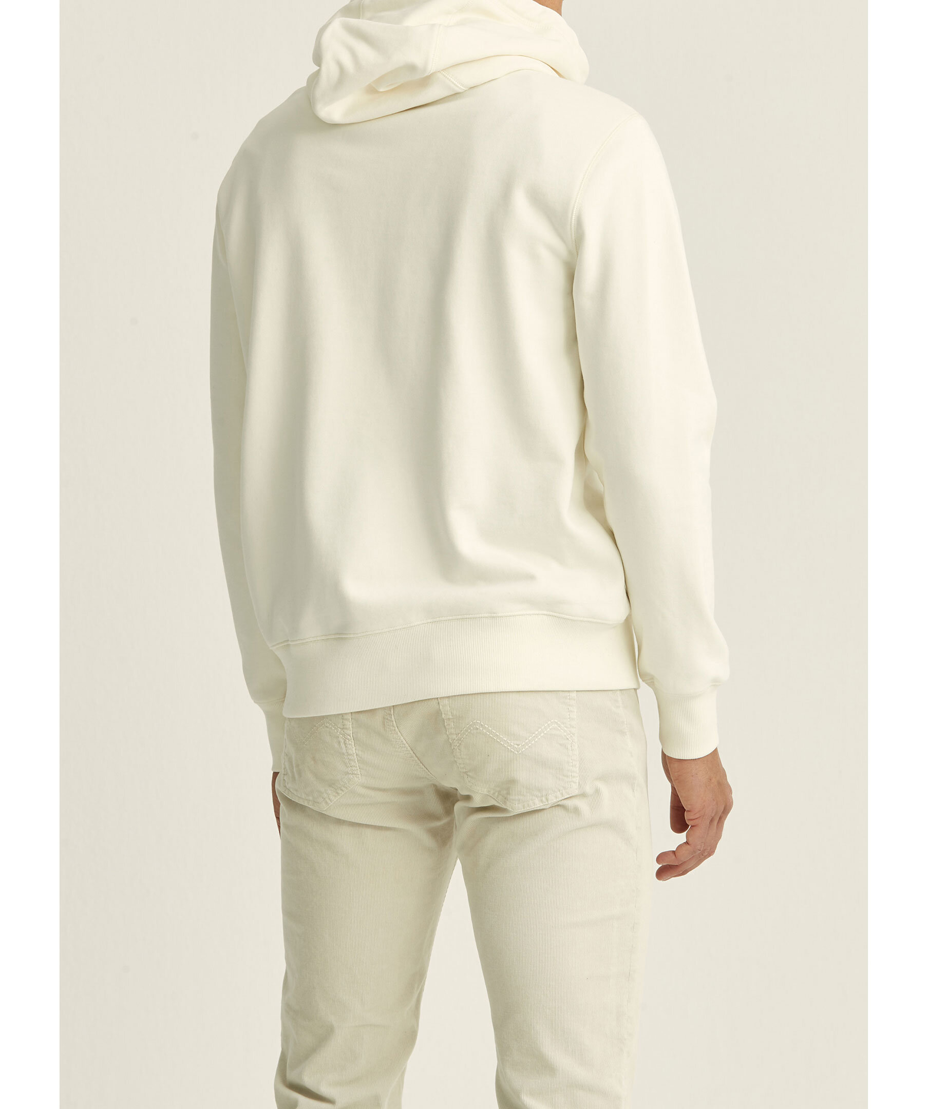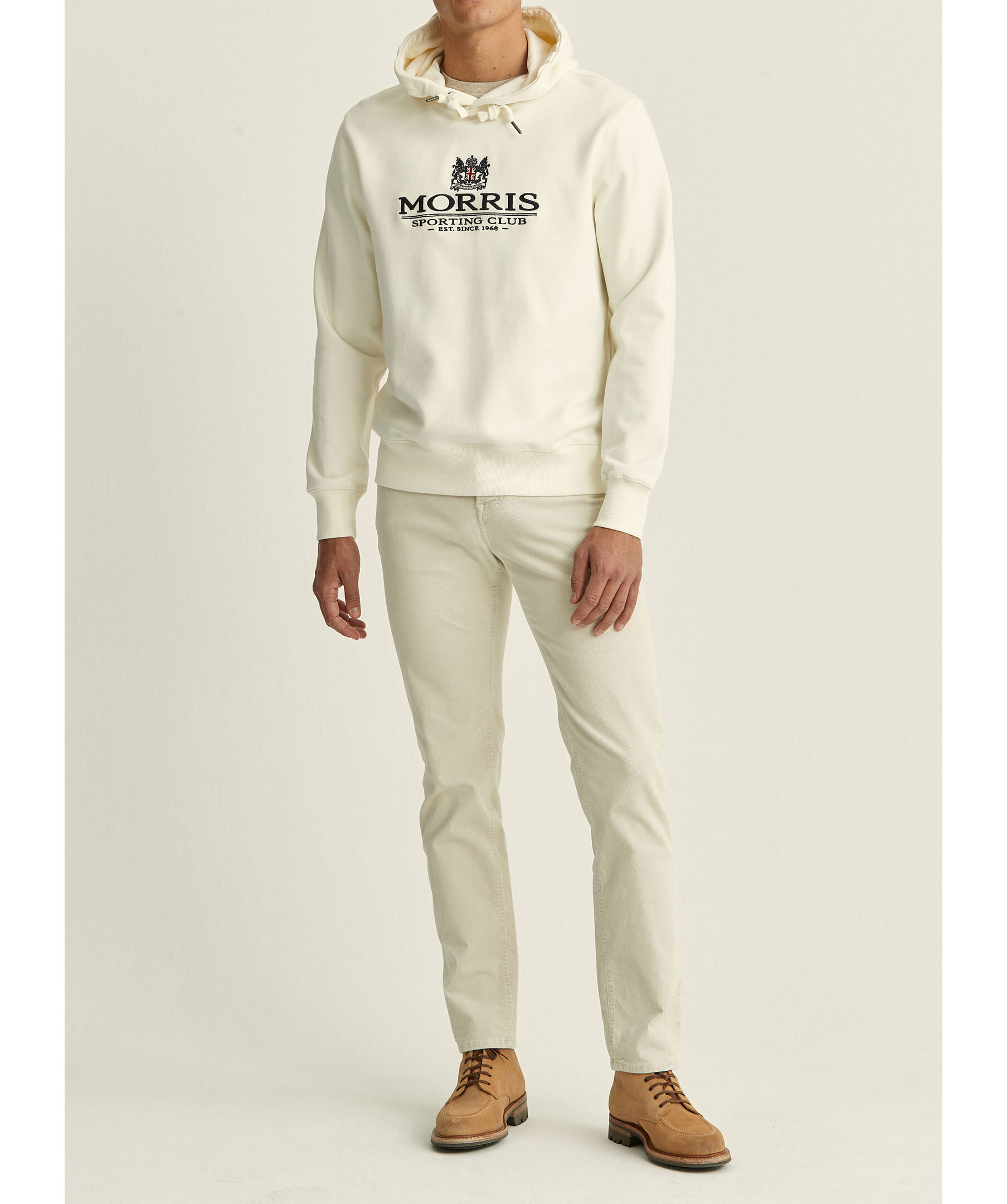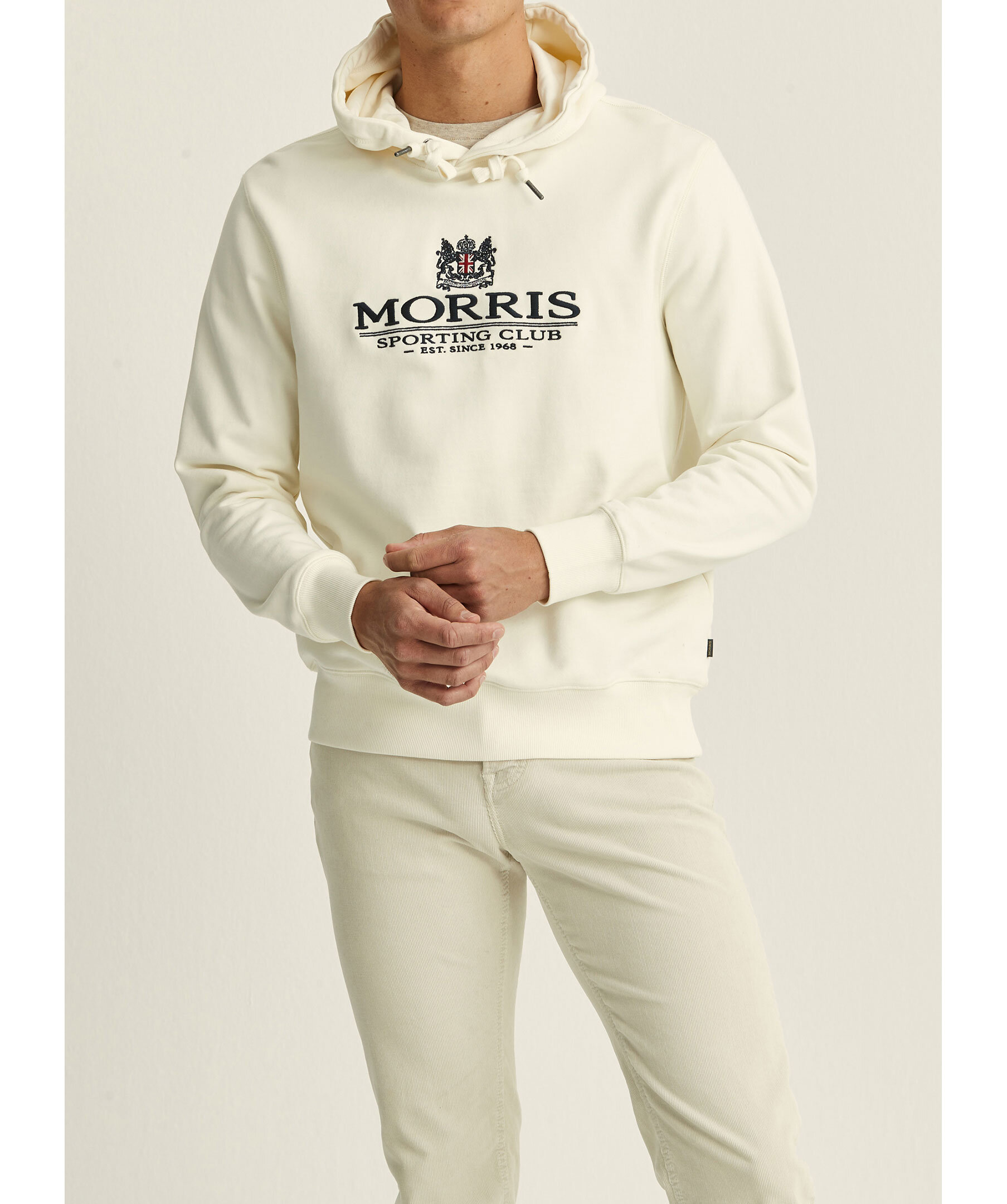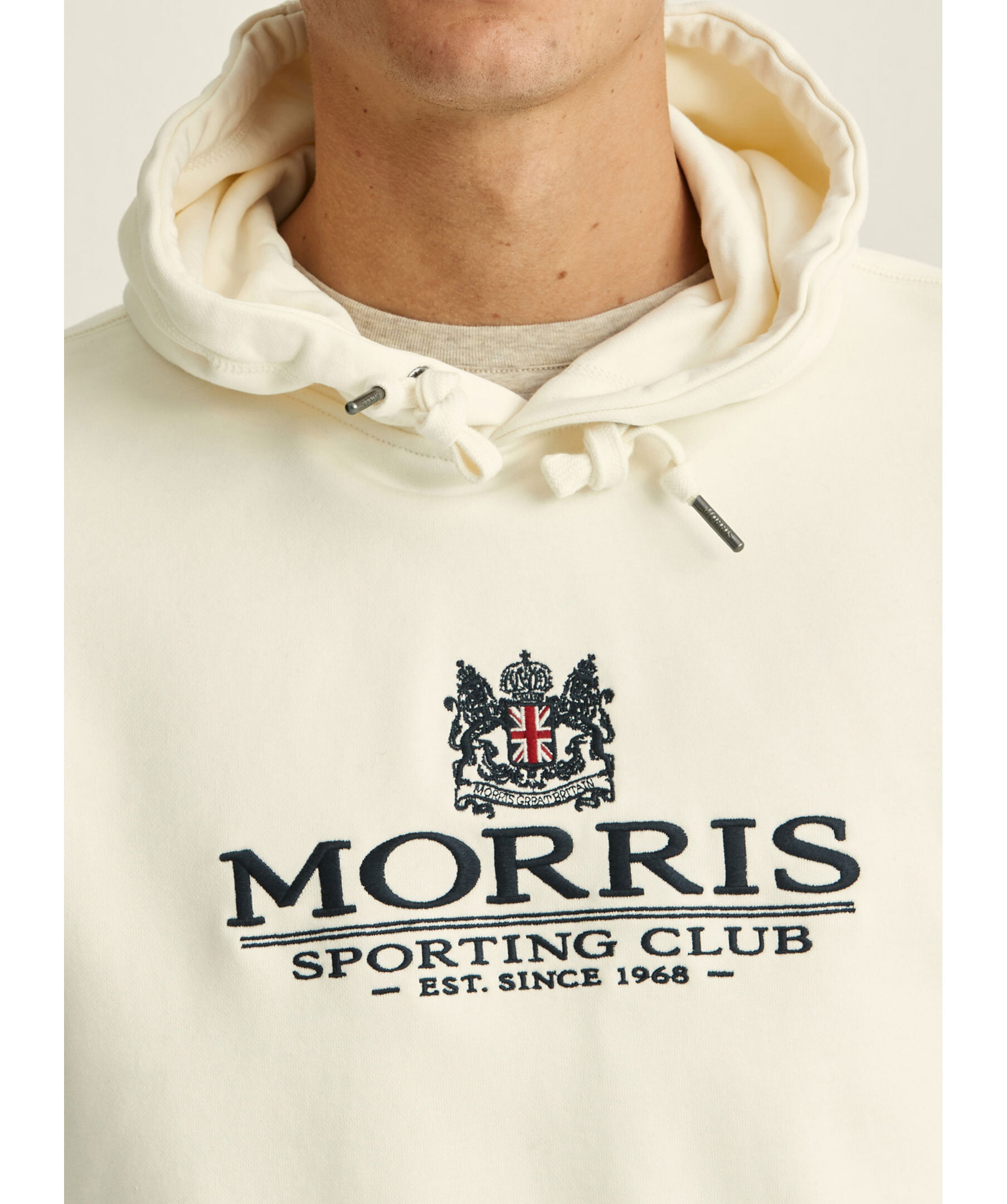 Vit hoodie med en broderad logga över hela bröstet från Morris. Tillverkad i bomullsjersey, har en borstad insida, avslappnad passform och nedhasad axel. Modellen är 189 cm och bär storlek M.