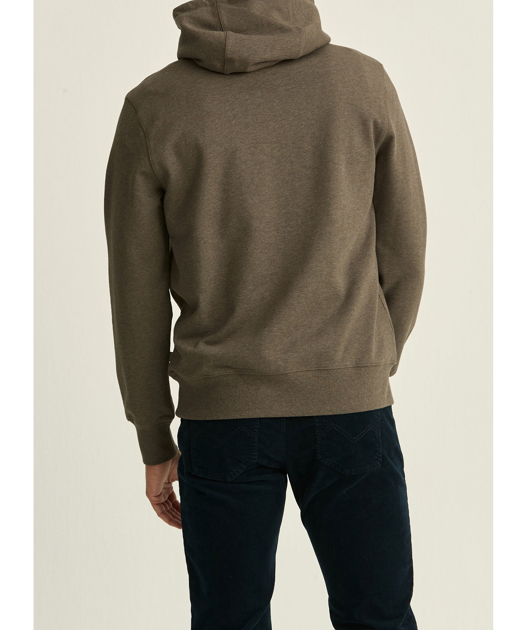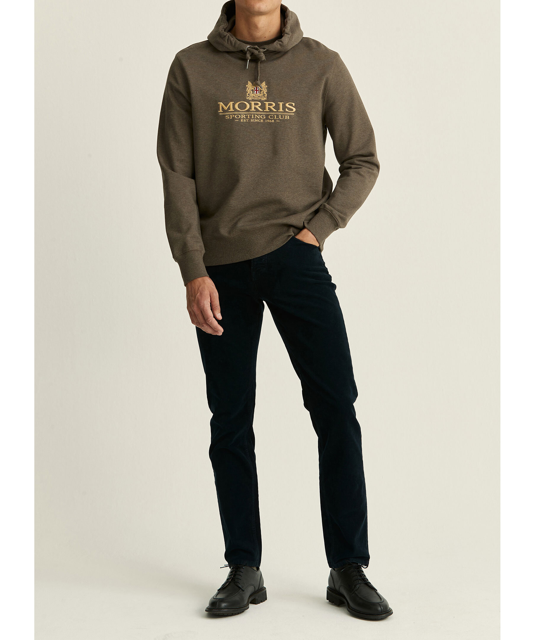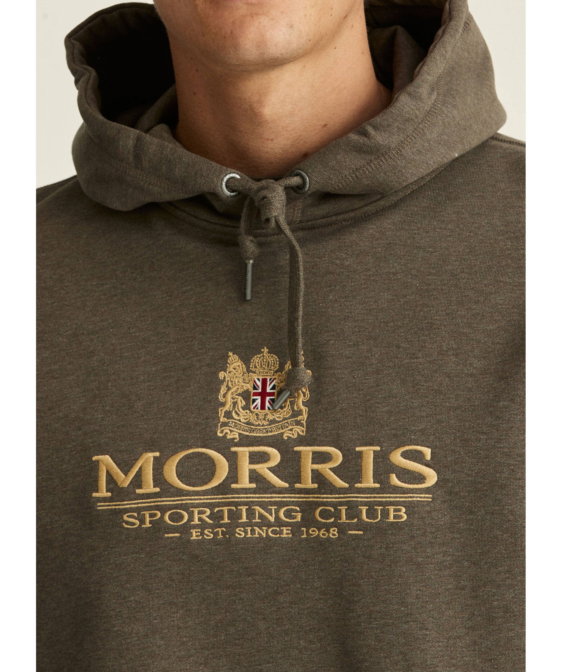 Brun melerad hoodie med en broderad logga över hela bröstet från Morris. Tillverkad i bomullsjersey, har en borstad insida, avslappnad passform och nedhasad axel. Modellen är 189 cm och bär storlek M.