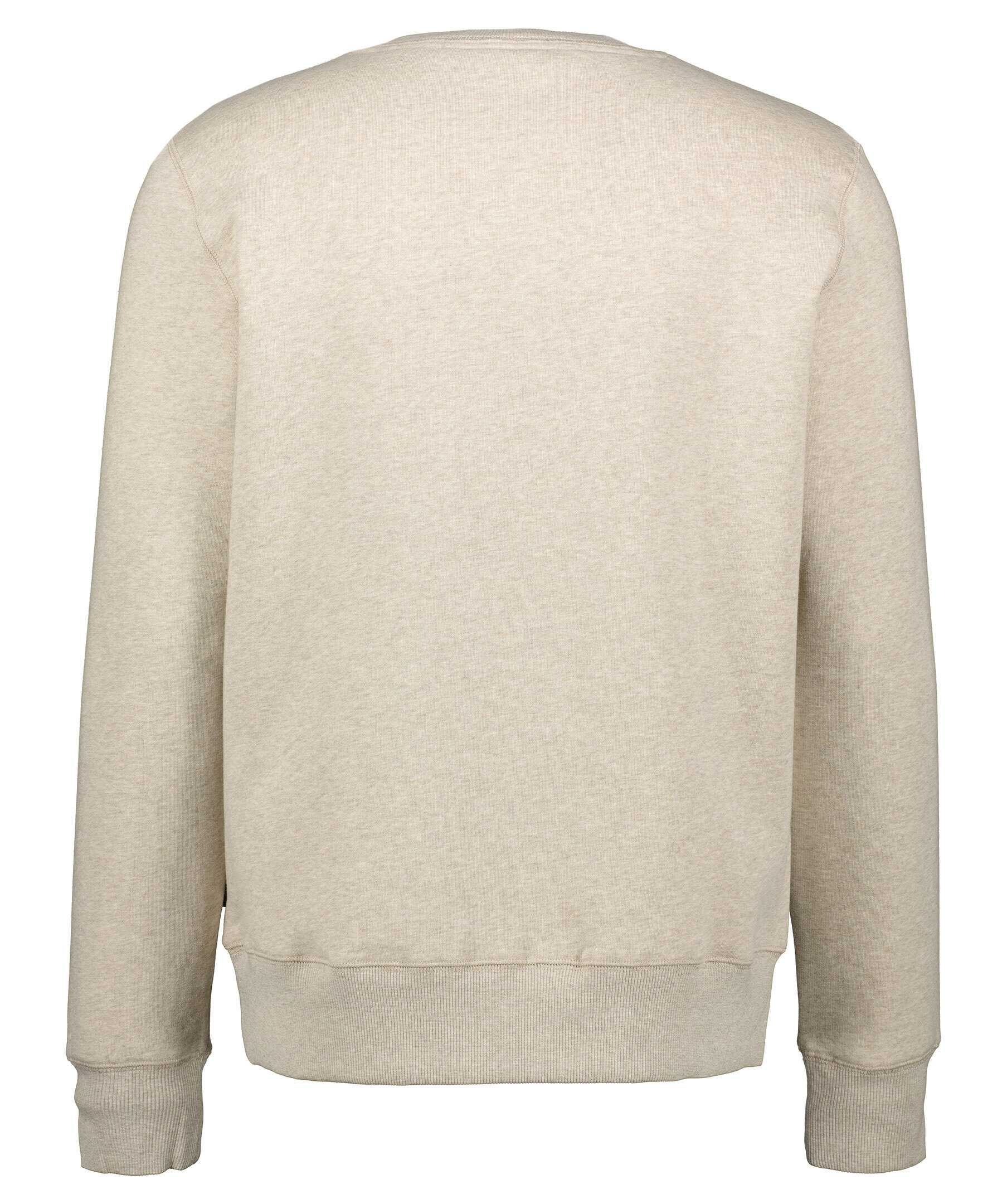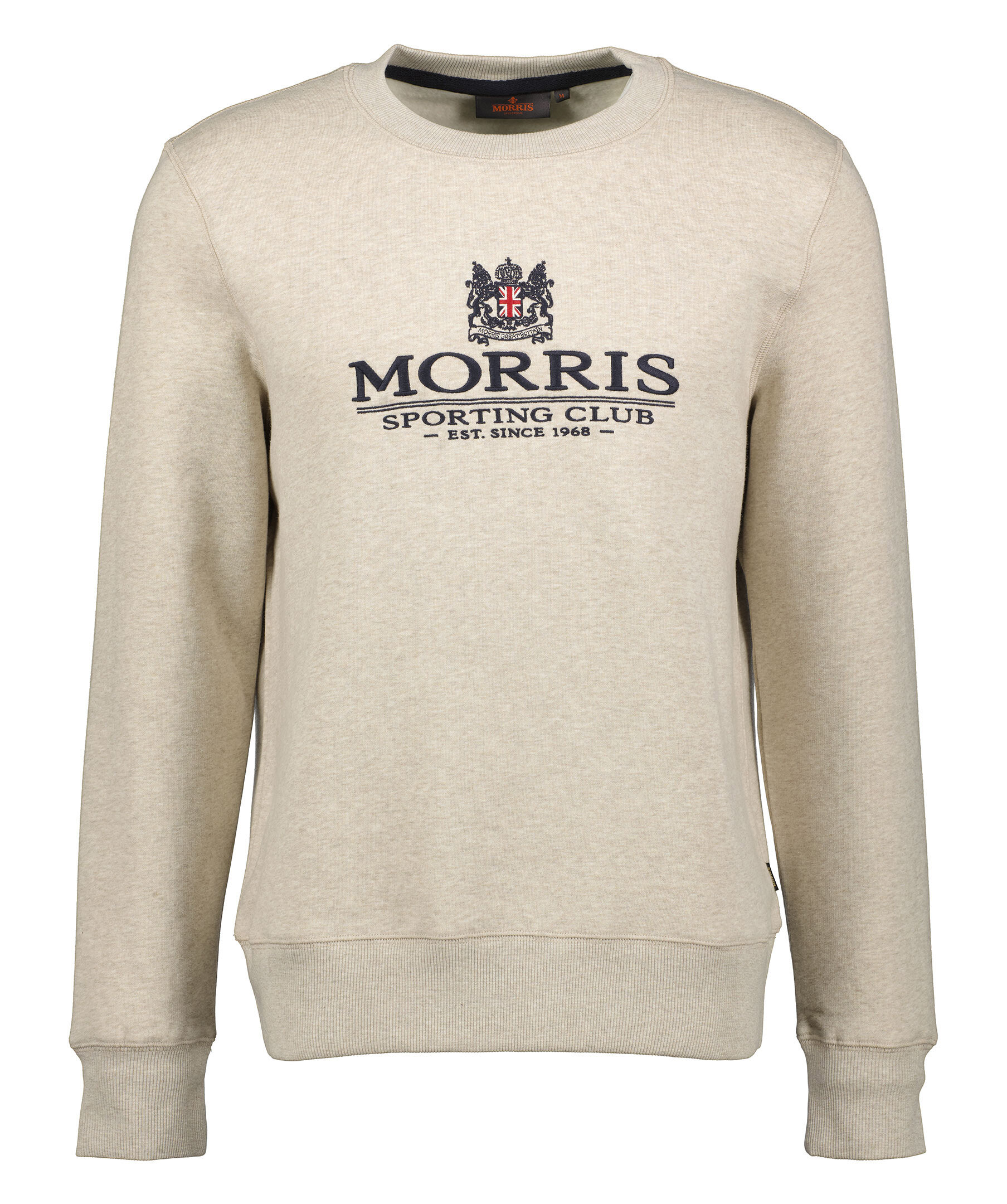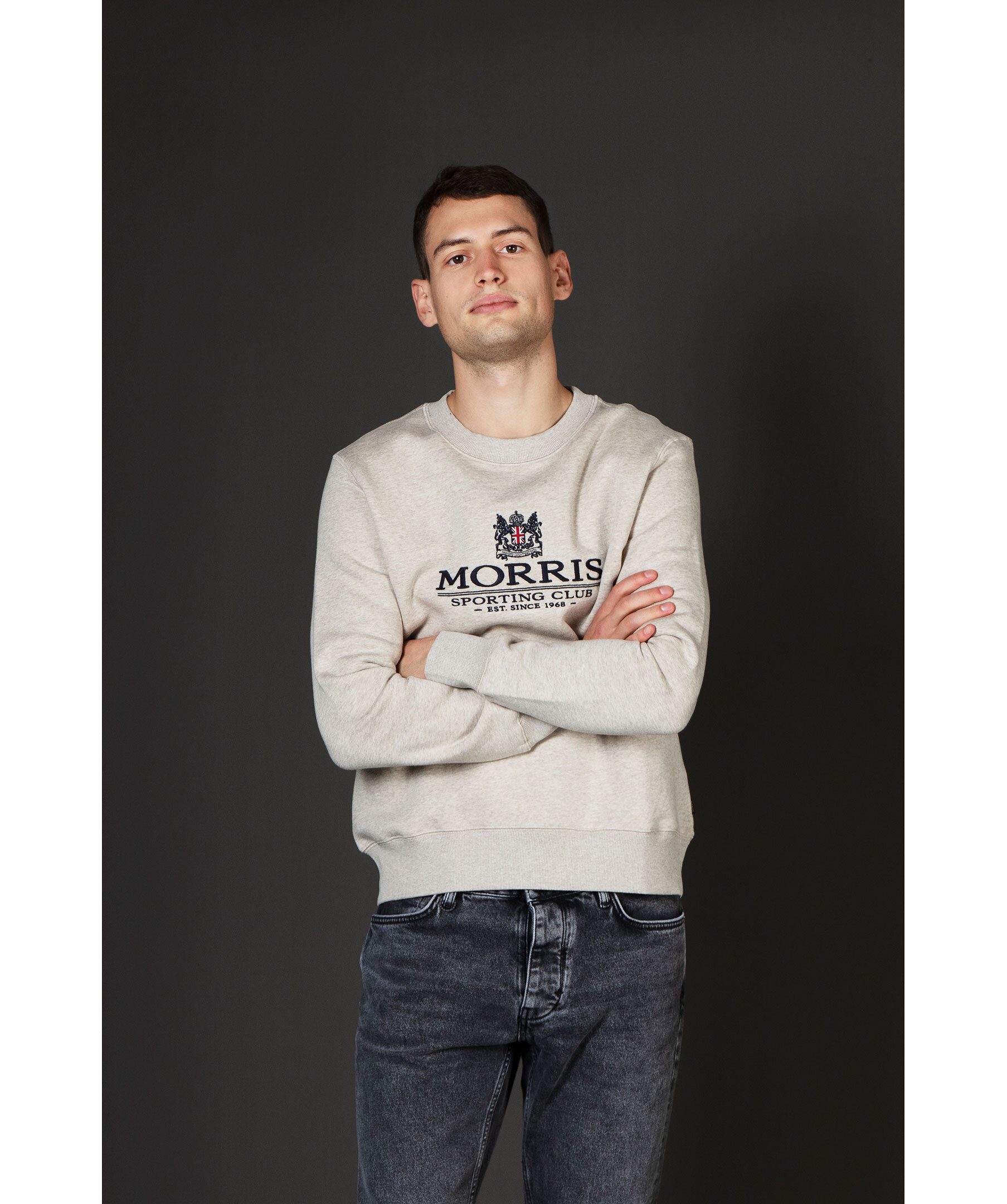Beigemelerad sweatshirt från Morris. Stor broderad logotyp över mage och bröst i marinblå. Ribbstickade muddar i halsring. muddar och plaggslut. Tillverkad i en mjuk bomulls blandning.