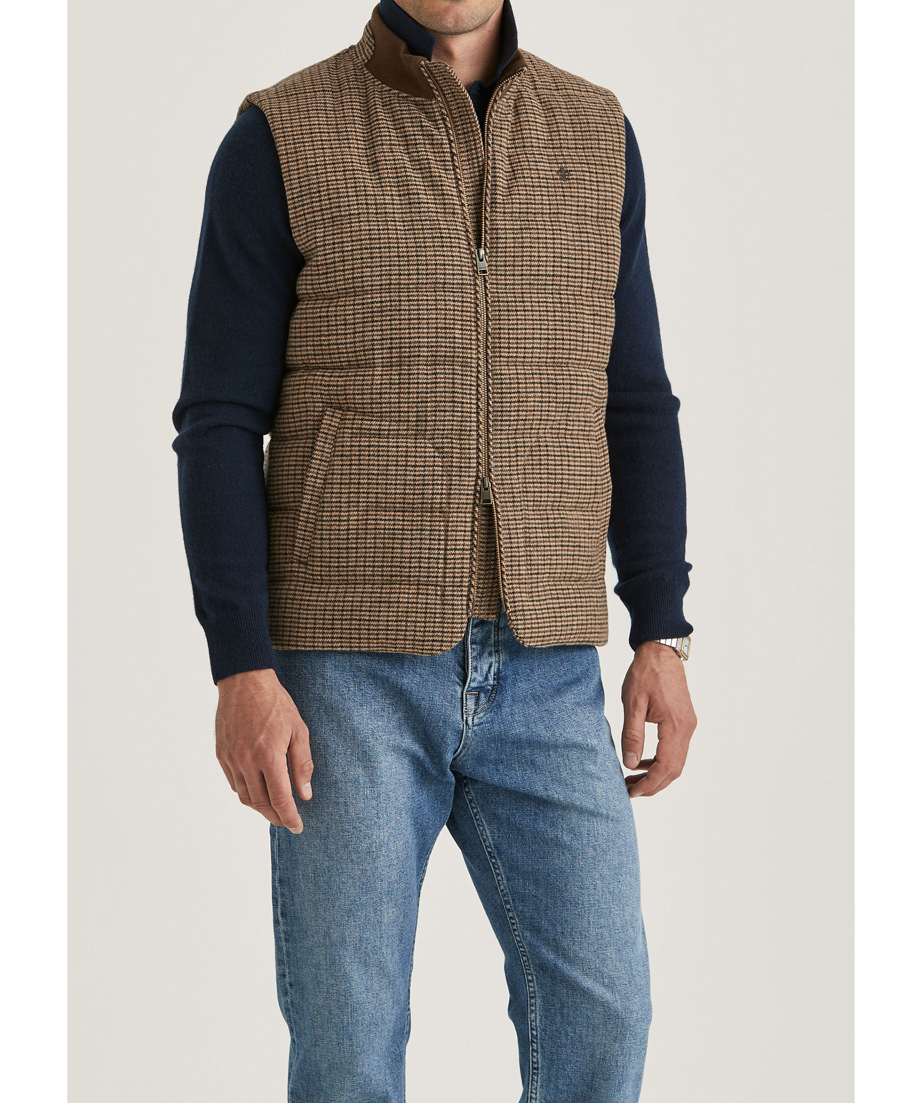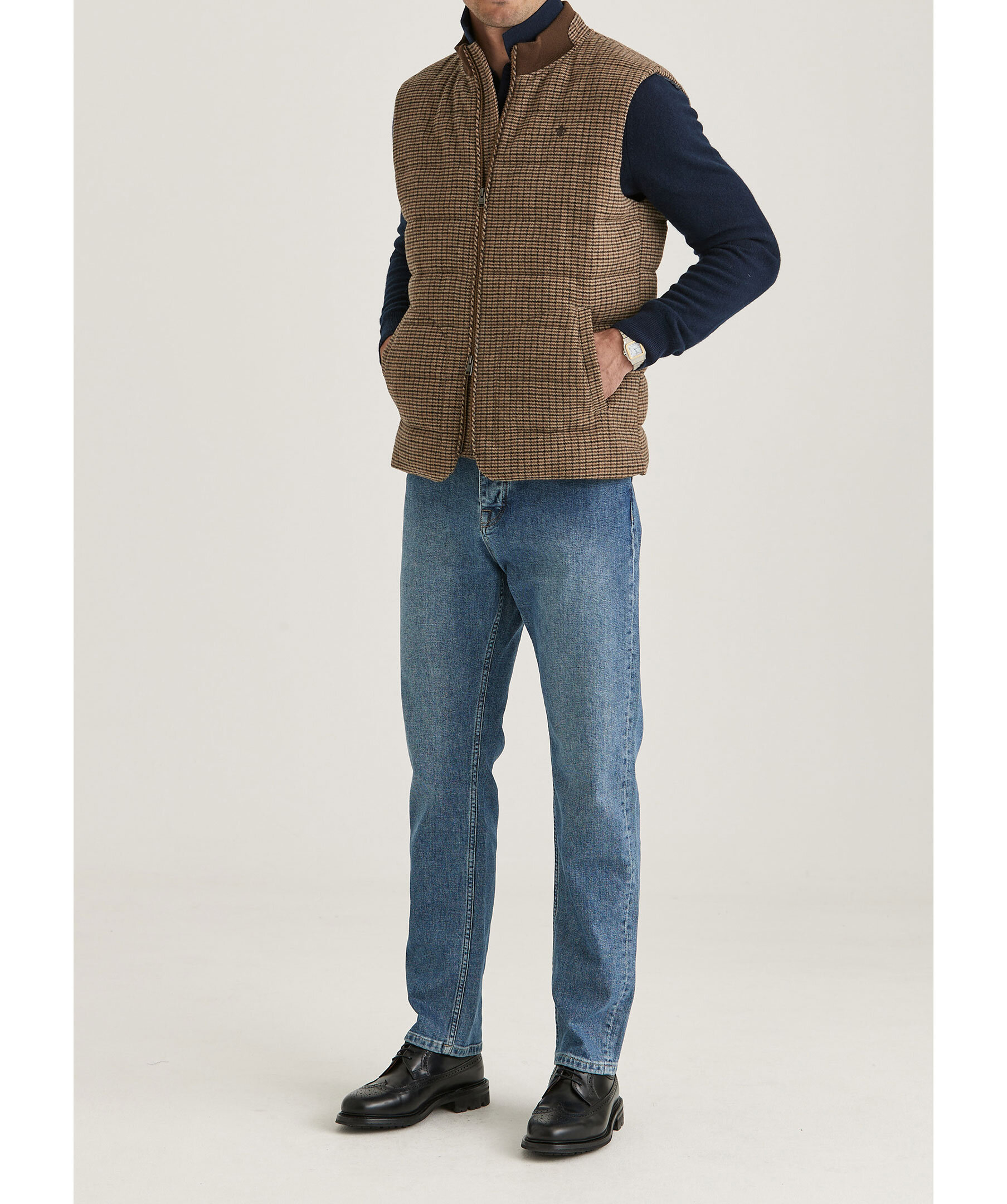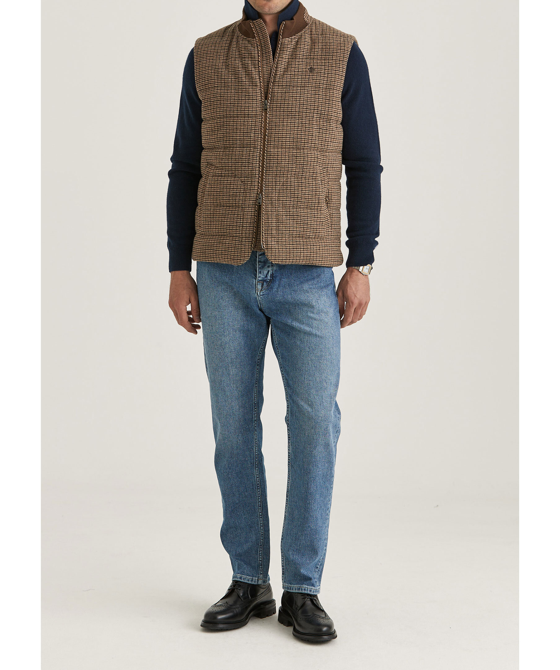 Brun, rutig väst från Morris. Västen stängs med tvåvägsdragkedja och har två sidfickor med tryckknappar samt broderad lilja på bröstet. Tillverkad i ull med viskosfoder.