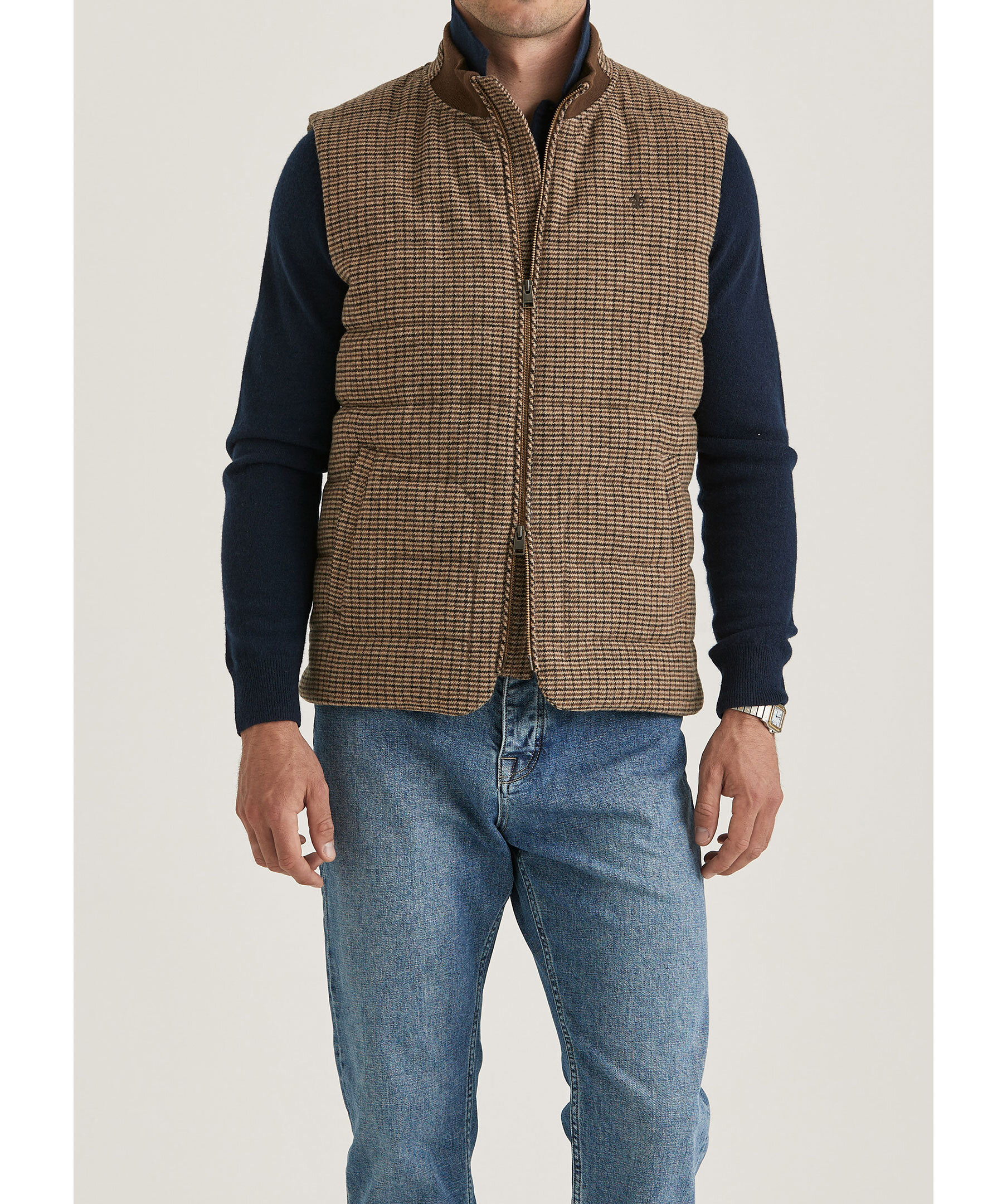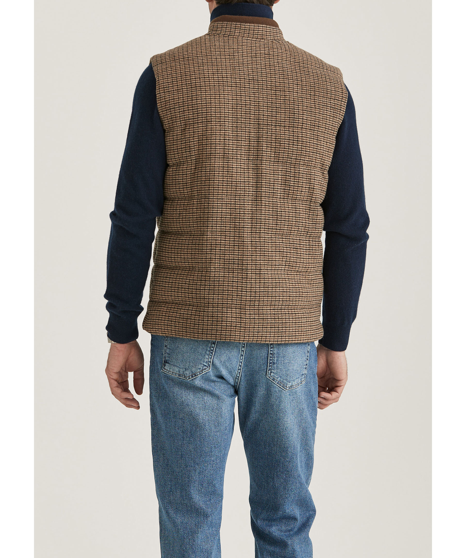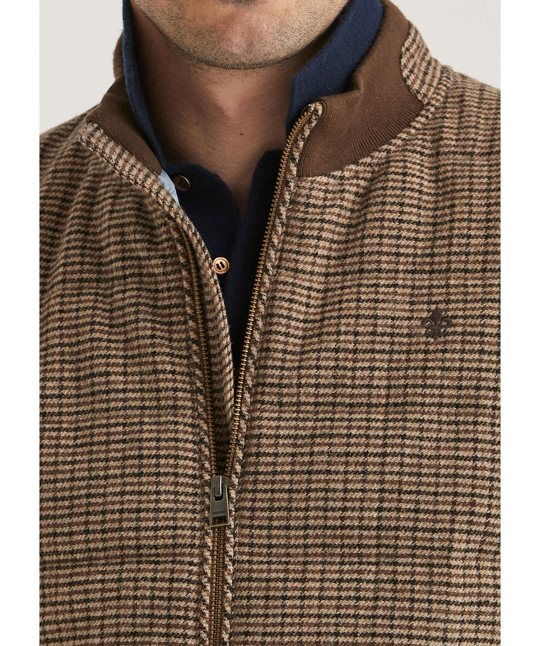 Brun, rutig väst från Morris. Västen stängs med tvåvägsdragkedja och har två sidfickor med tryckknappar samt broderad lilja på bröstet. Tillverkad i ull med viskosfoder.