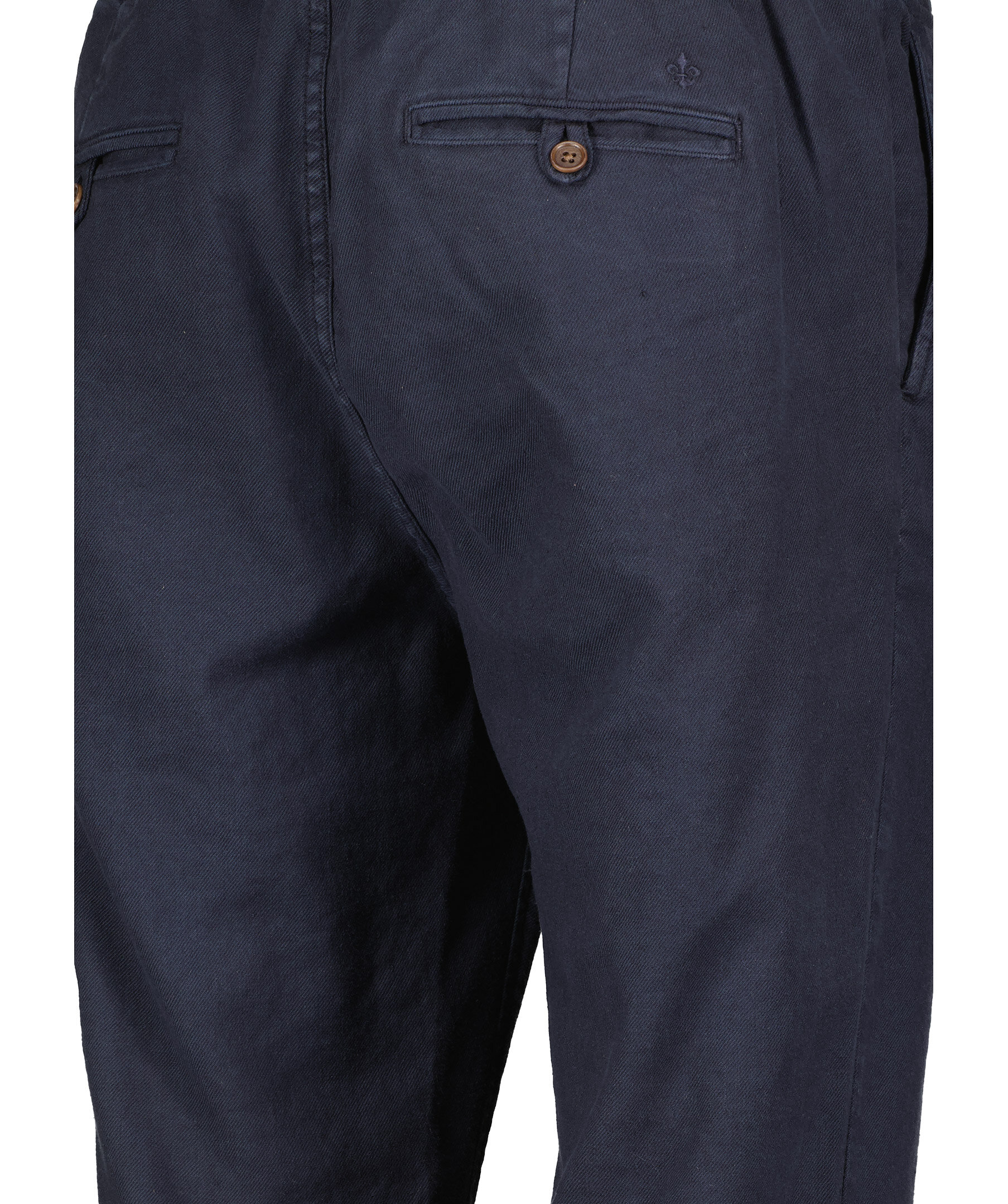 Mörkblå byxor från Morris. Tillverkade i Linne och bomullsblandning. Resår och dragsko i midjan. Två fickor framtill, bakfickor som stängs med knapp.
