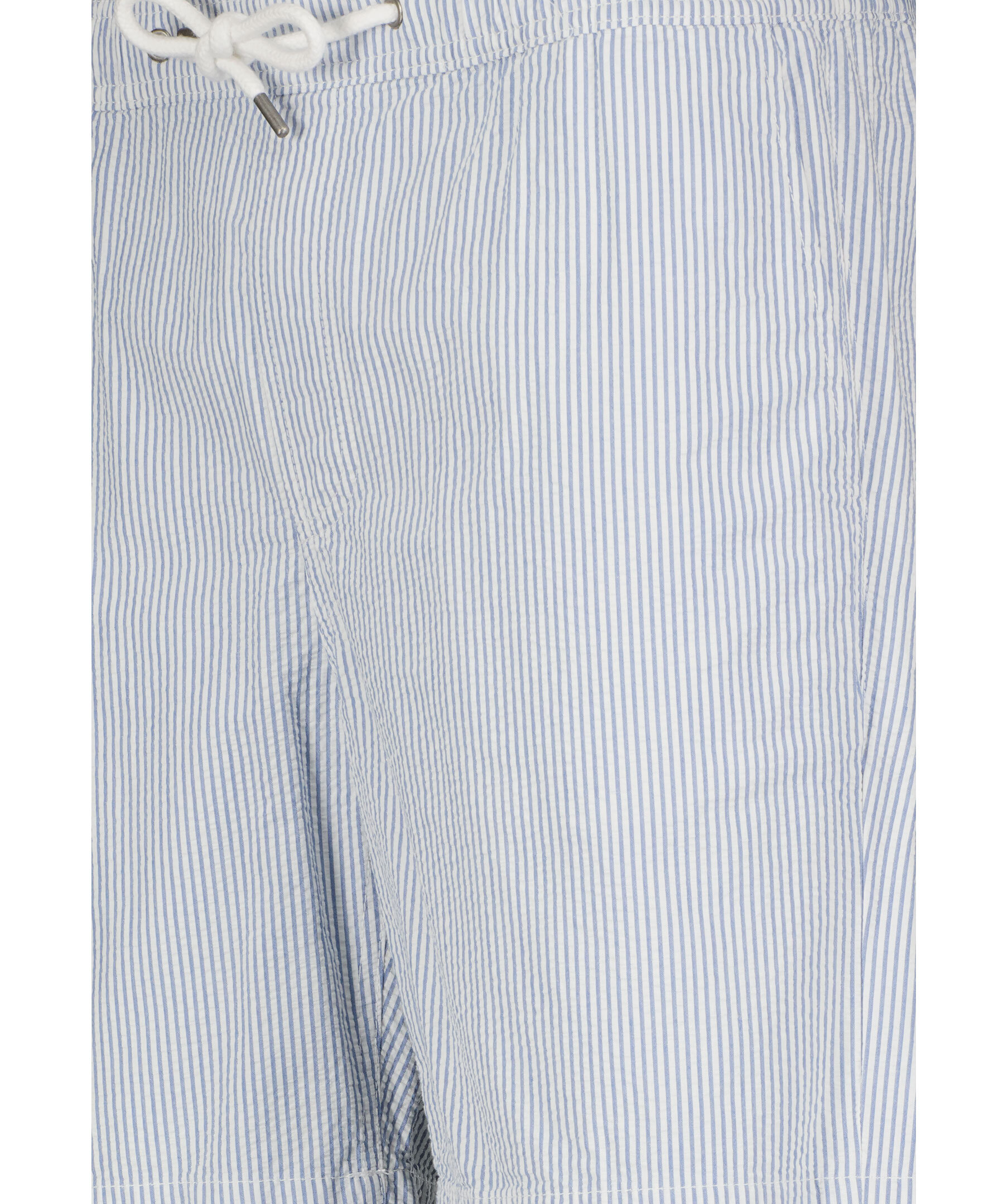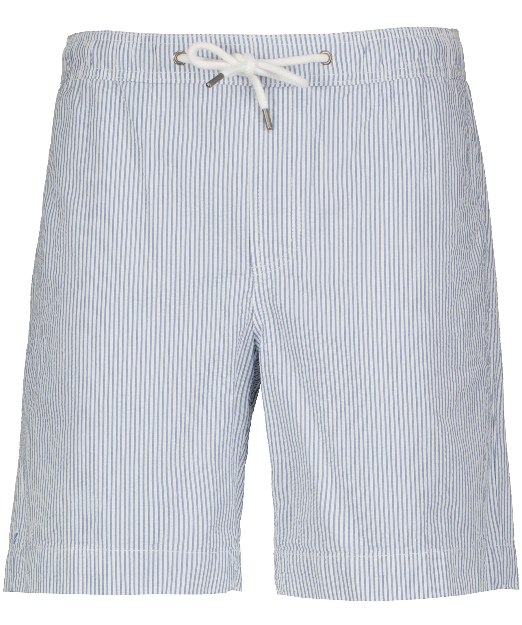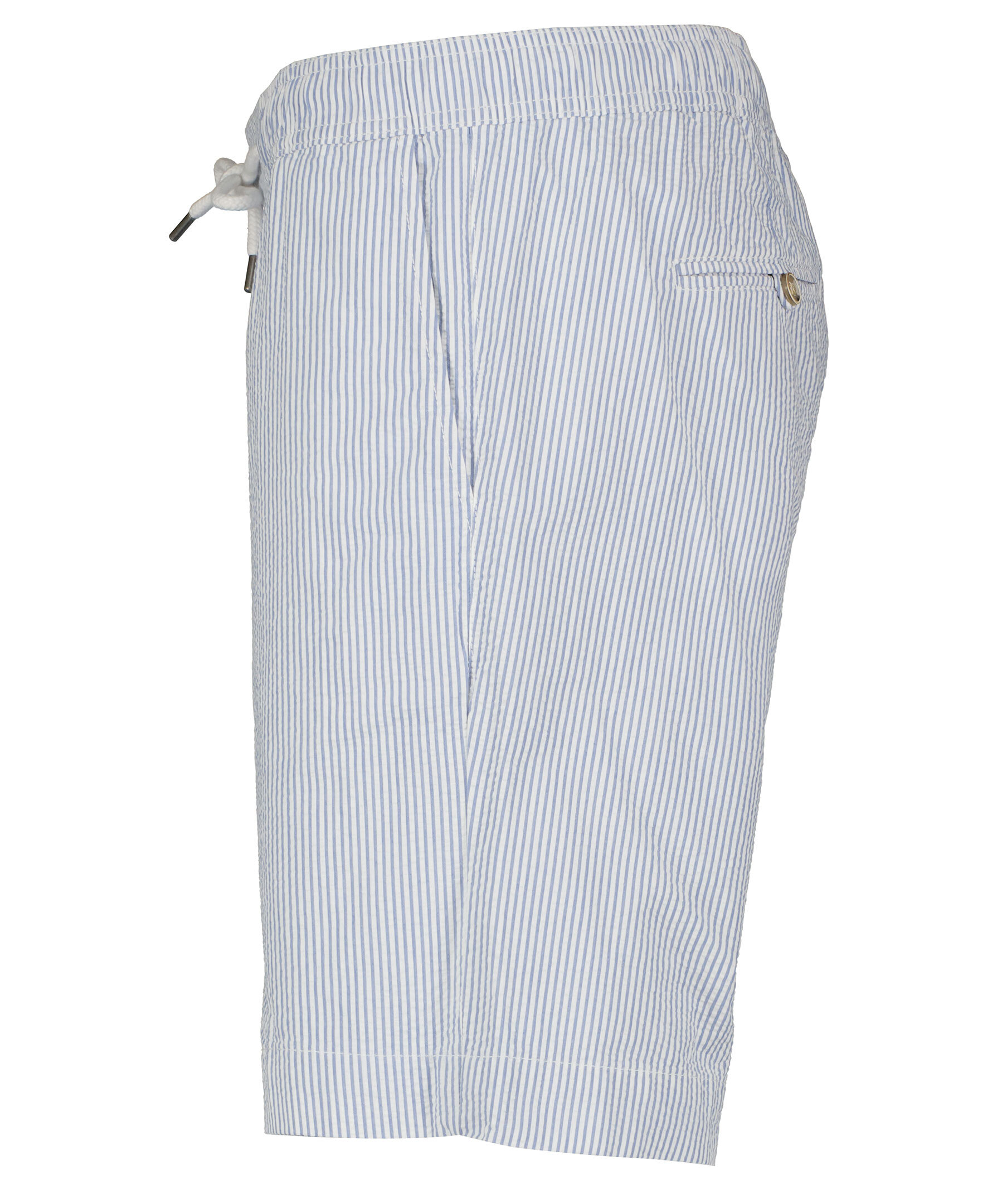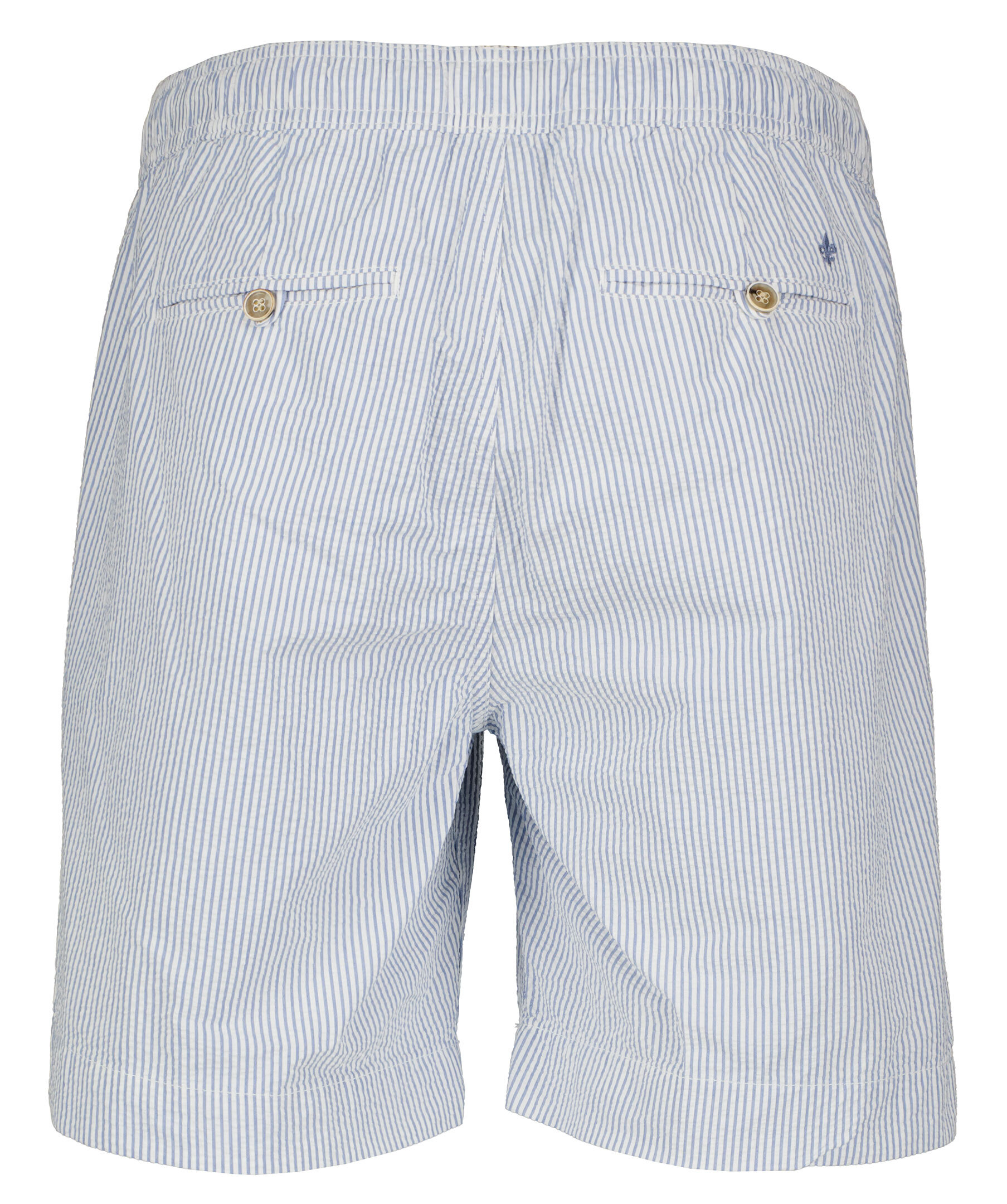 Vit- och ljusblå randiga bomullsshorts från Morris. Mudd och snörning i midjan samt öppna sidfickor och bakfickor med knapp. Tillverkade i 100% bomull. Broderad logotyp vid bakfickan.