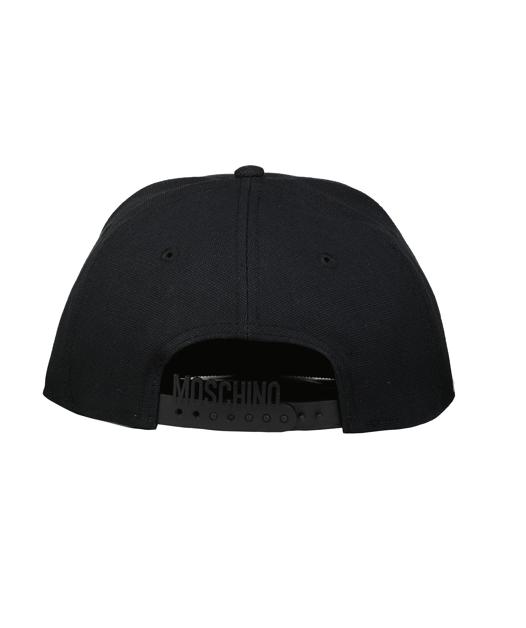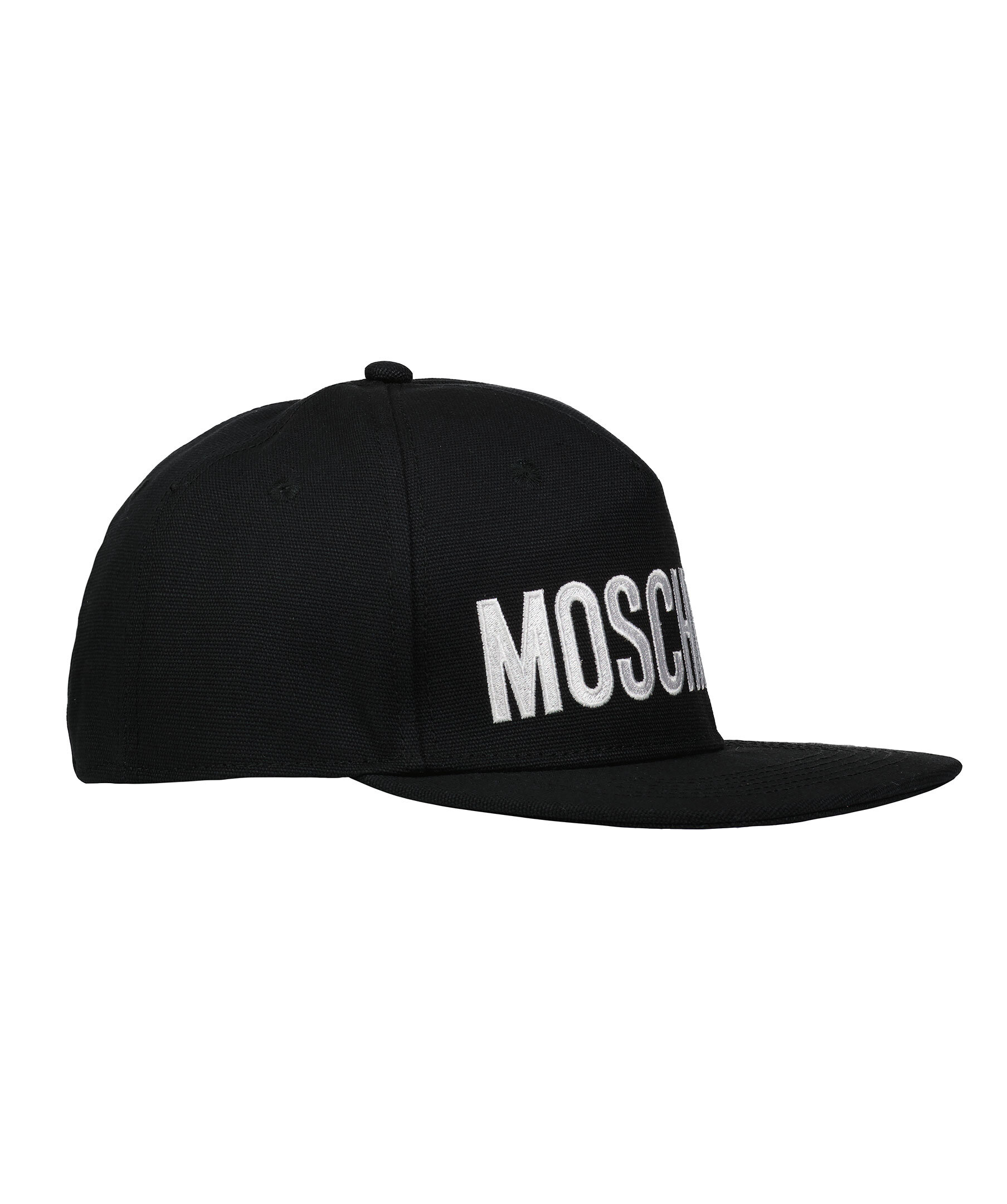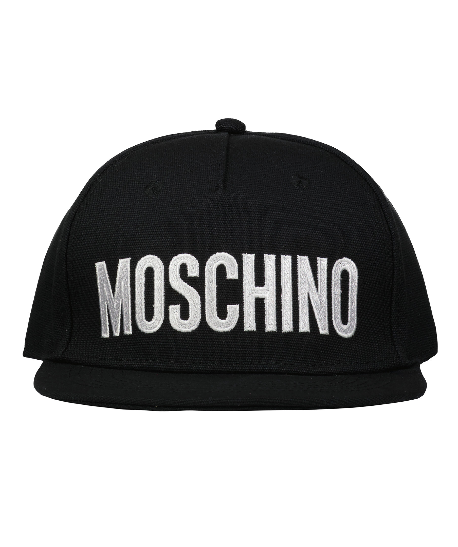 Svart keps från Moschino. Gjord i 100% bomull och har en vit, broderad logotyp mitt fram och ställbart spänne i plast i nacken med logotyp och en rak skärm.