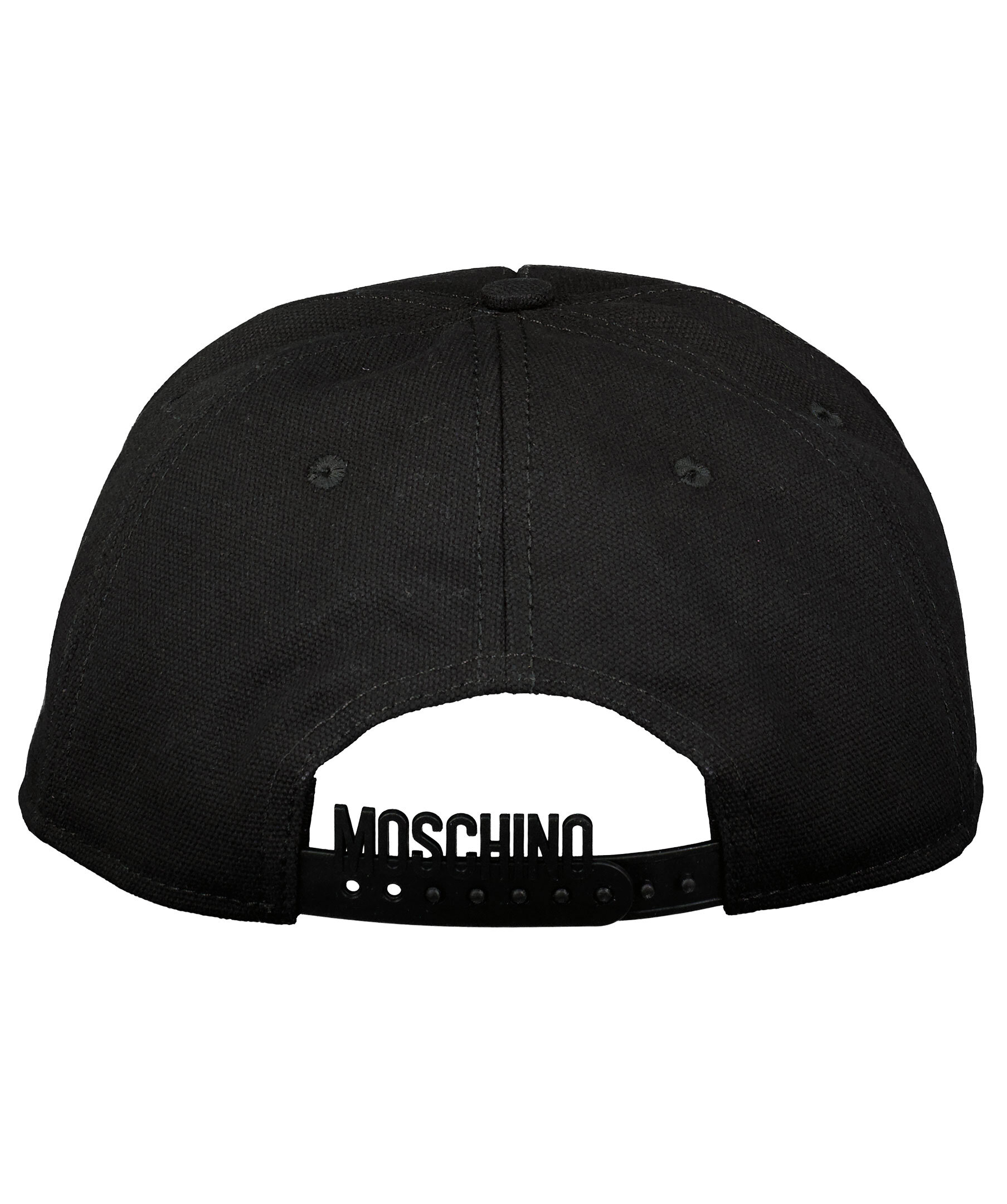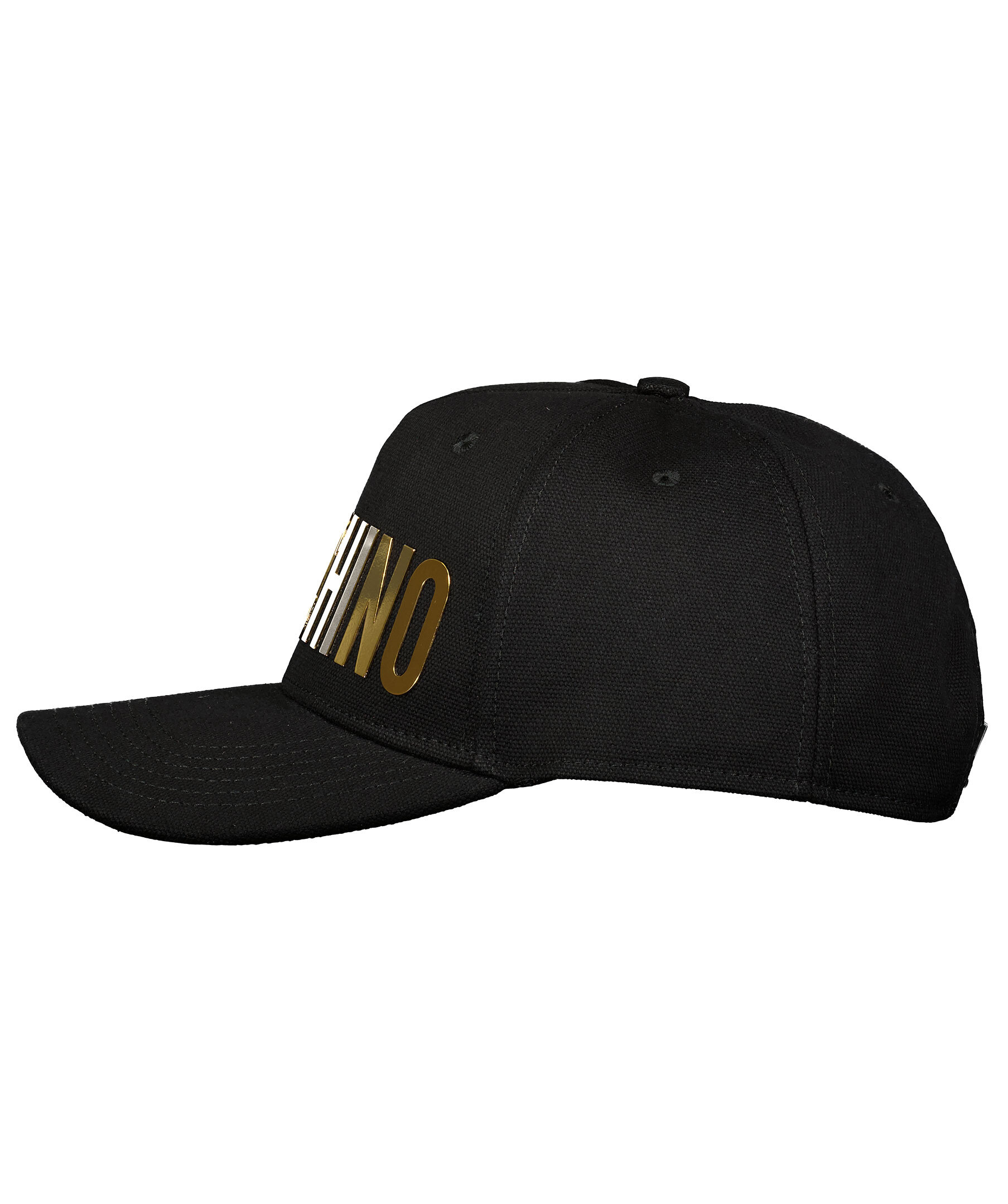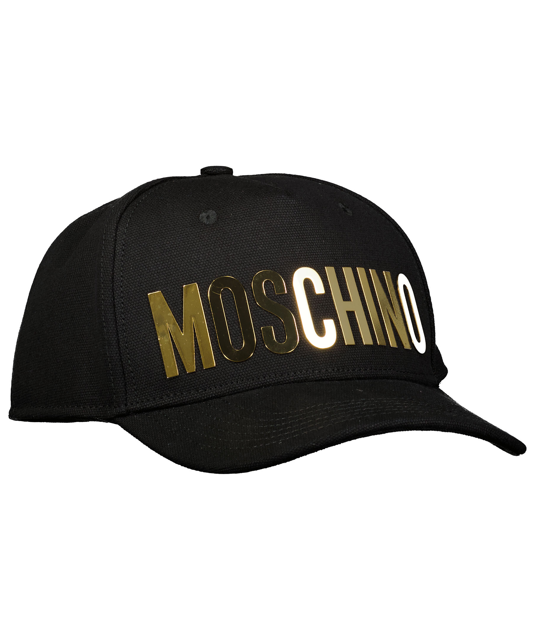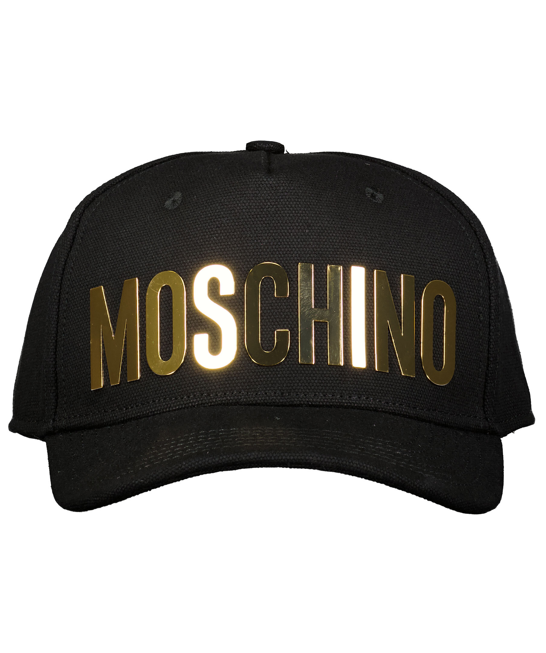 Svart keps från Moschino. Gjord i 100% bomull och har en guldfärgade logotyp i metall mitt fram och ställbart spänne i plast i nacken med logotyp och en rak skärm.