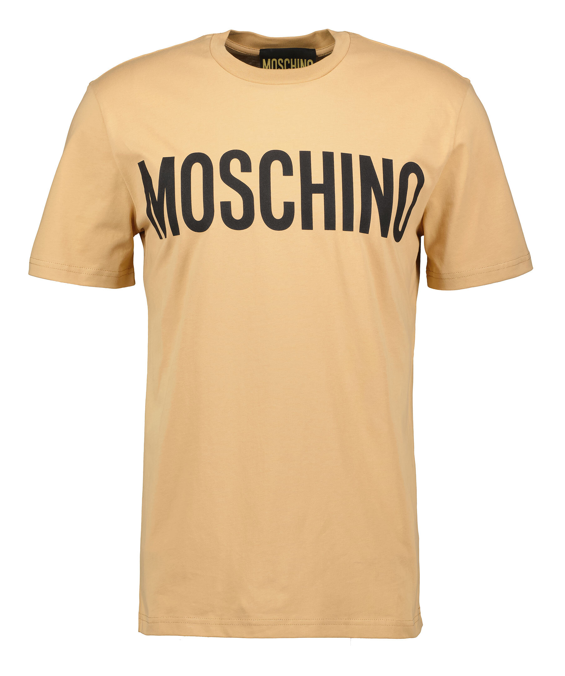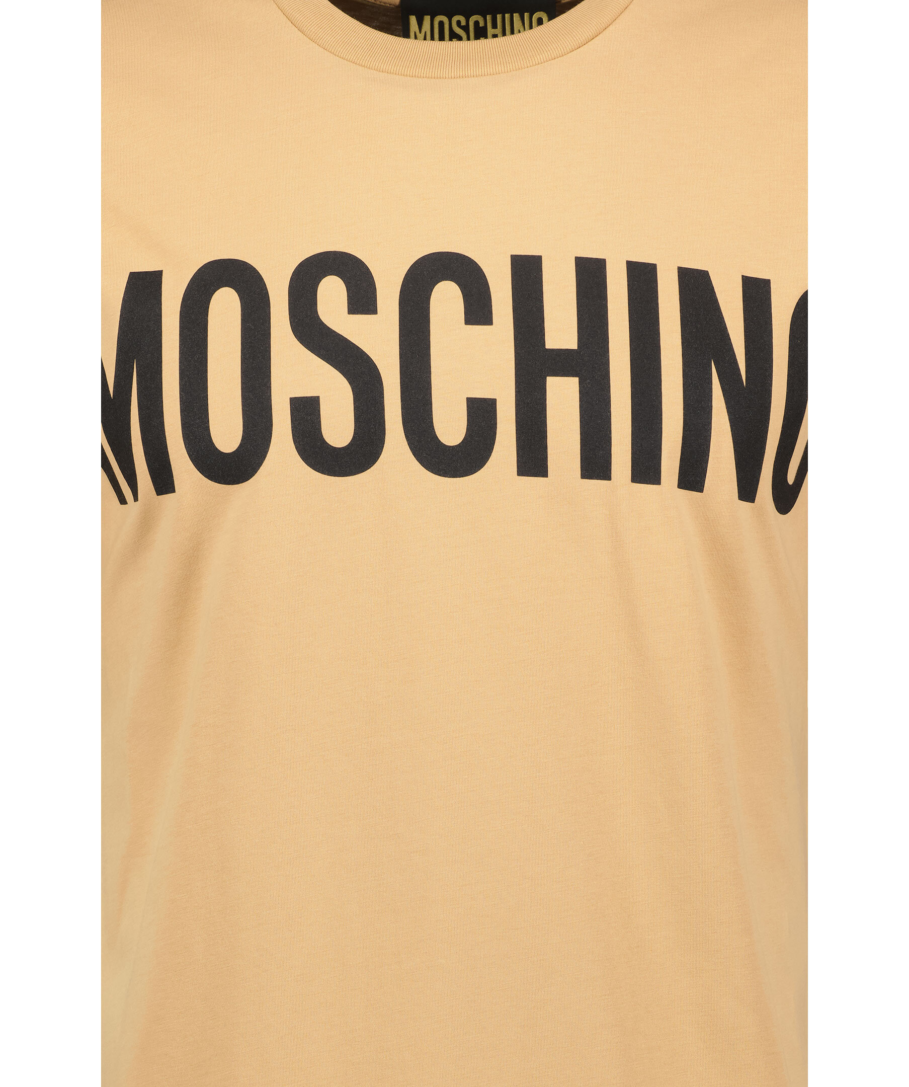 Sandfärgad t-shirt från Moschino. Gjord i 100% bomull. Tröjan har ett svart tyck med logga på bröstet. Ribbad mudd vid halsringningen.