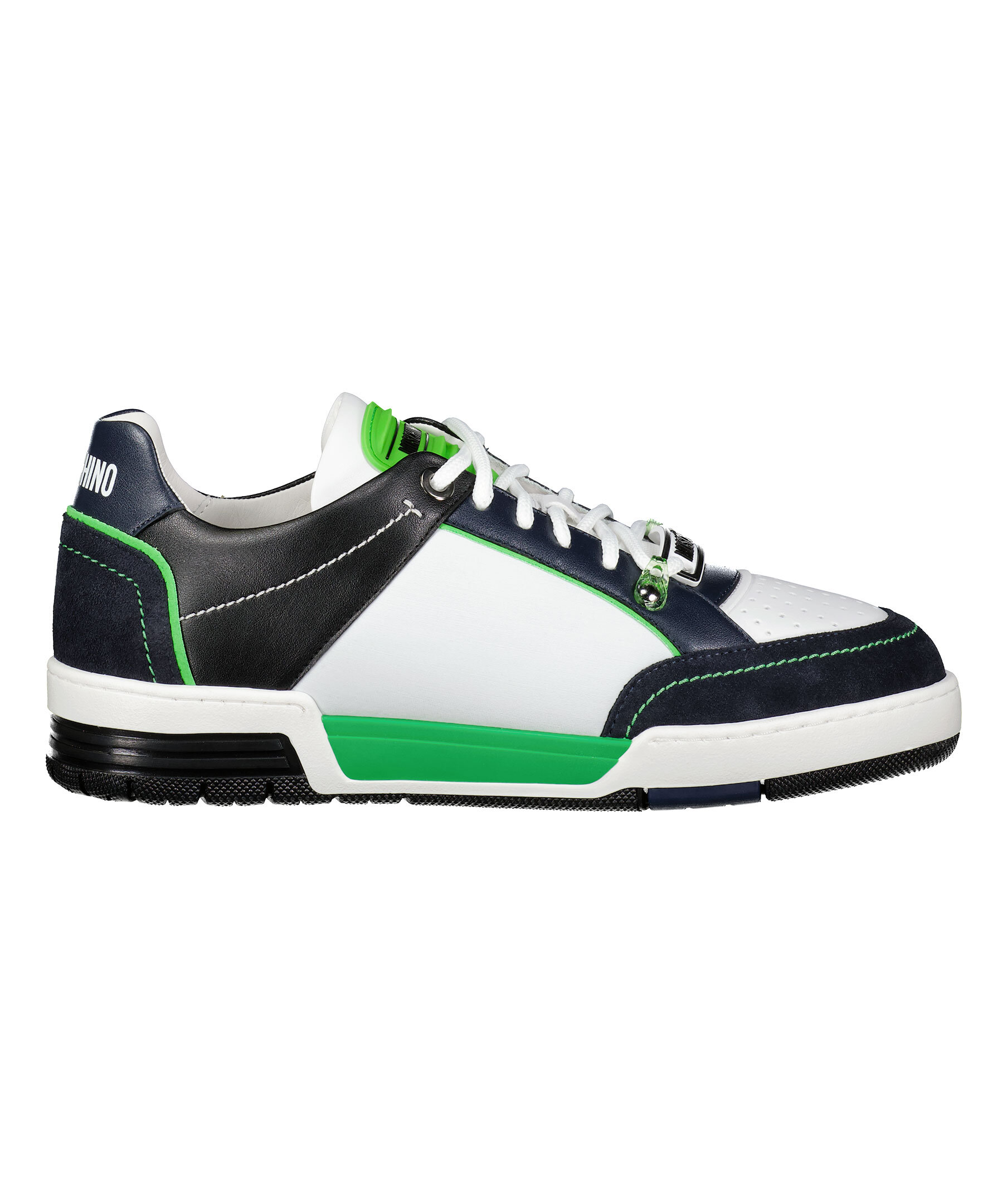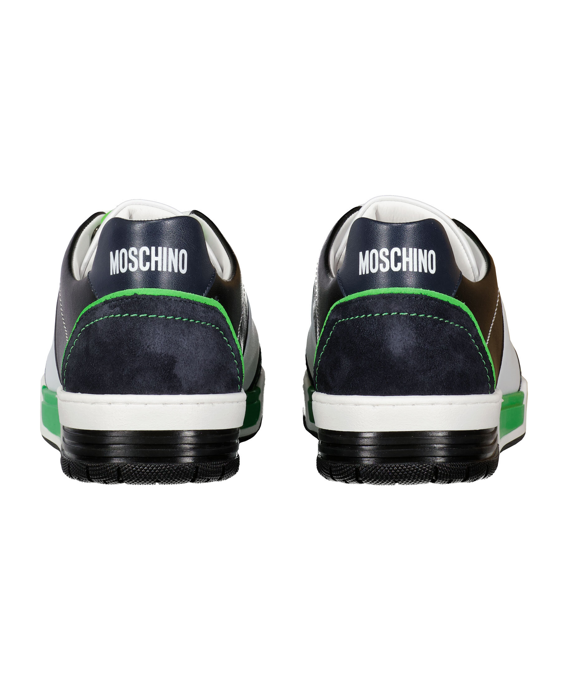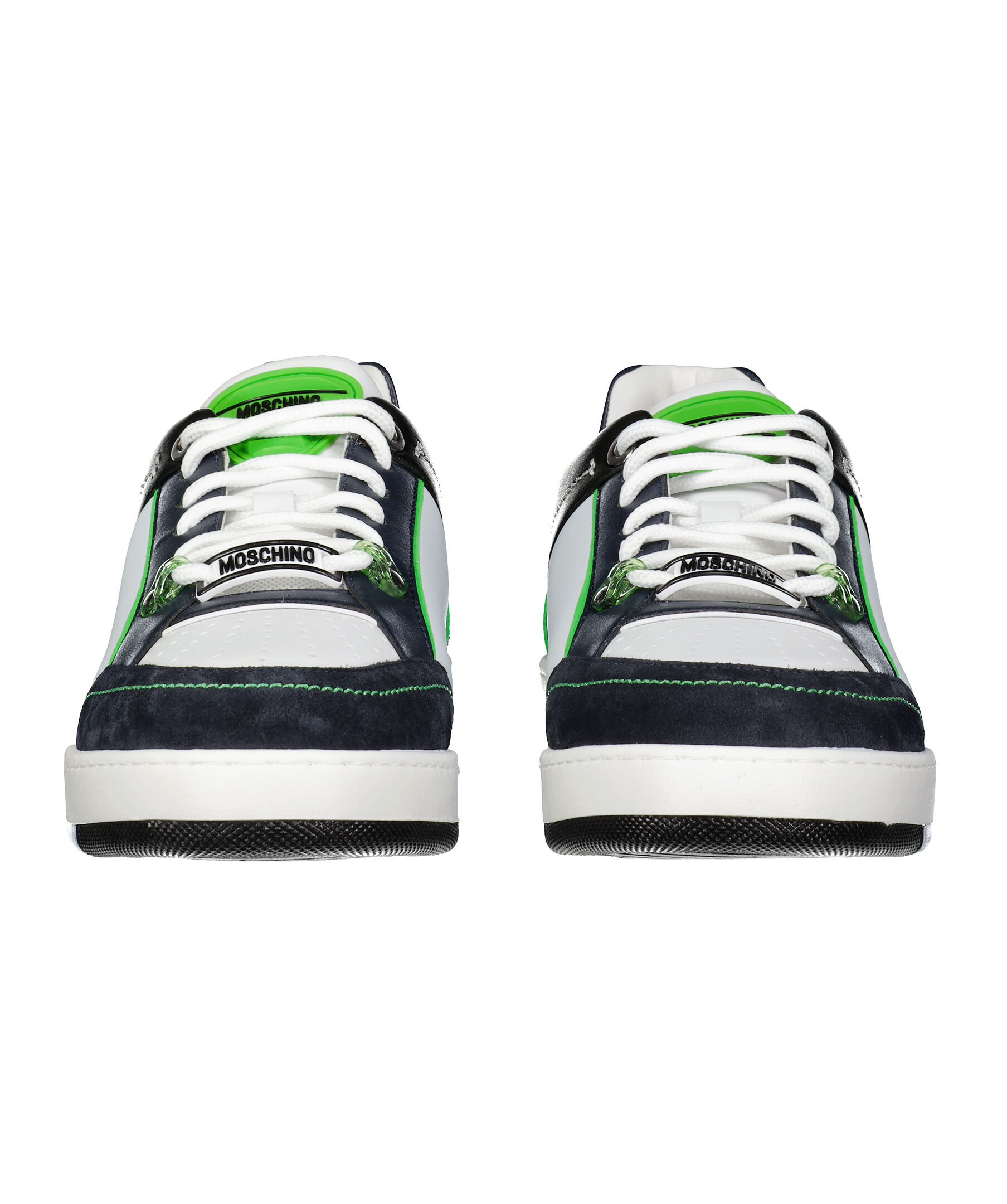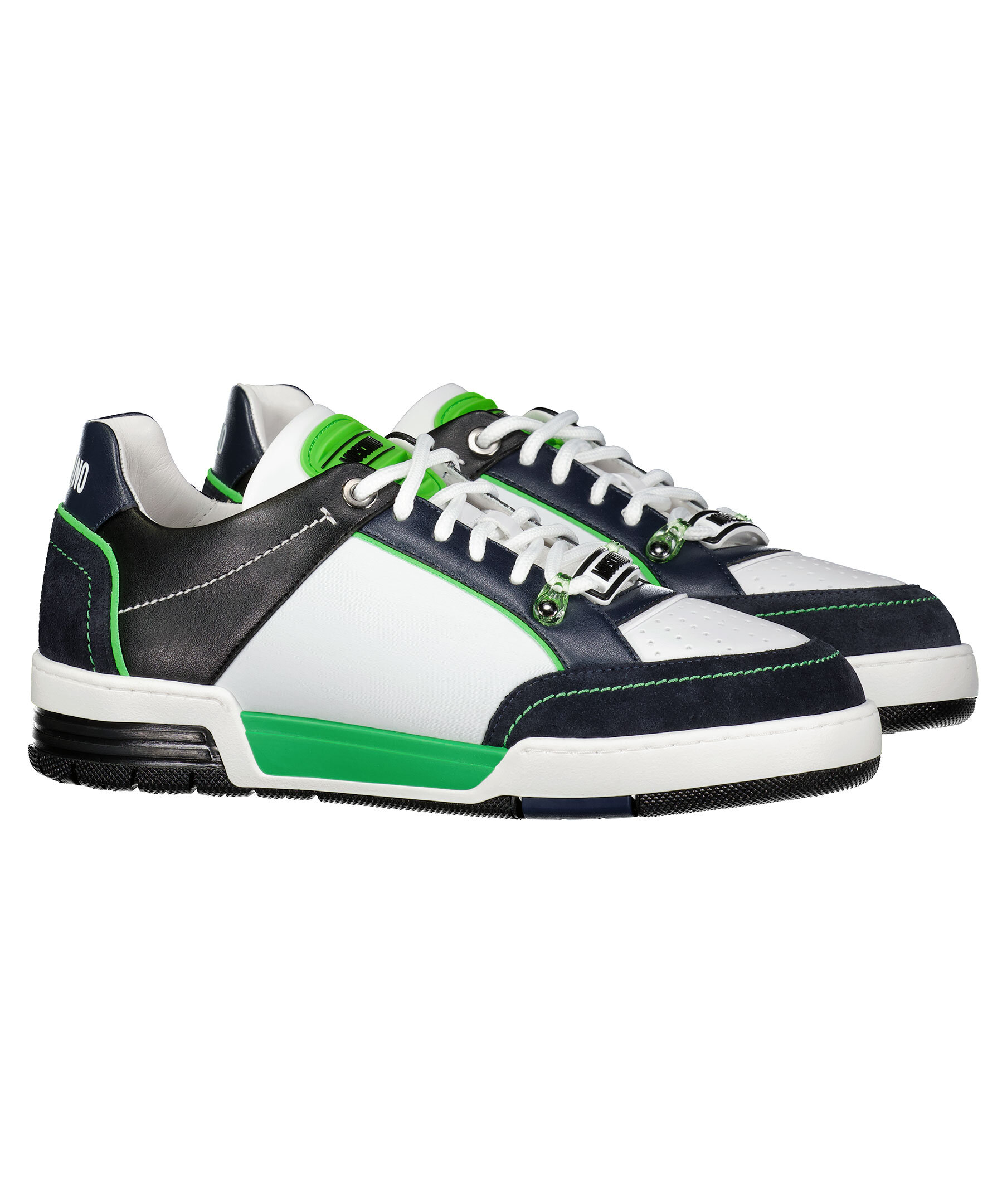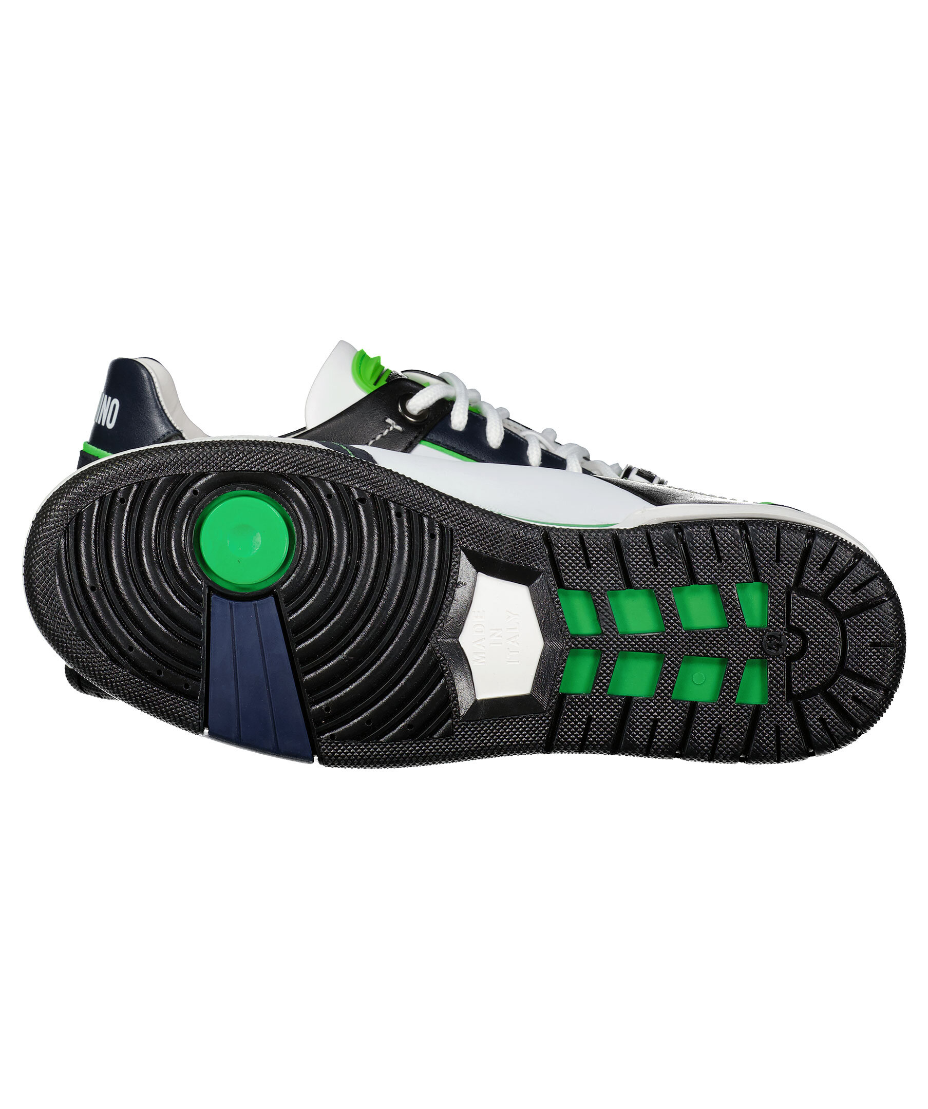 Vita, svarta och gröna sneakers från Moschino. Vita runda skosnören. Gummerad patch med logotyp på plösen och framtill på snörningen. Tryckt logotyp baktill på hälen. Grov sula i gummi.
