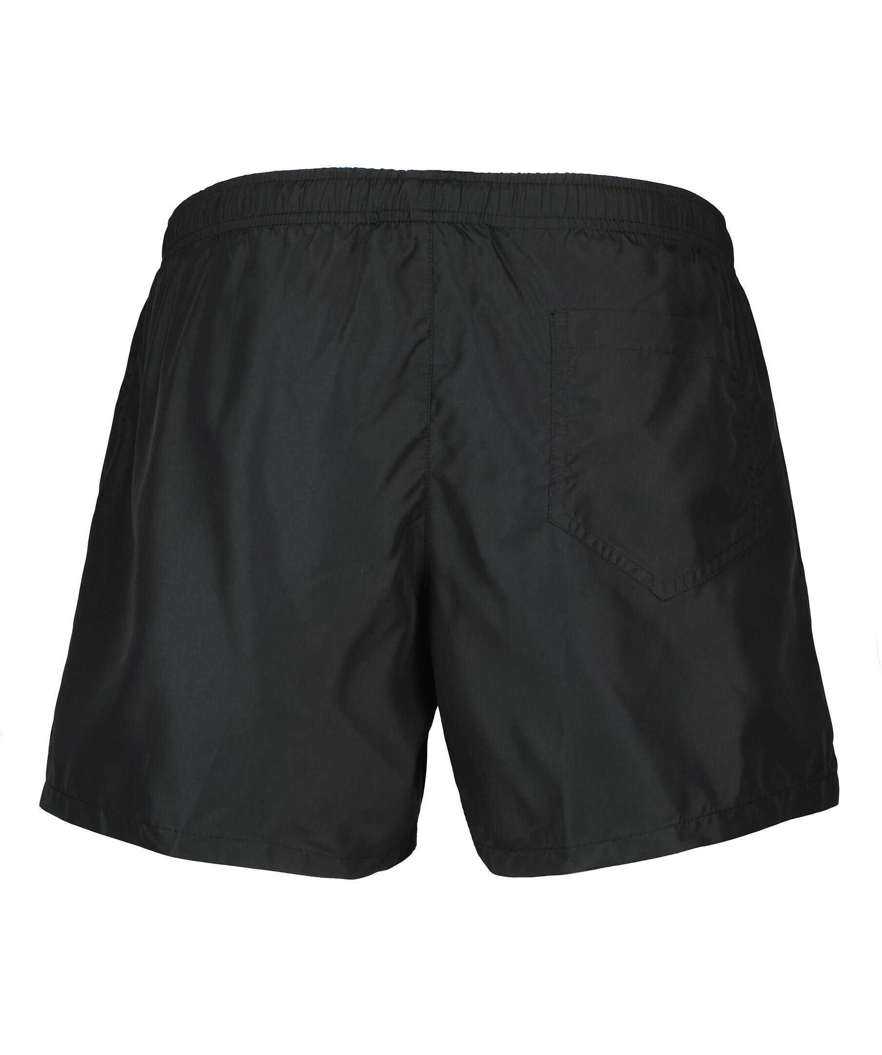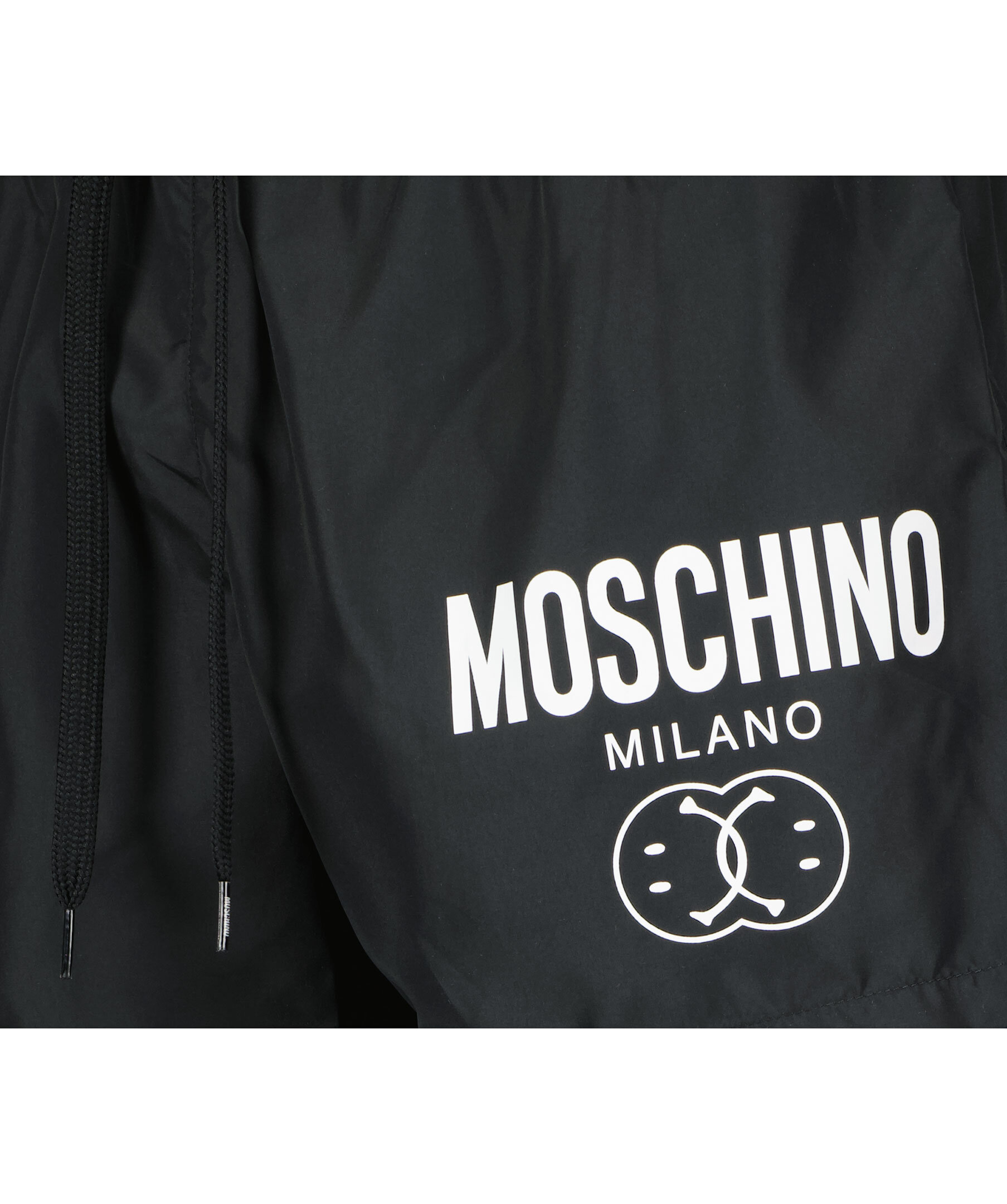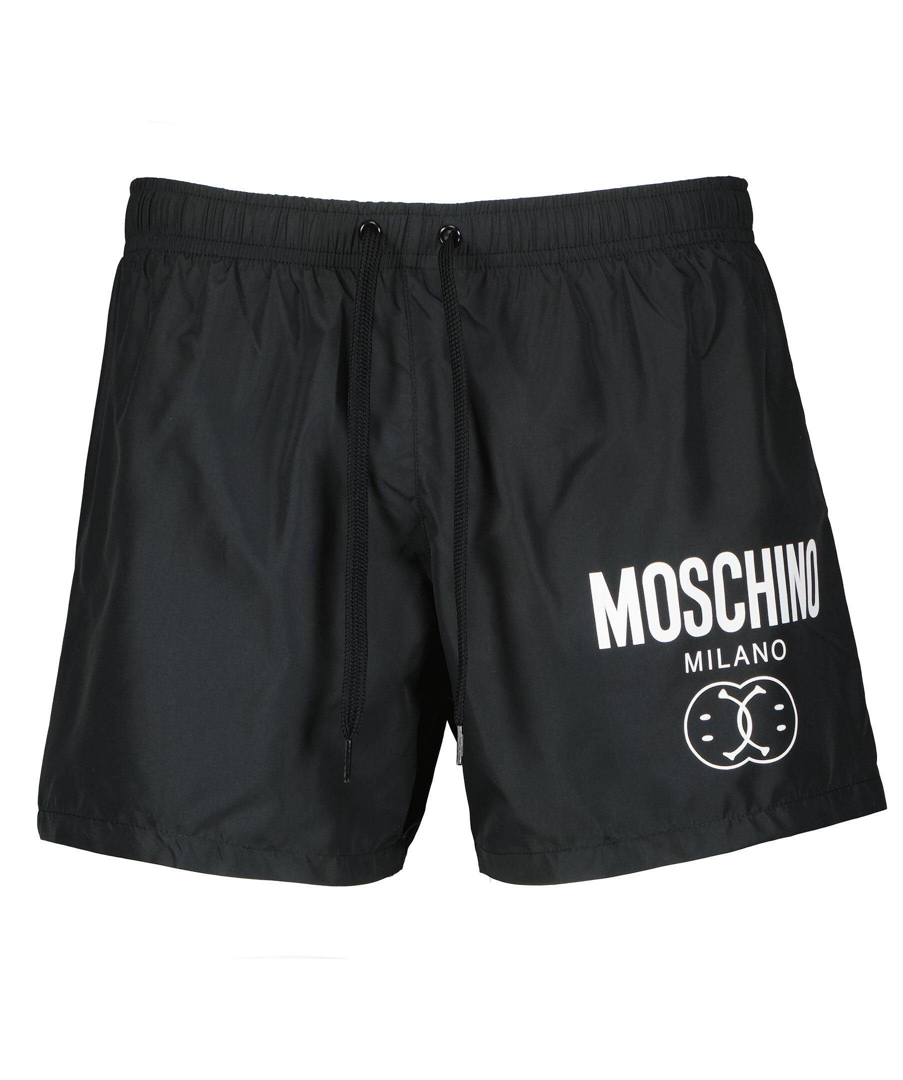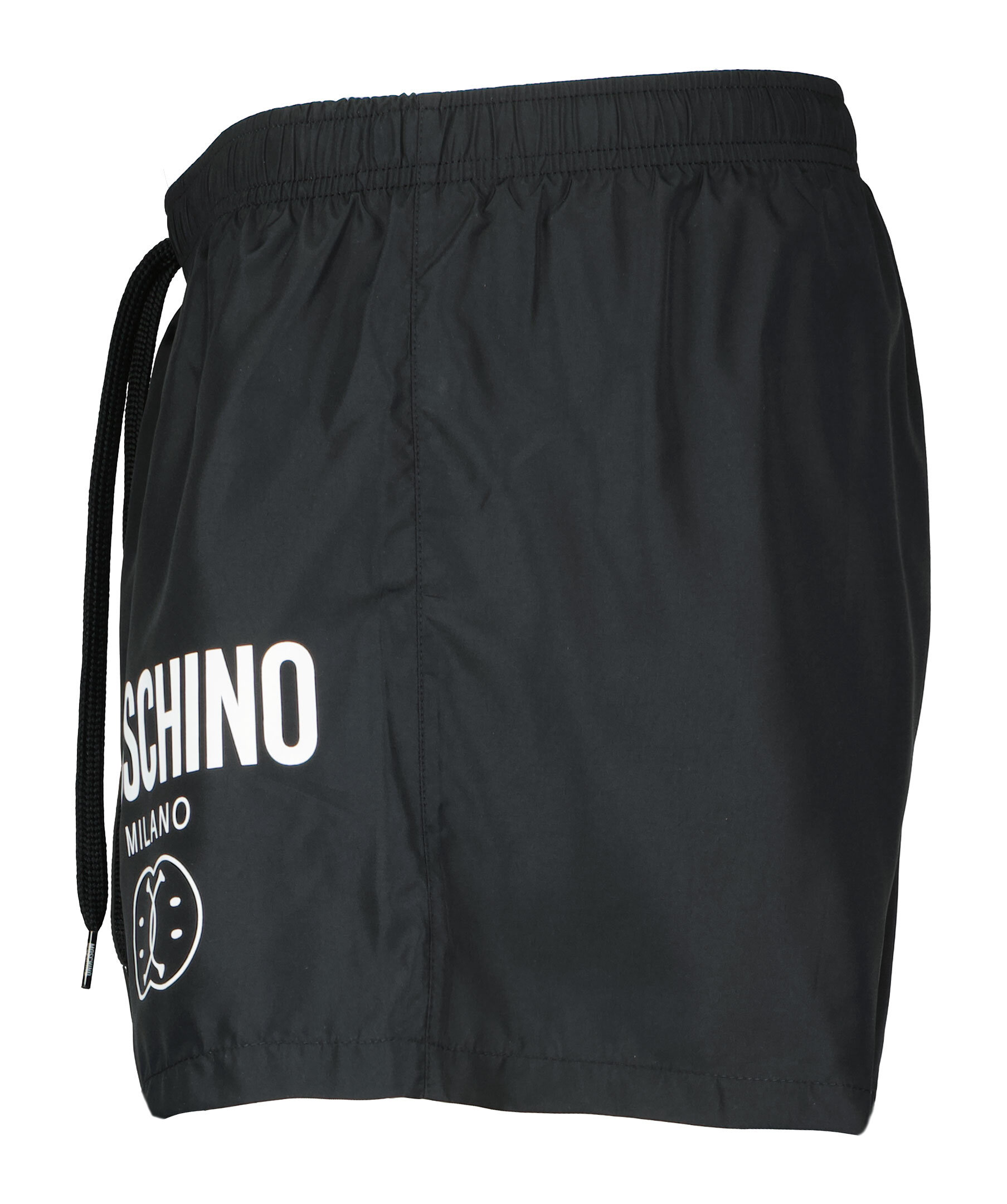Svarta badbyxor från Moschino. Tryckt logotyp på vänster lår. En ficka baktill på höger sida. Resår och dragsko i midjan.