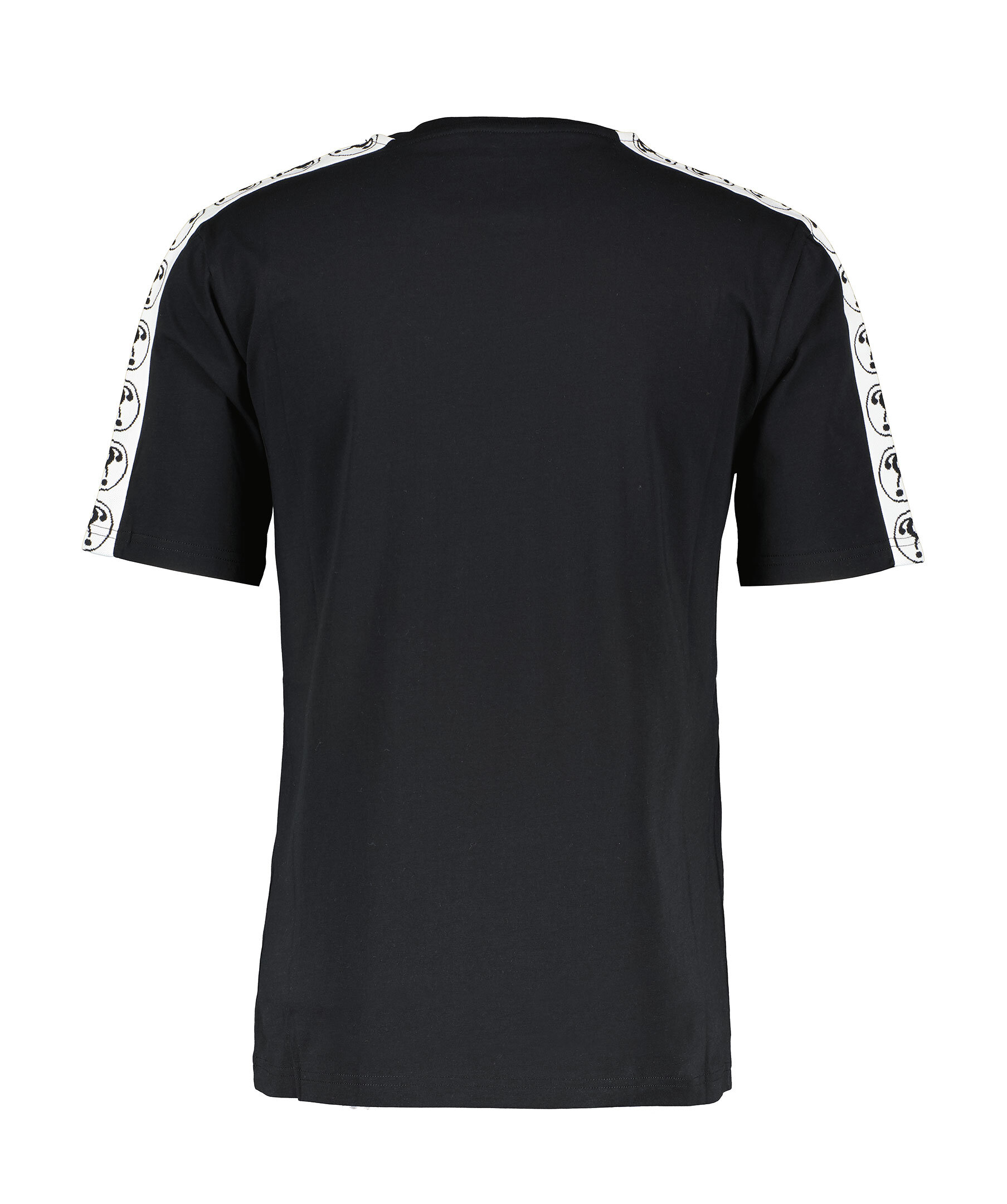 Svart t-shirt från Moschino. Vit gummerad logotyp på bröstet och kontrastränder längs ut ärmarna med frågetecken på. Tillverkad i bomull.