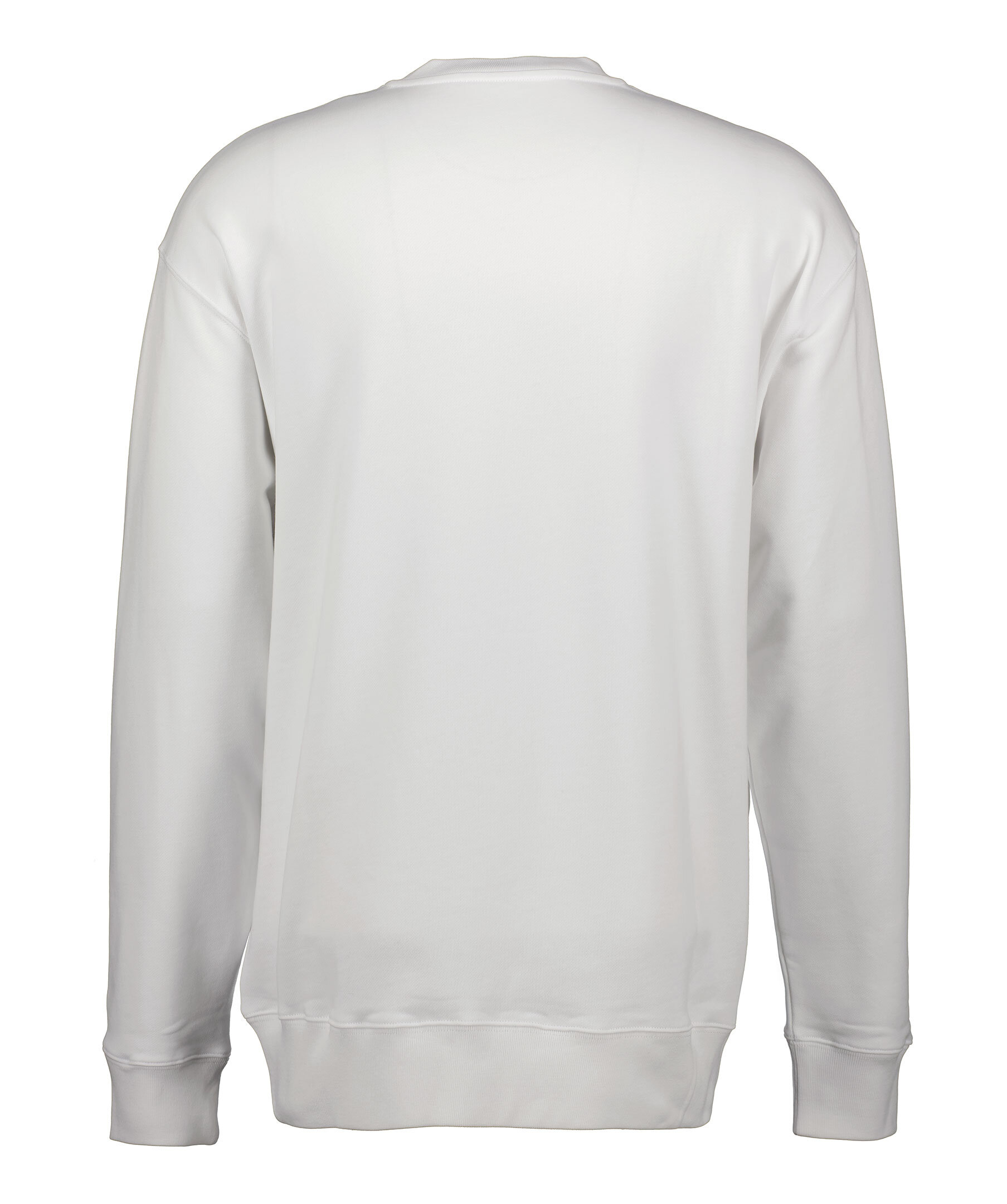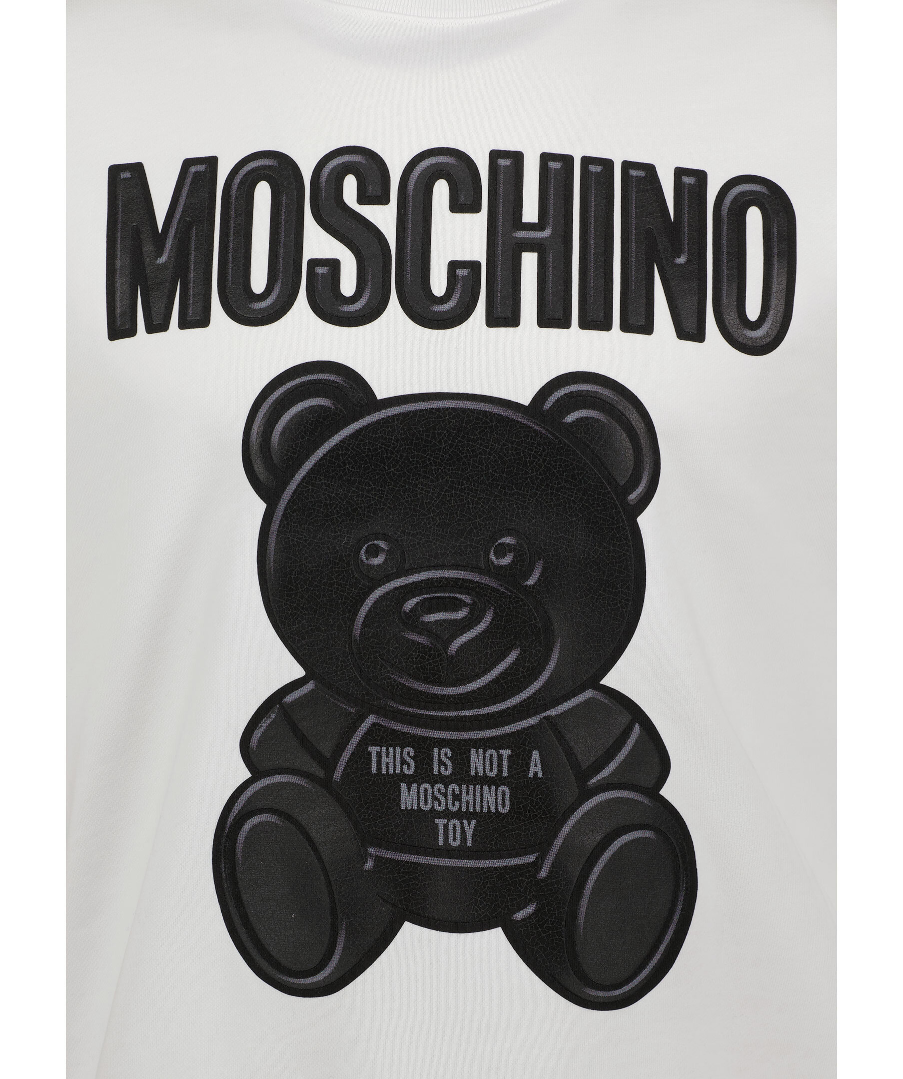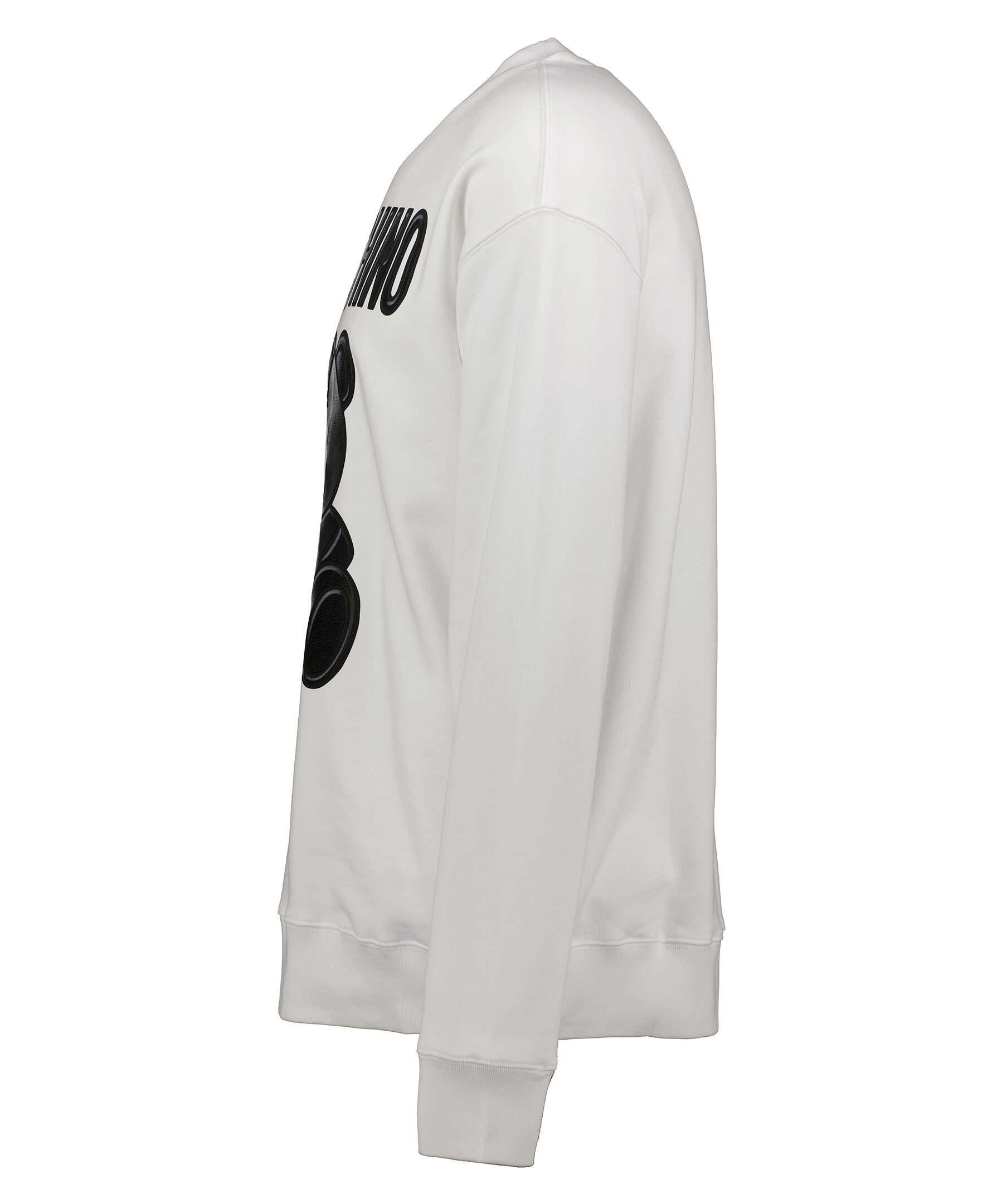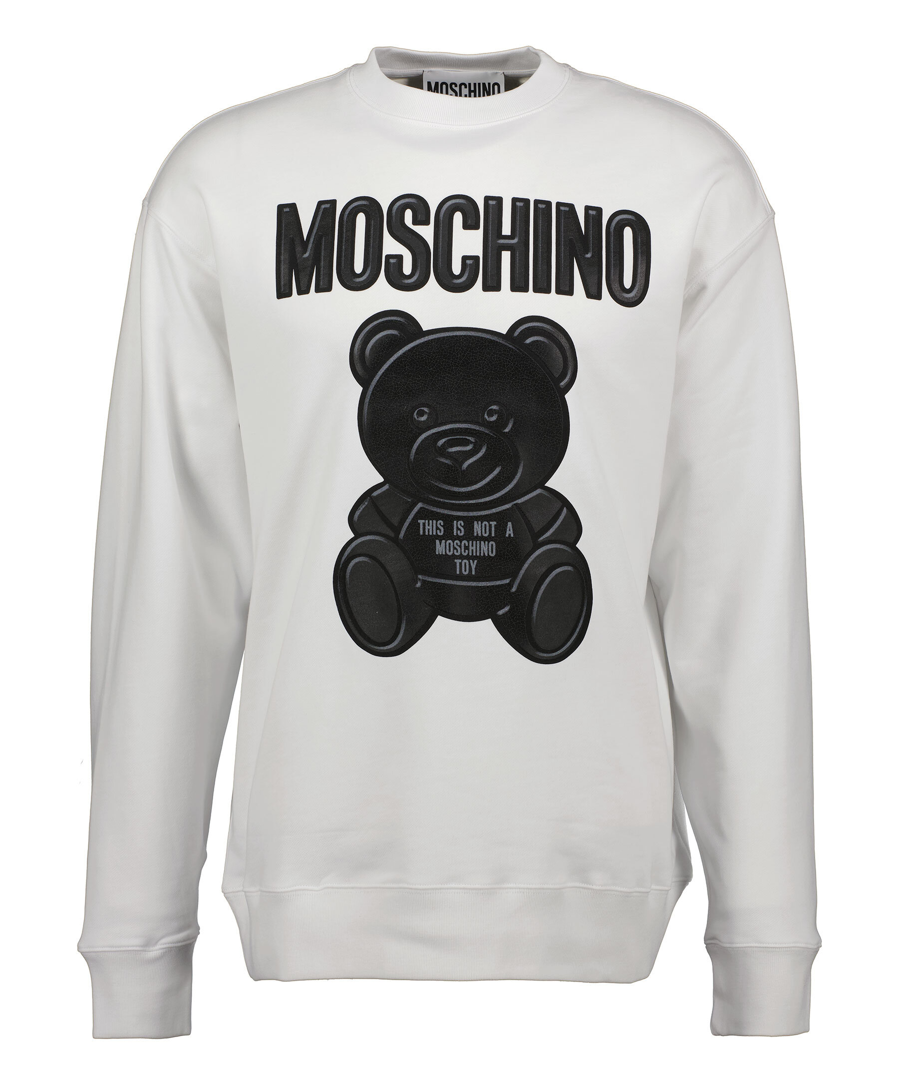 Vit sweatshirt från Moschino med svart logotyp och Moschino Teddy Bear tryck på framsidan. Ribbstickad halsringning samt muddar vid ärm- och plaggslut. Tillverkad i 100% bomull.