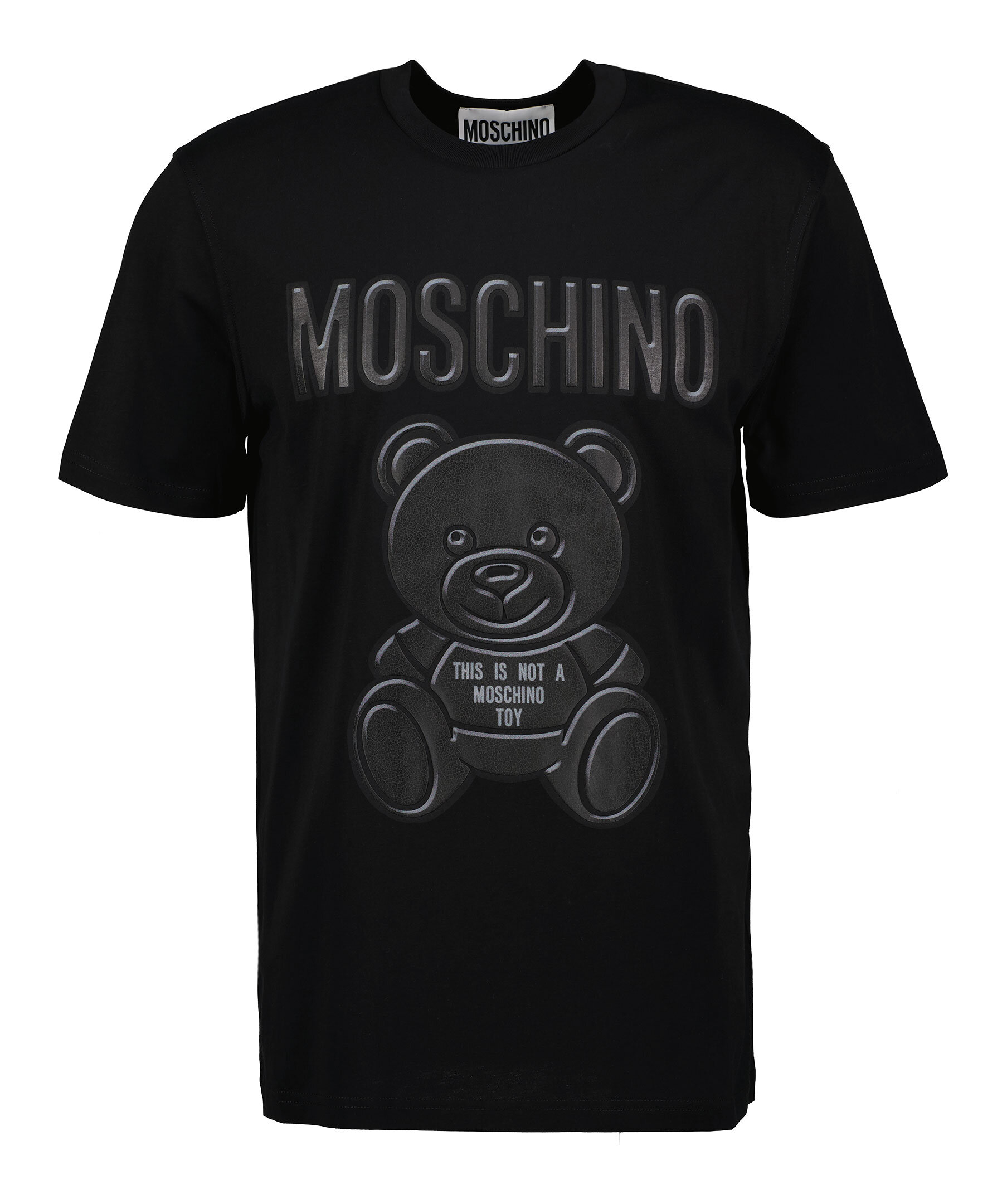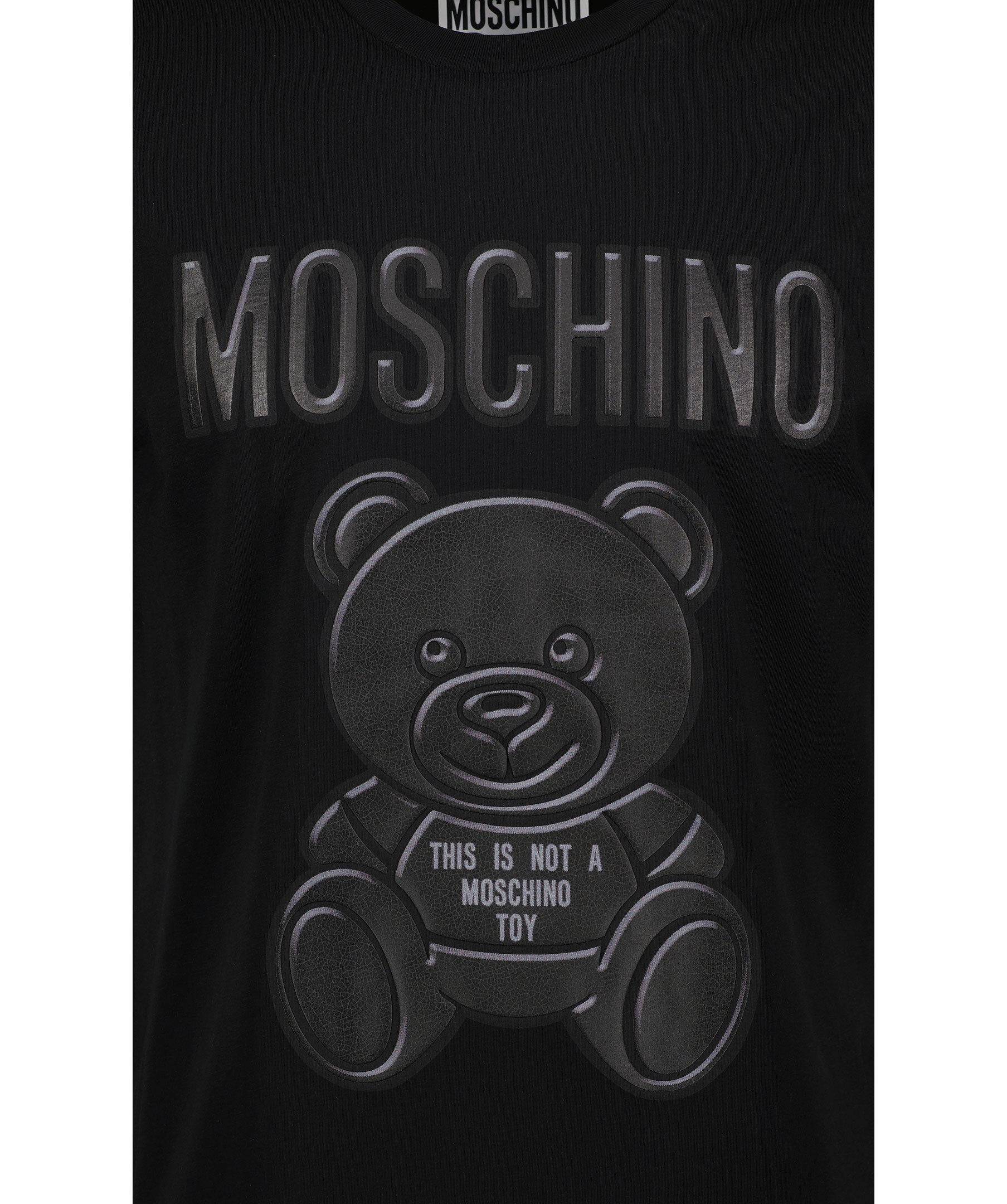 Svart t-shirt från Moschino gjord i 100% bomull. Gummerat tryck i grått på framsidan föreställande en nallebjörn och logotyp. Normal passform.