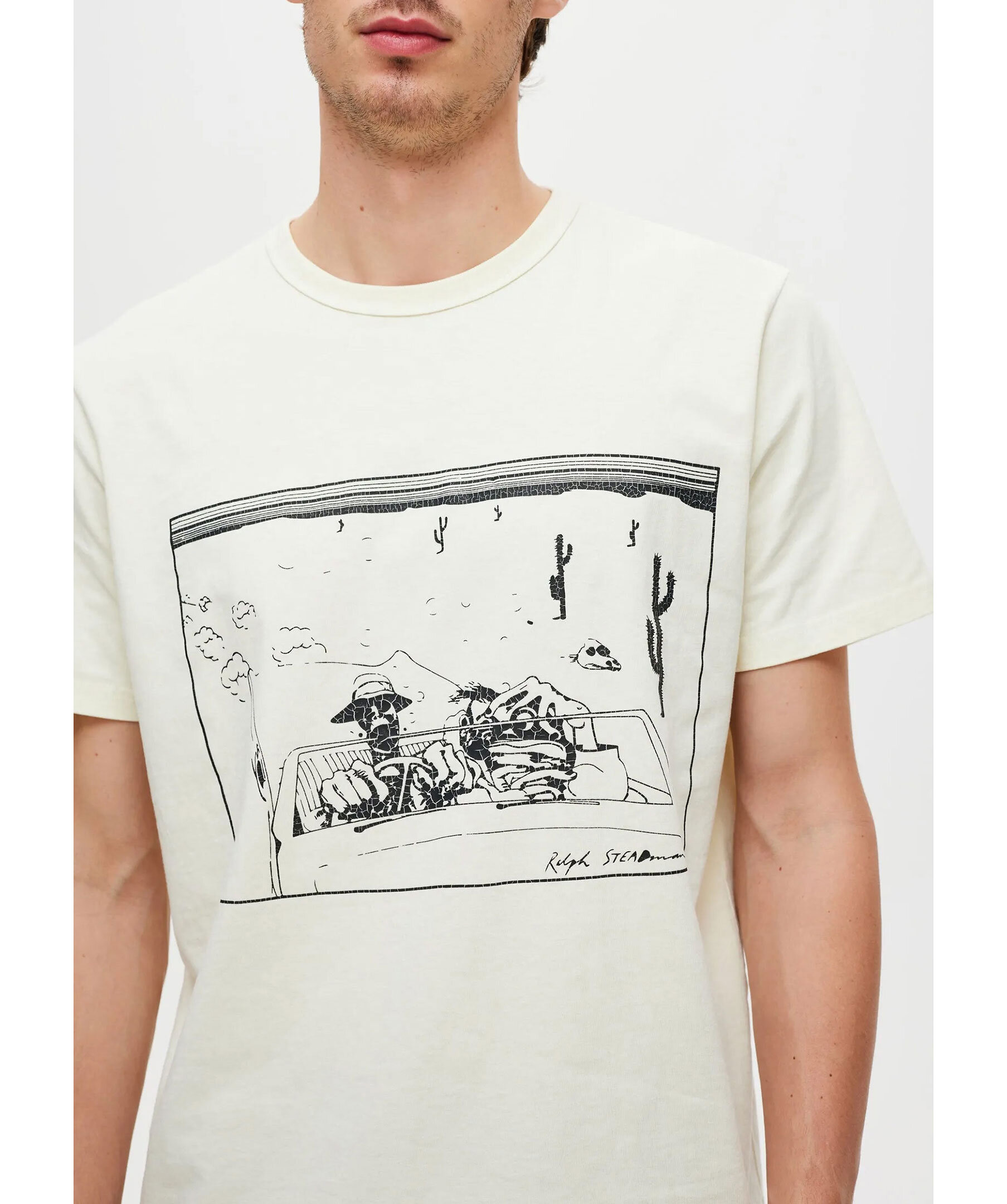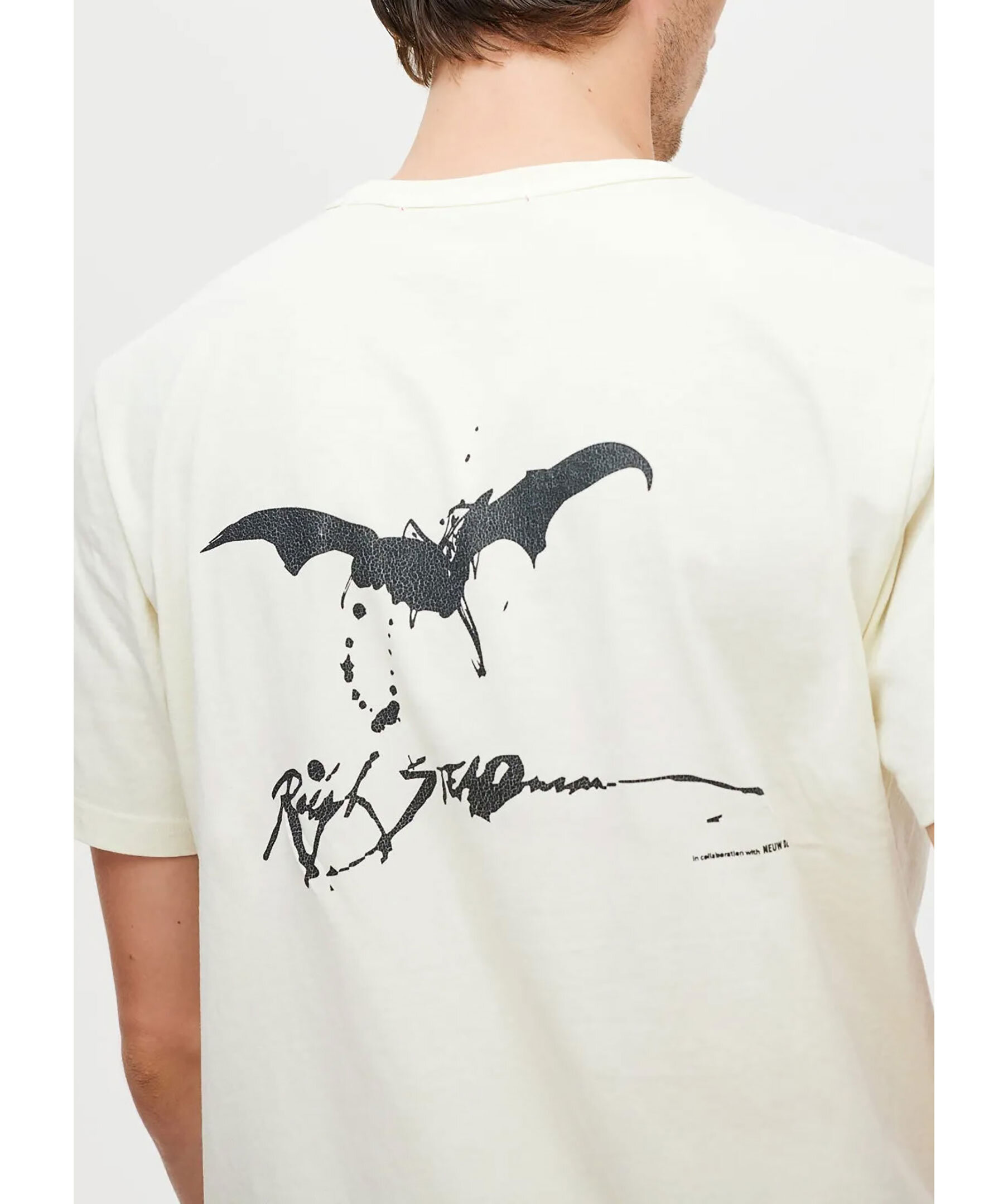 Krämfärgad t-shirt från Neuw. T-shirten har ribbad halsringning, stort vitt krackelerat tryck på framsida och baksida. Tillverkad av 100% bomull.