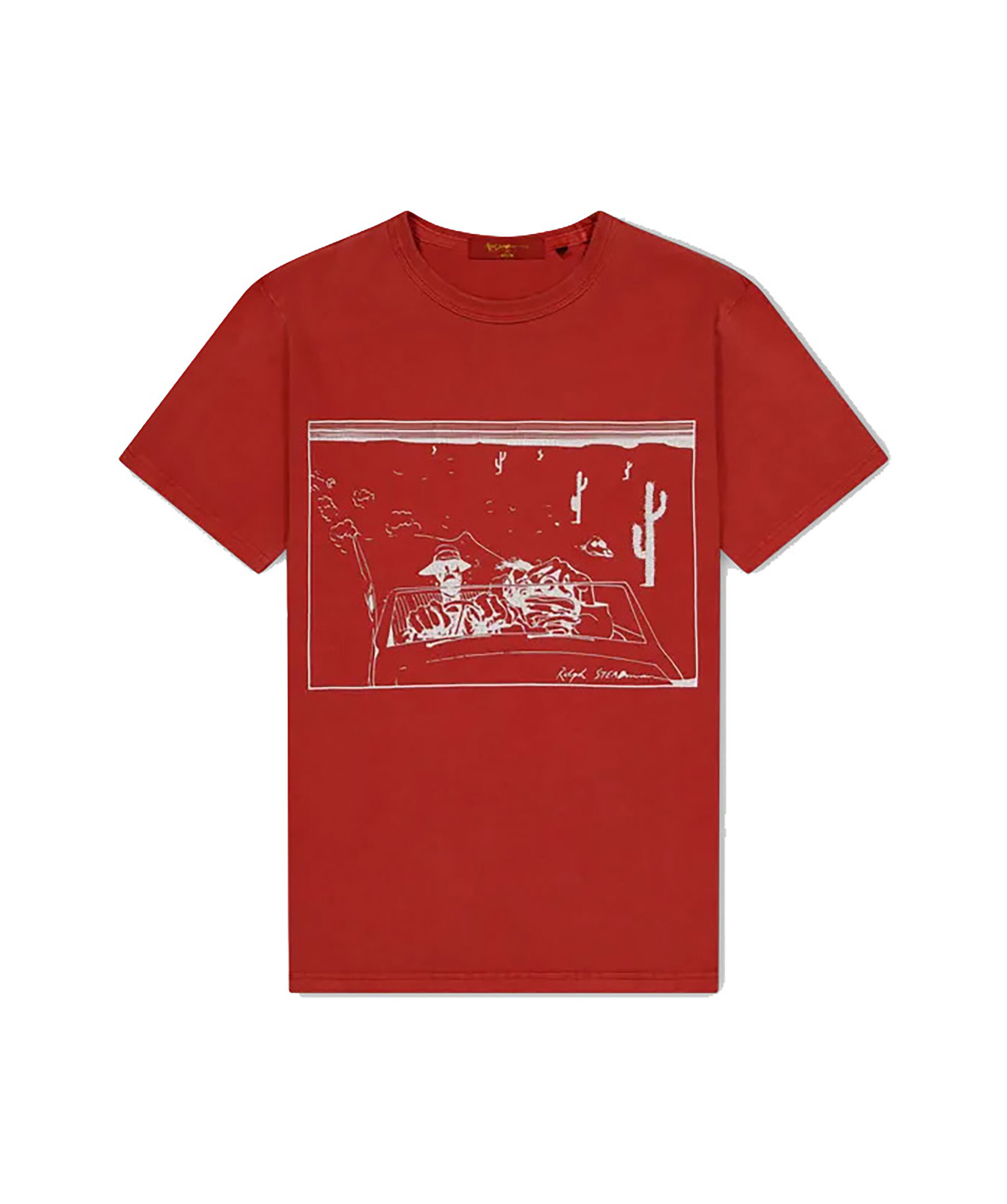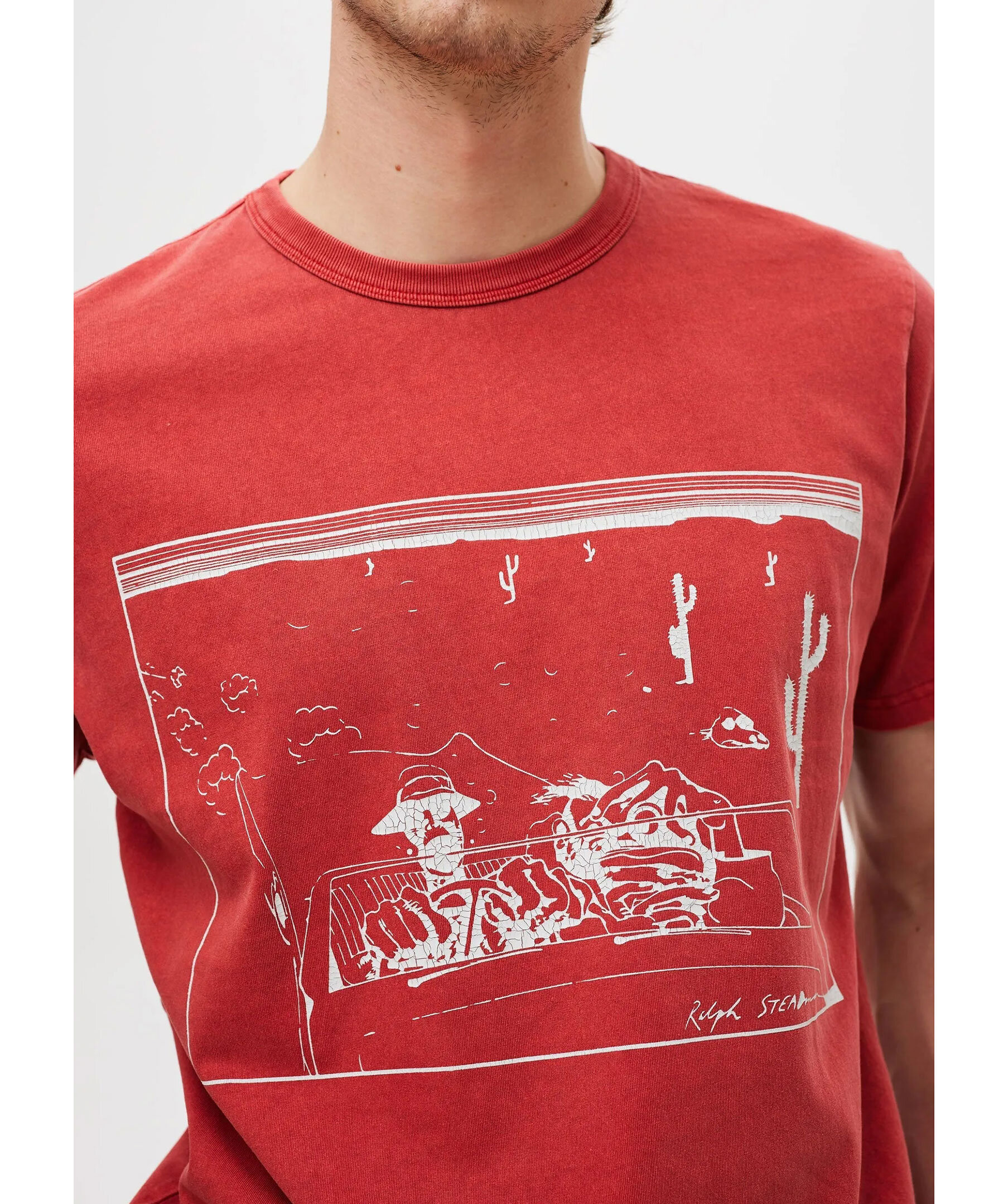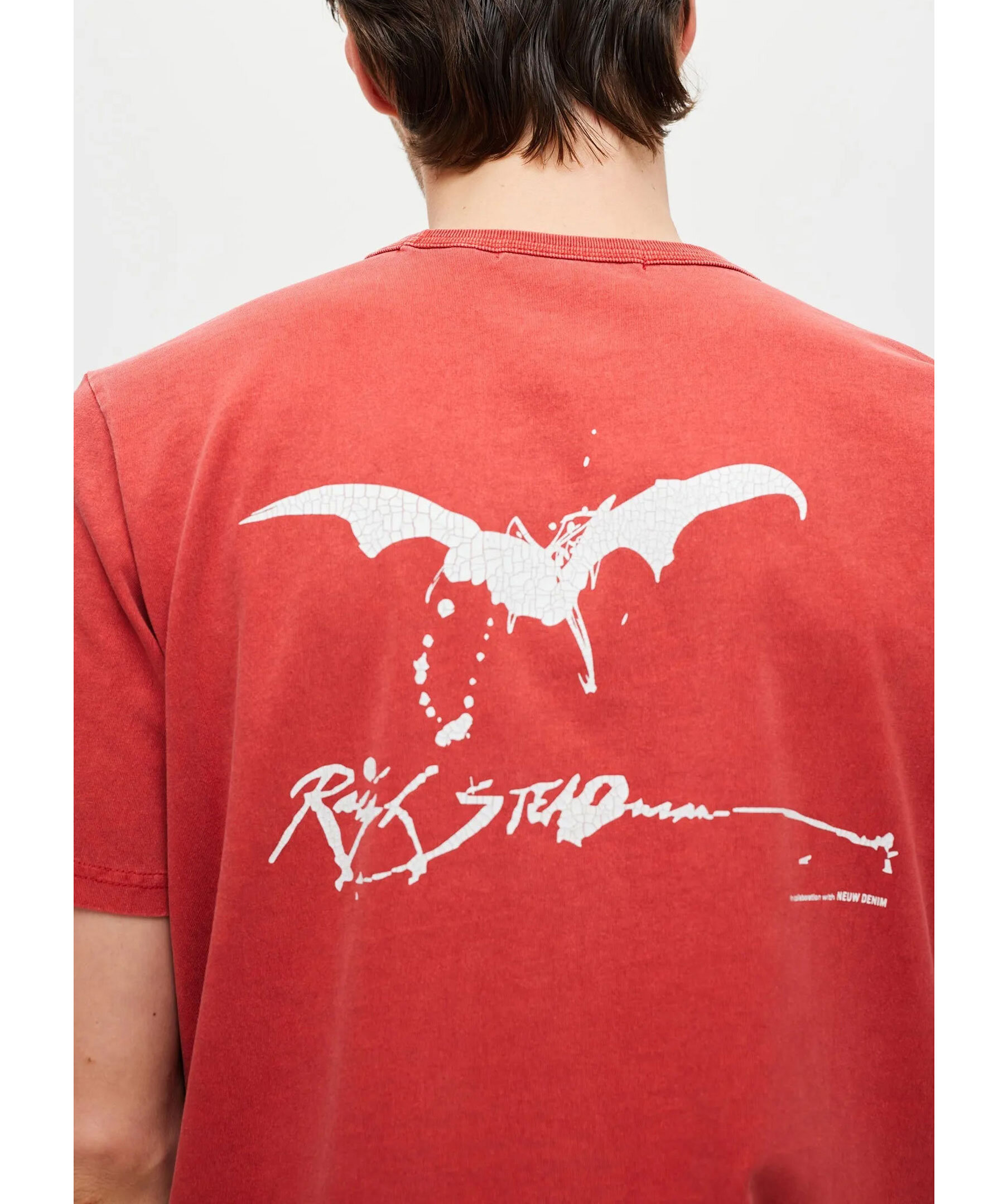 Tegelröd t-shirt från Neuw. T-shirten har ribbad halsringning, stort vitt krackelerat tryck på framsida och baksida. Tillverkad av 100% bomull.