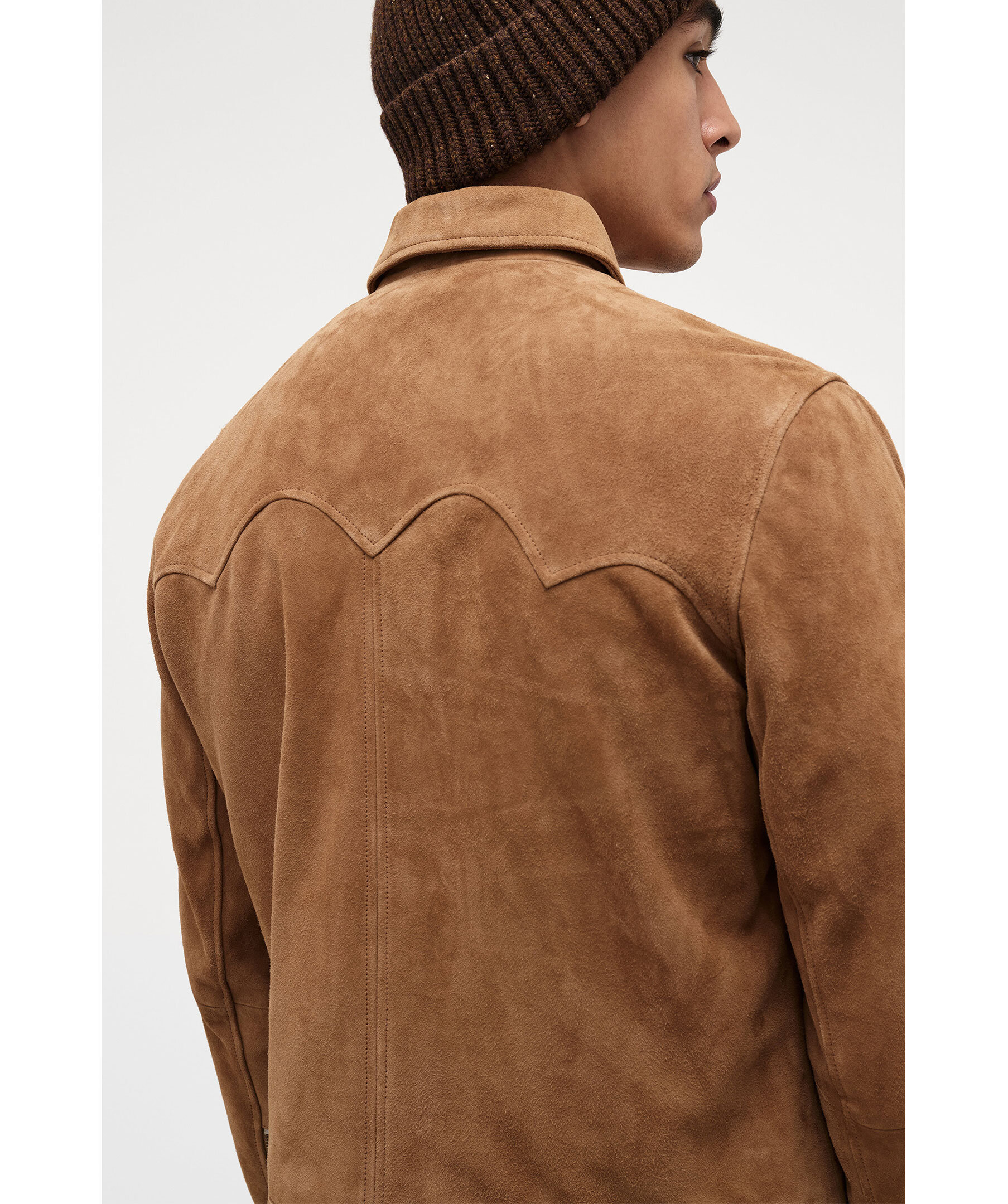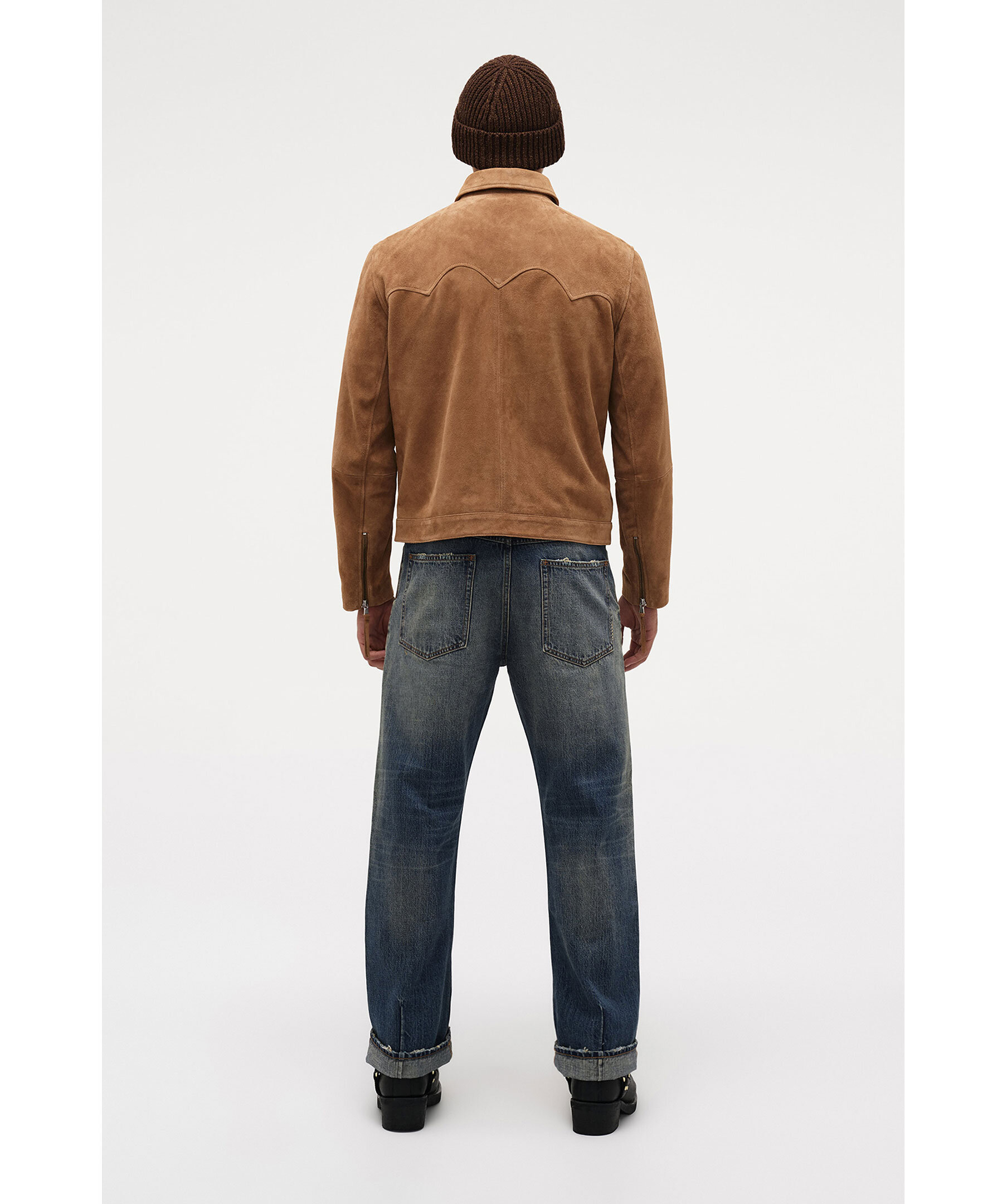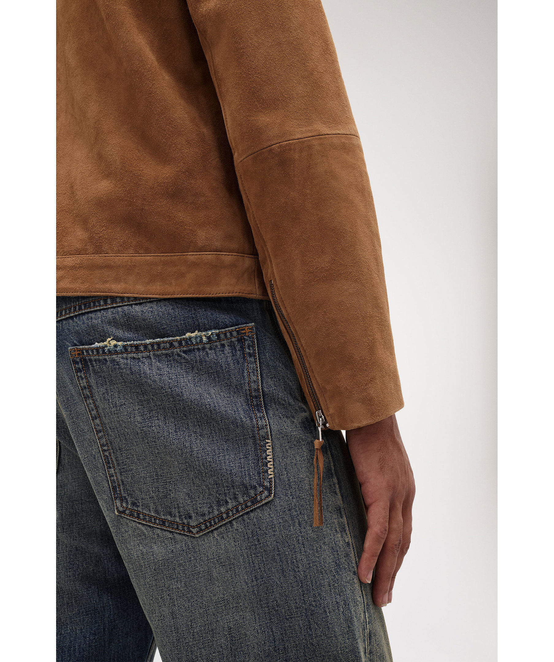 Mockajacka i western inspiration från Neuw. Gjord i ett mjukt mockaläder med whiskery tan‑ton och metallbeslag, designad med en avslappnad men samtidigt strukturerad passform. Den är helfodrad för komfort och kan stylas med mörk denim och vit t‑shirt för en avslappnad look eller med skräddade byxor för en mer polerad westernprägel.