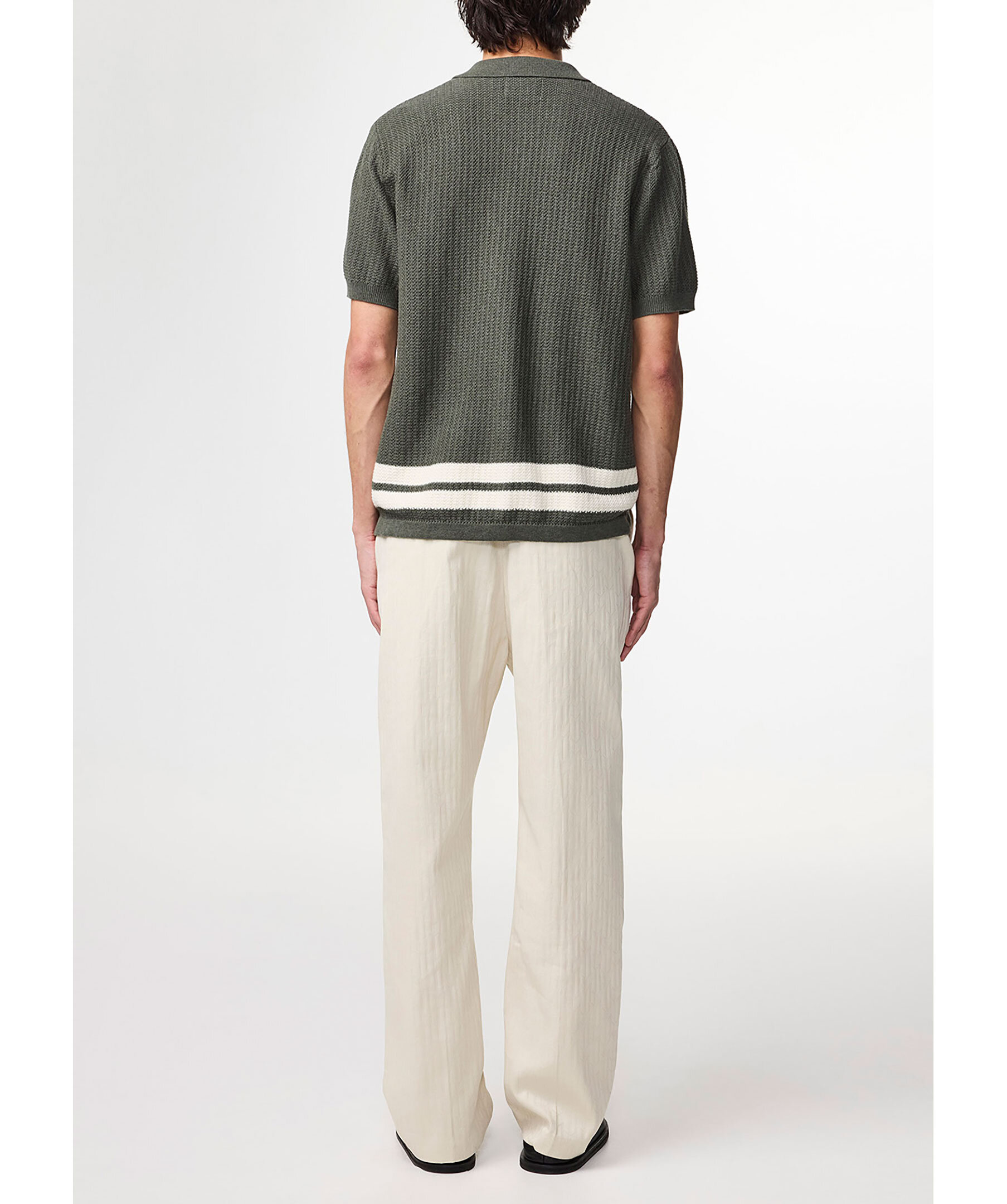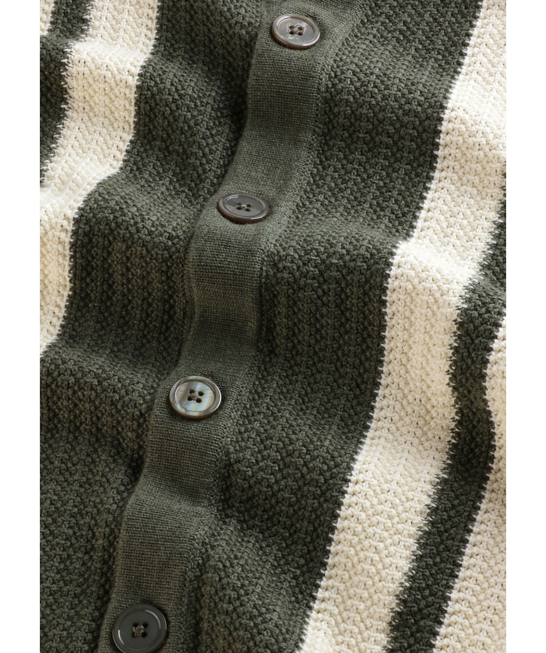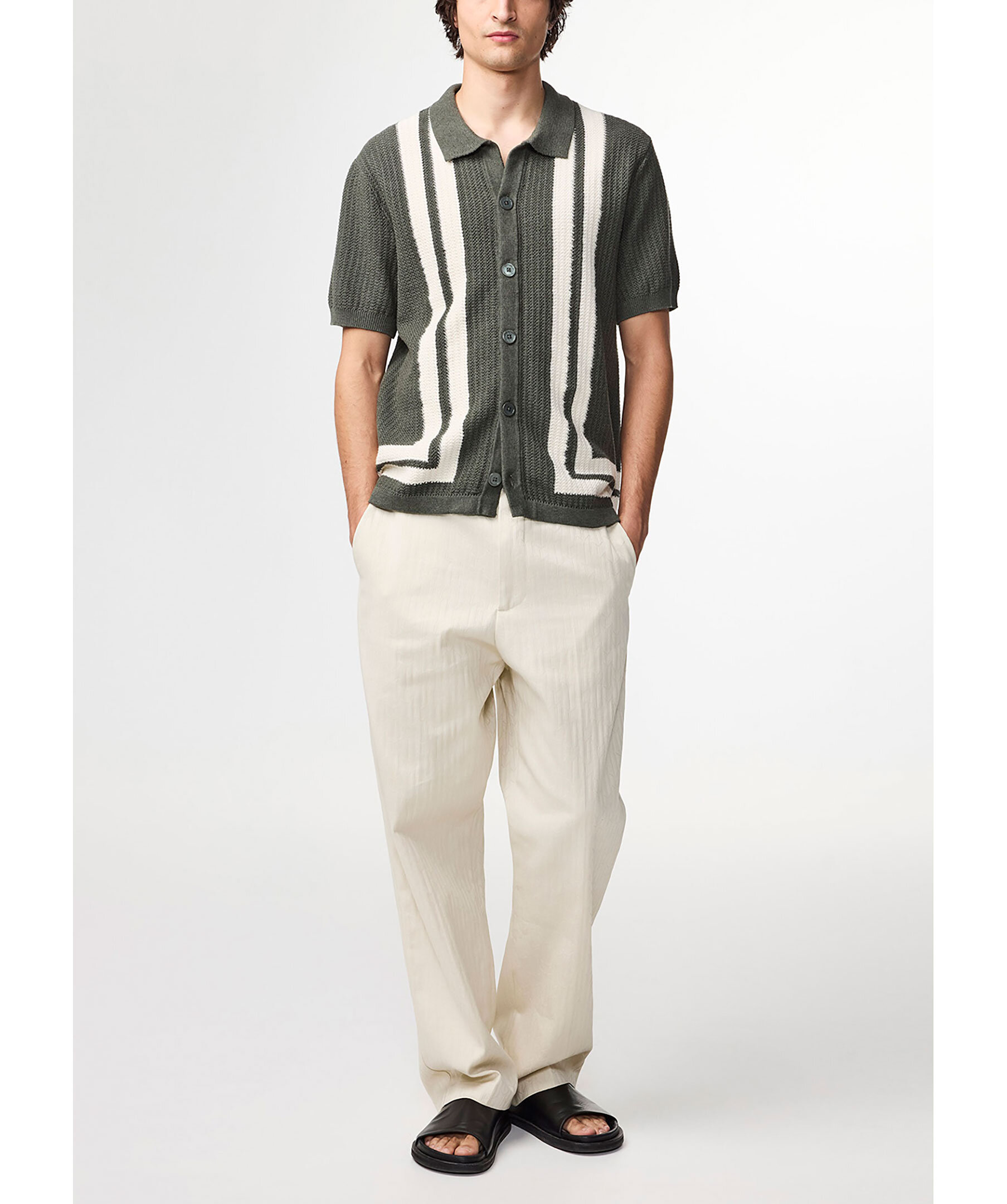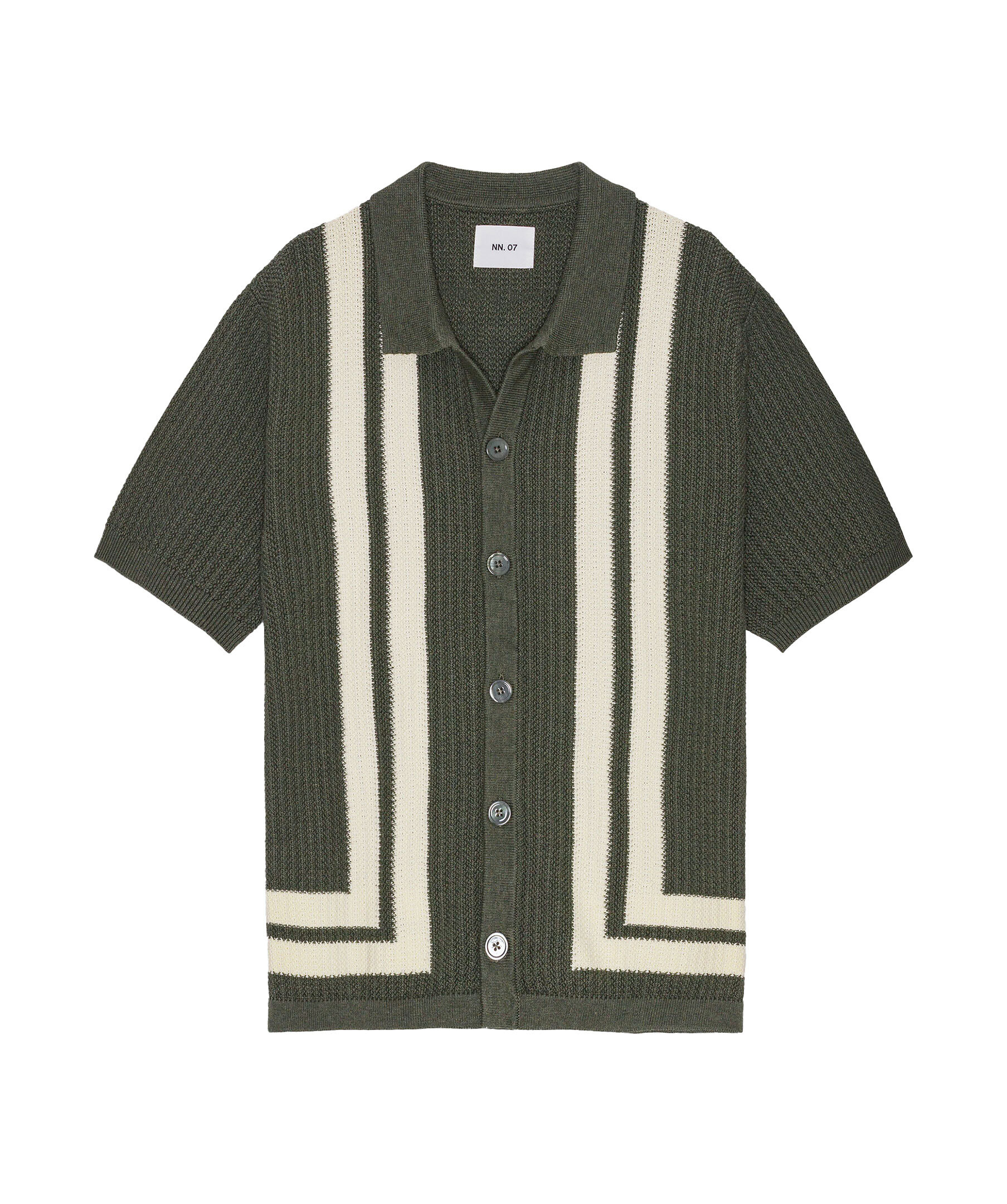 Grön och benvit, stickad skjorta från NN07. Skjortan har korta ärmar och är stickad i texturstickning med randiga detaljer och försedd med pärlemorknappar. Tillverkad i ekologisk bomull.