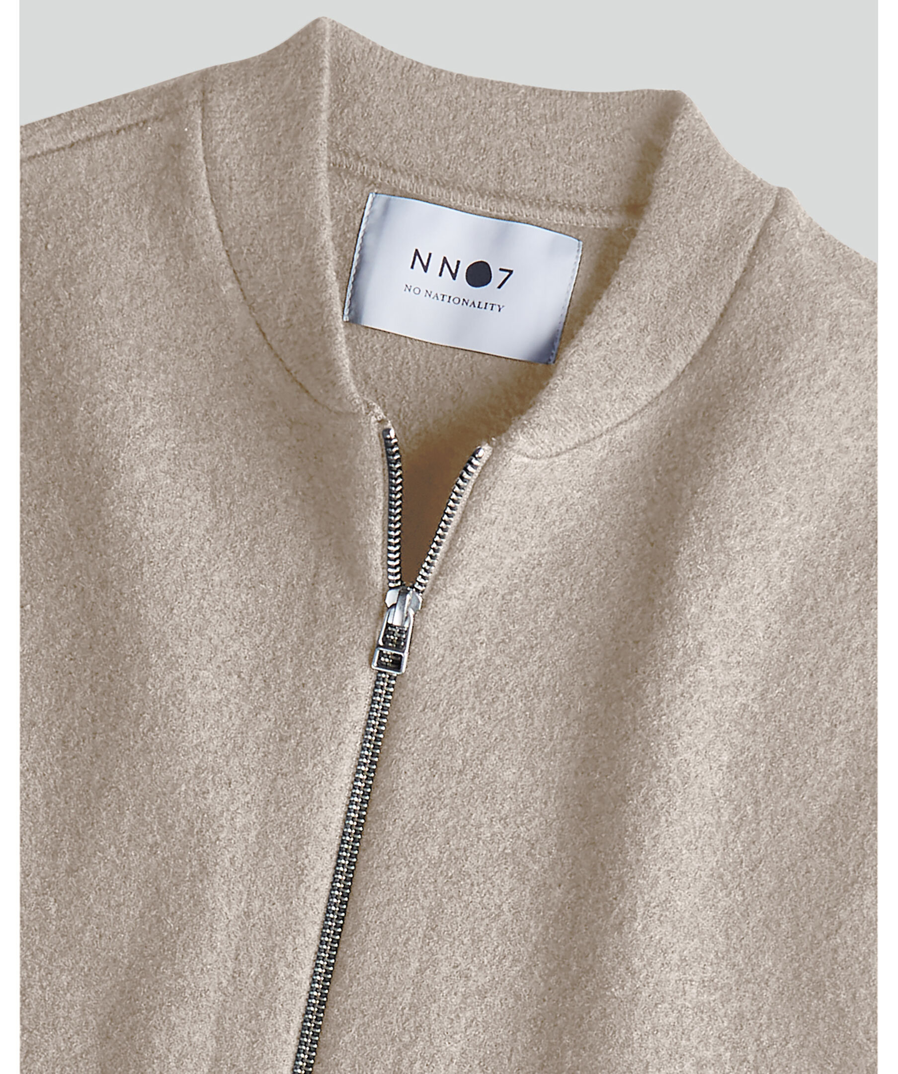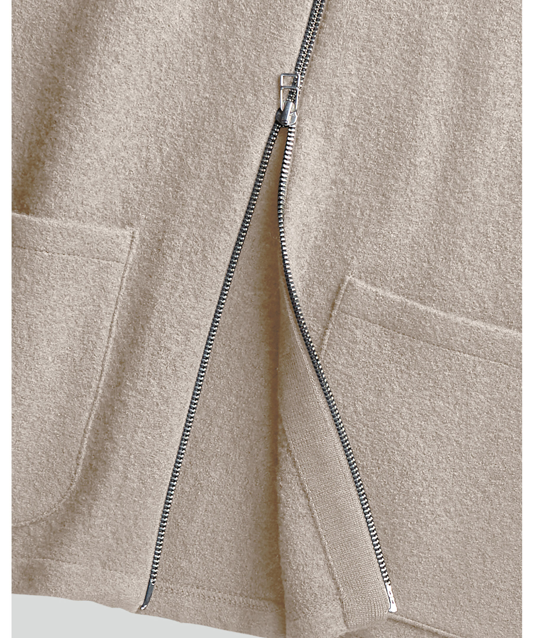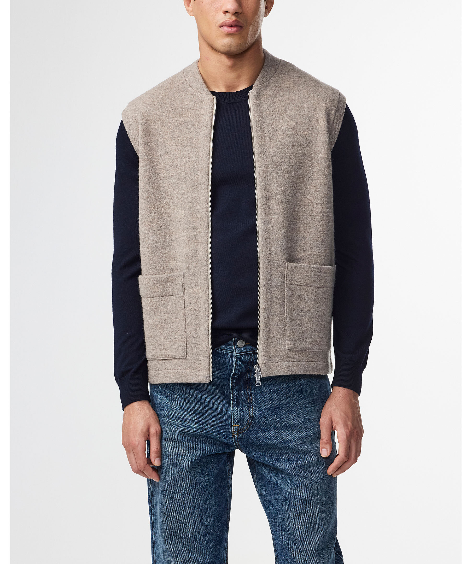 En väst med dragkedja tillverkad i mjukt kokt merinoull. Med minimalistisk bomberkrage och kvadratiska dubbla fickor.