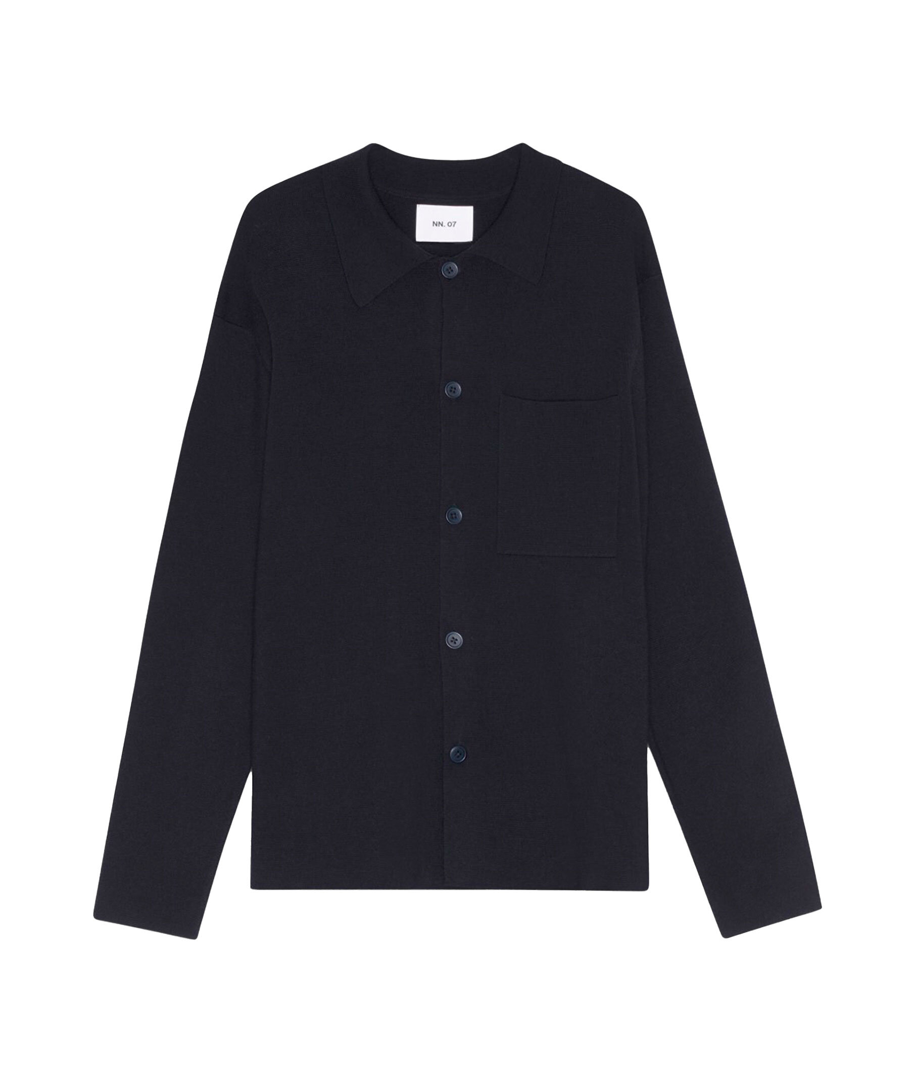 Marinblå overshirt från NN.007. En elegant variant av en traditionell skjorta med knappar, tillverkad i en mjuk ullblandning. Den är designad med en skjortkrage och knappar och kompletterad med en bröstficka.