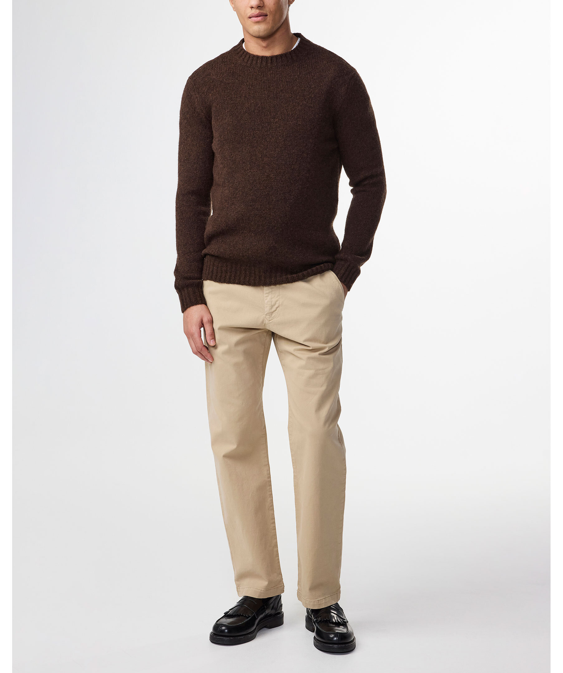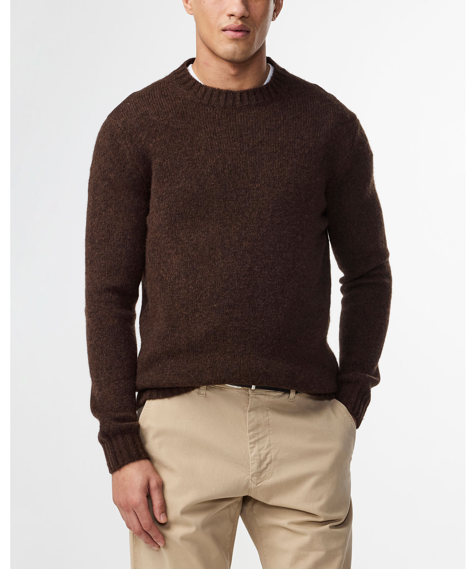 Brun, stickad tröja från NN.07. Rundad halsringning. Ribbstickad mudd vid kragen, ärm- och plaggslut. Tillverkad i ullblandning.