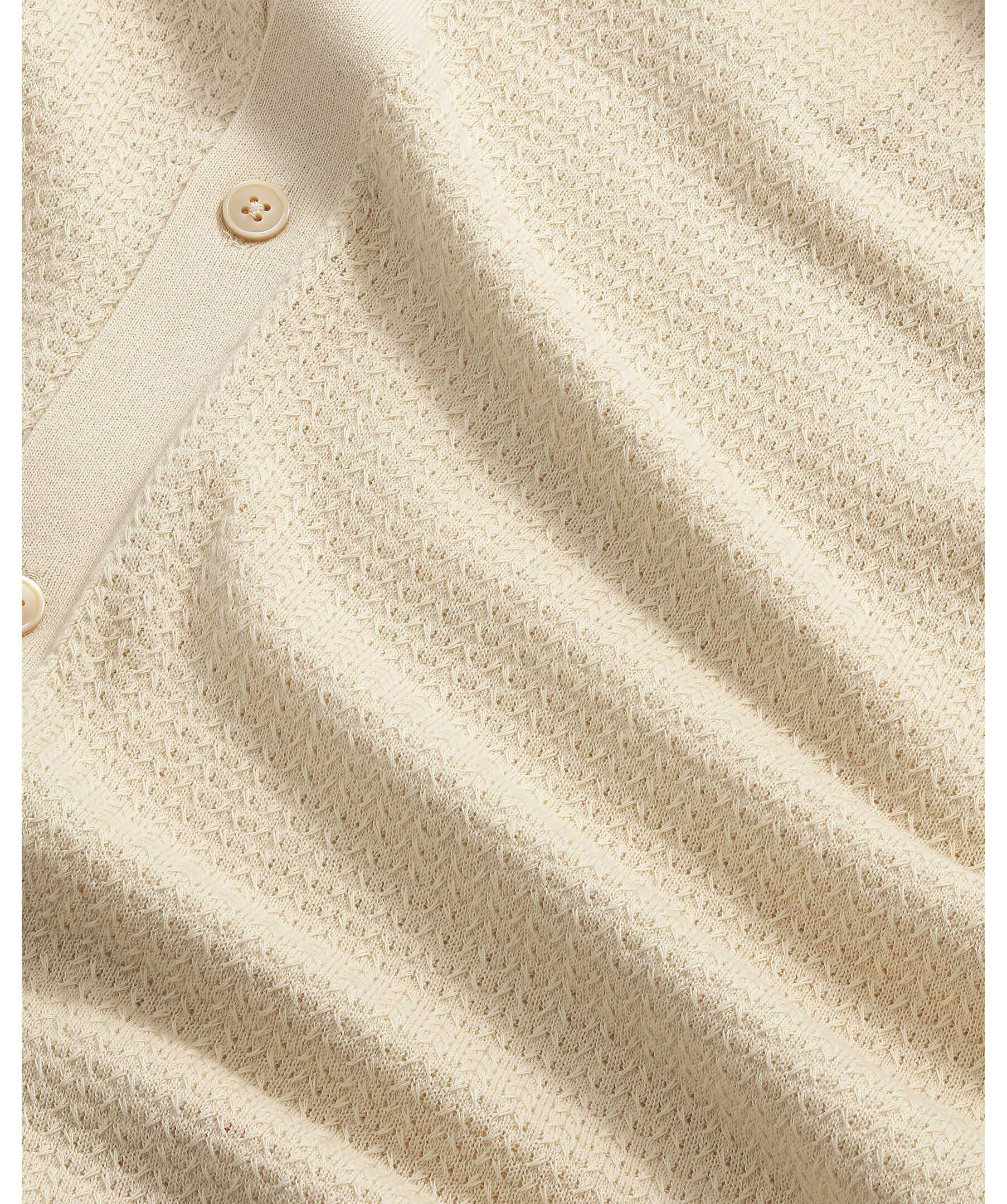 Cremévit polo tillverkad med skarpa, strukturerade sömmar och kontrasterande detaljer. Avslutad med enkla Corozo-knappar på en ren knappslå för en elegant och avslappnad look.