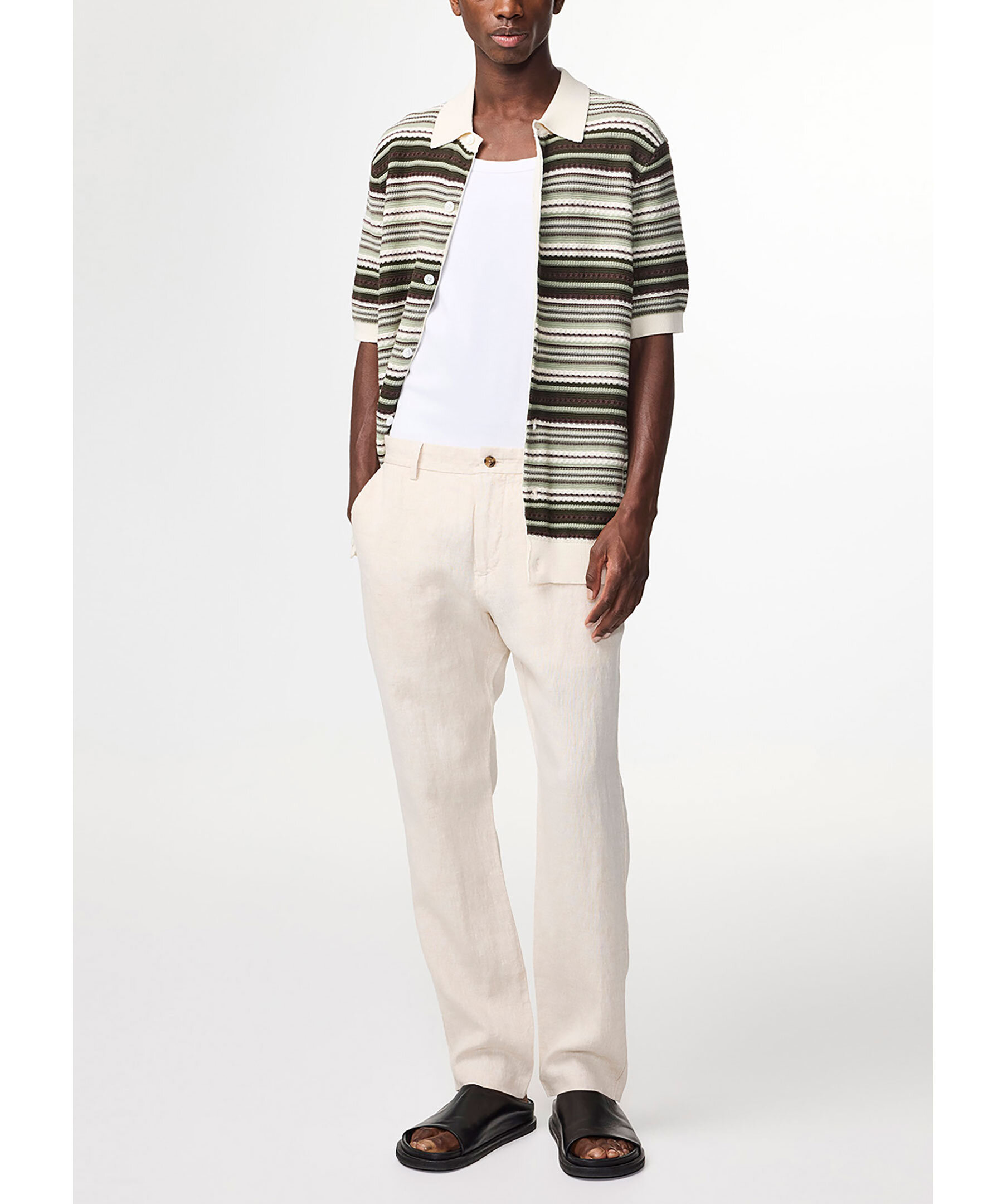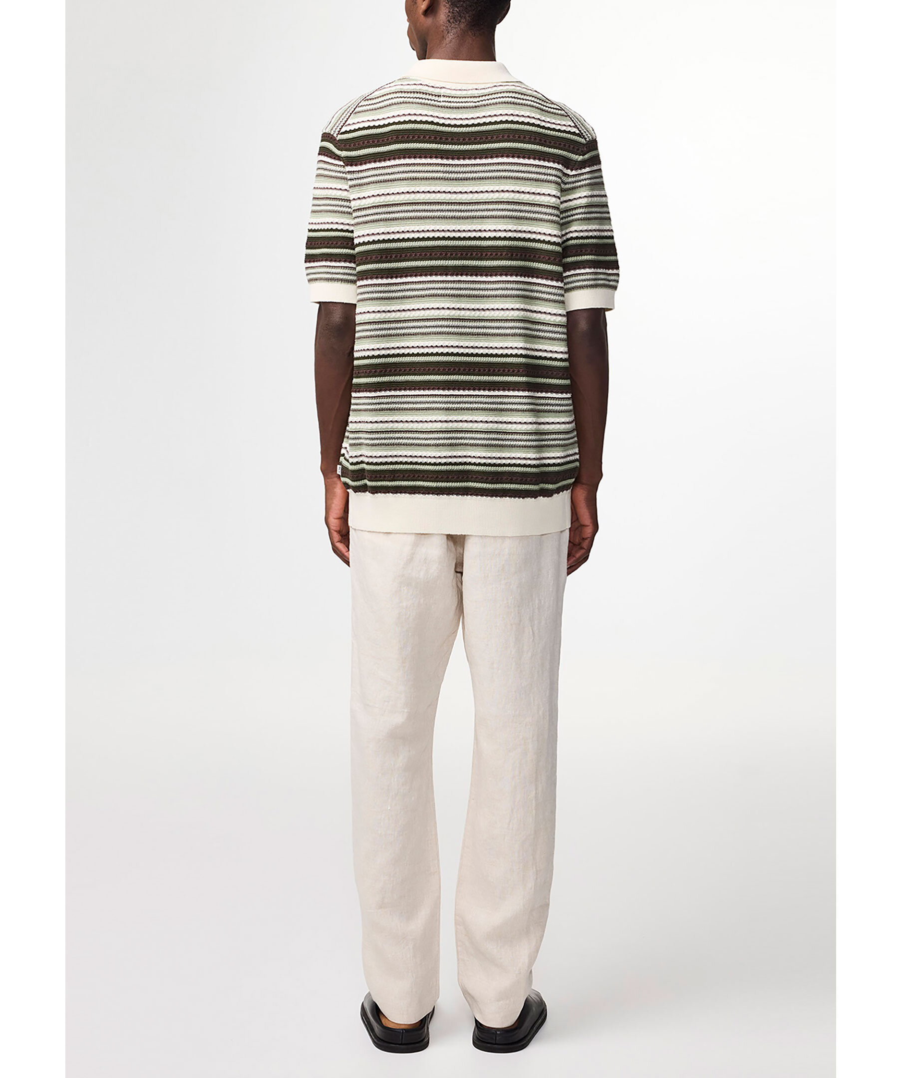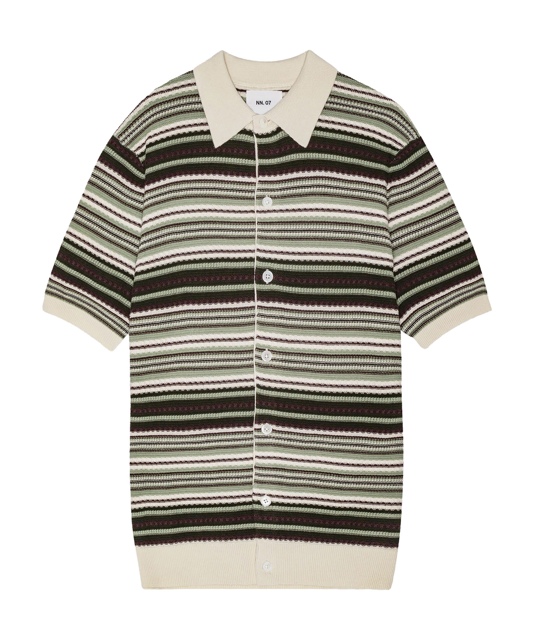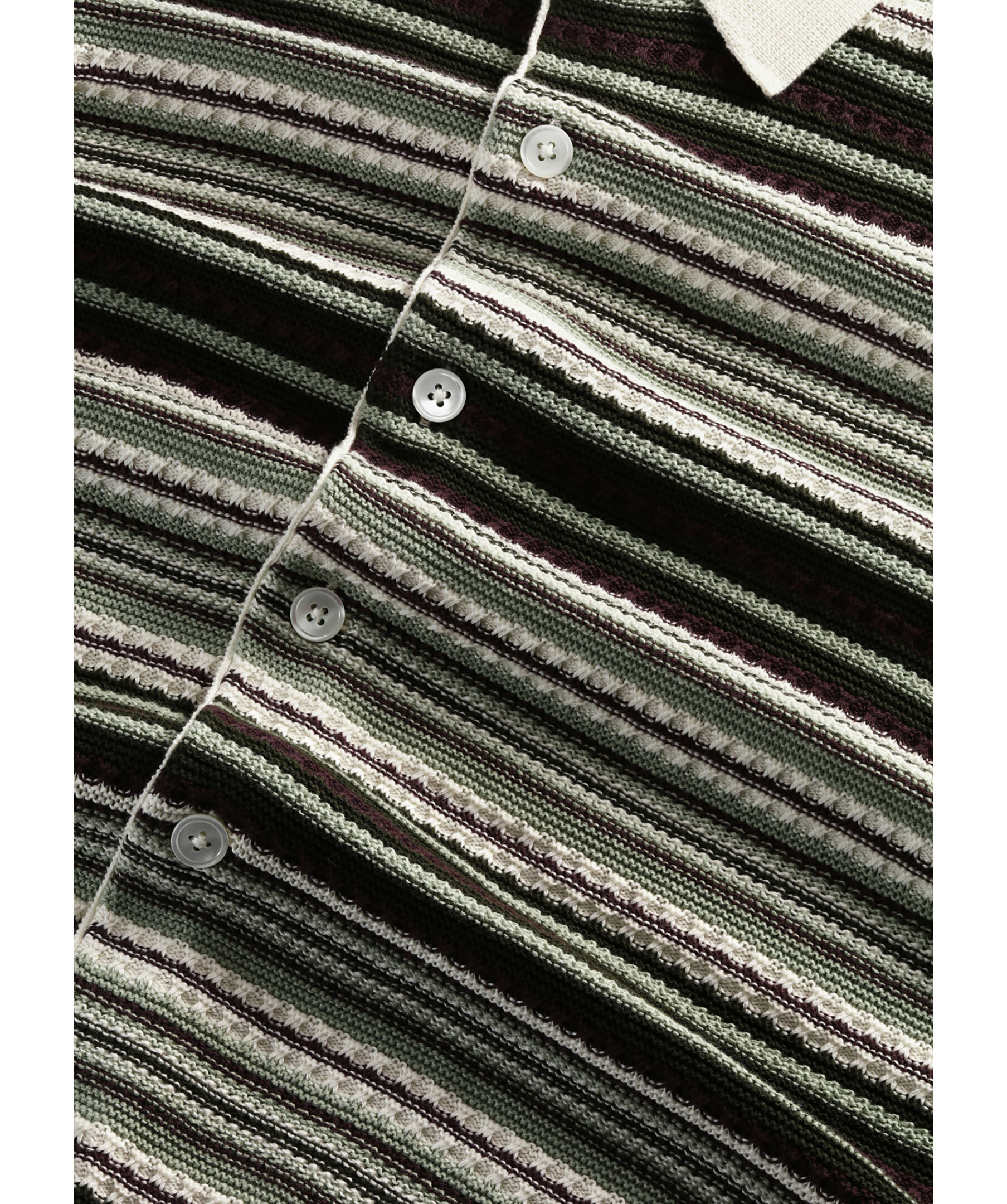Multifärgad, randig och stickad cardigan med korta ärmar. Stängs med pärlemorknappar och har ribbstickade kanter. Tillverkad i ett randigt texturerat ekologiskt bomullsgarn.