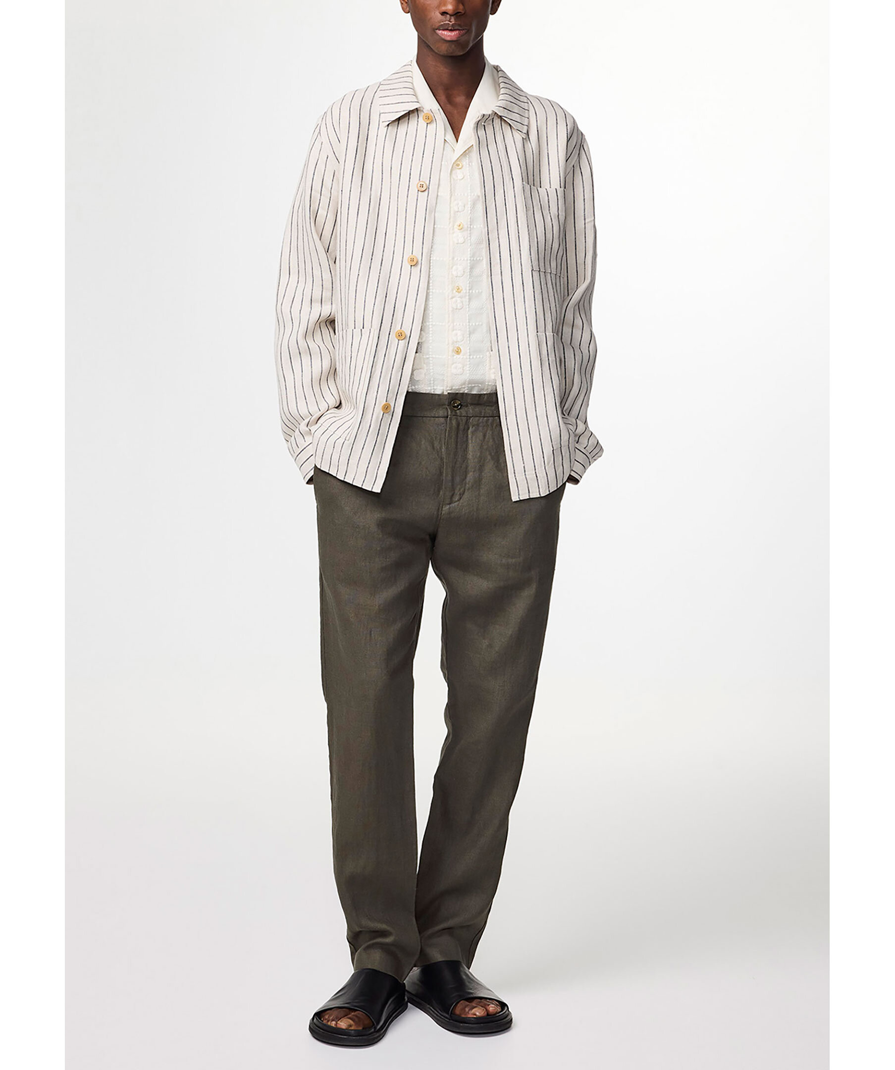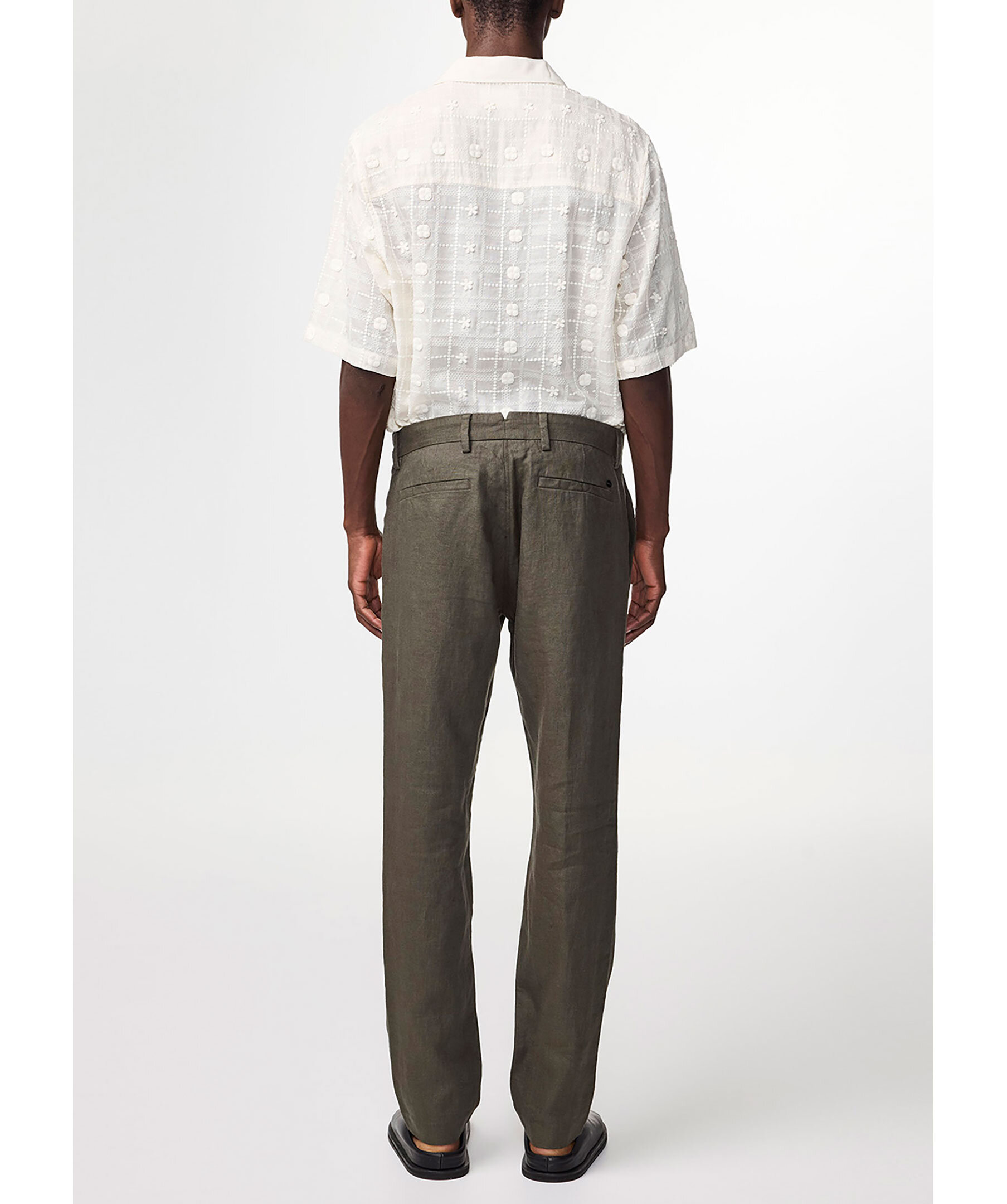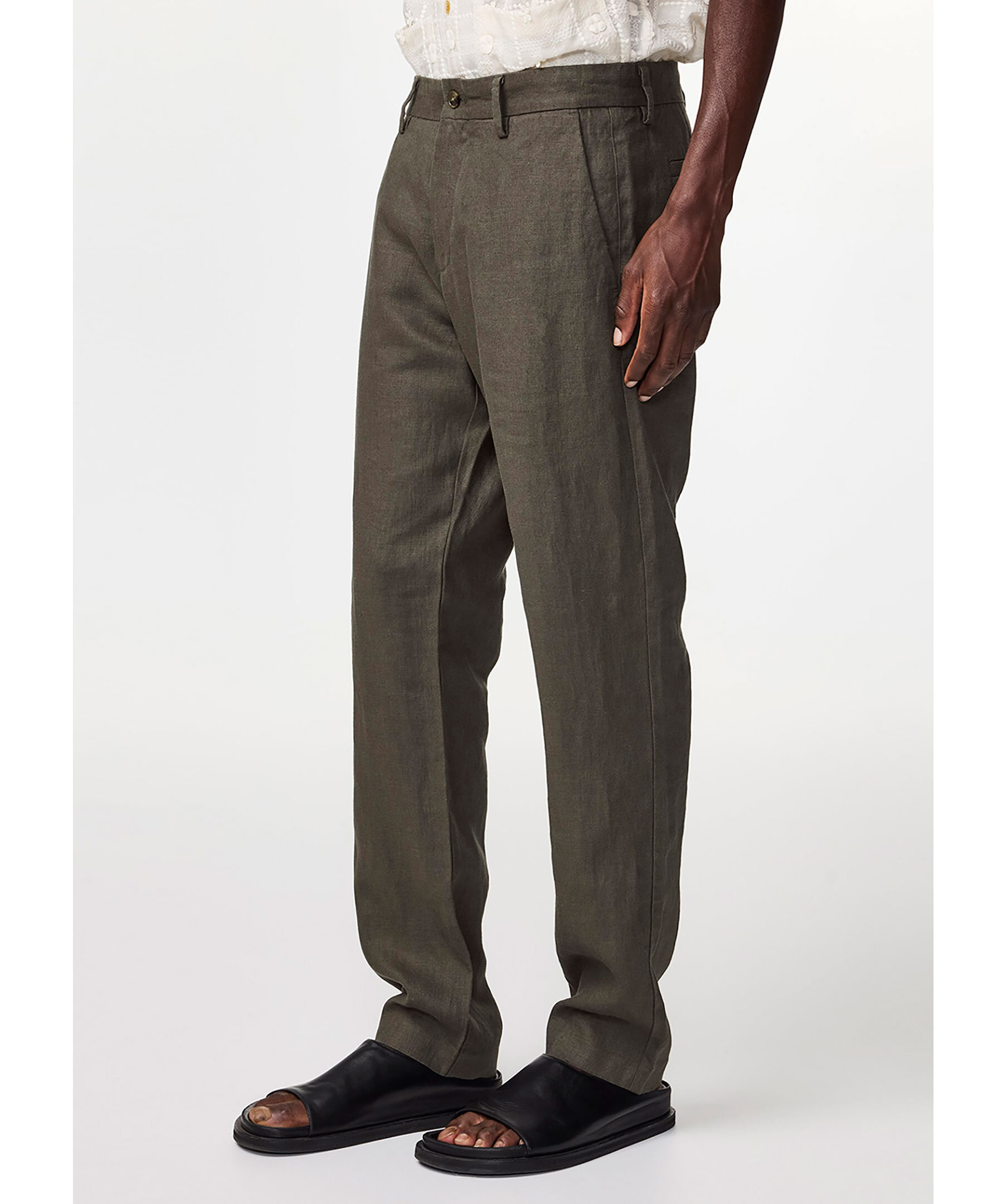 Mörkgröna linnebyxor från NN 07. Två fickor framtill och två bakfickor hällor för bälte. Gylf som stängs med krok och ögla. Medelhög midja. Avsmalnande ben. Tillverkat i 100% Europeiskt Linne.