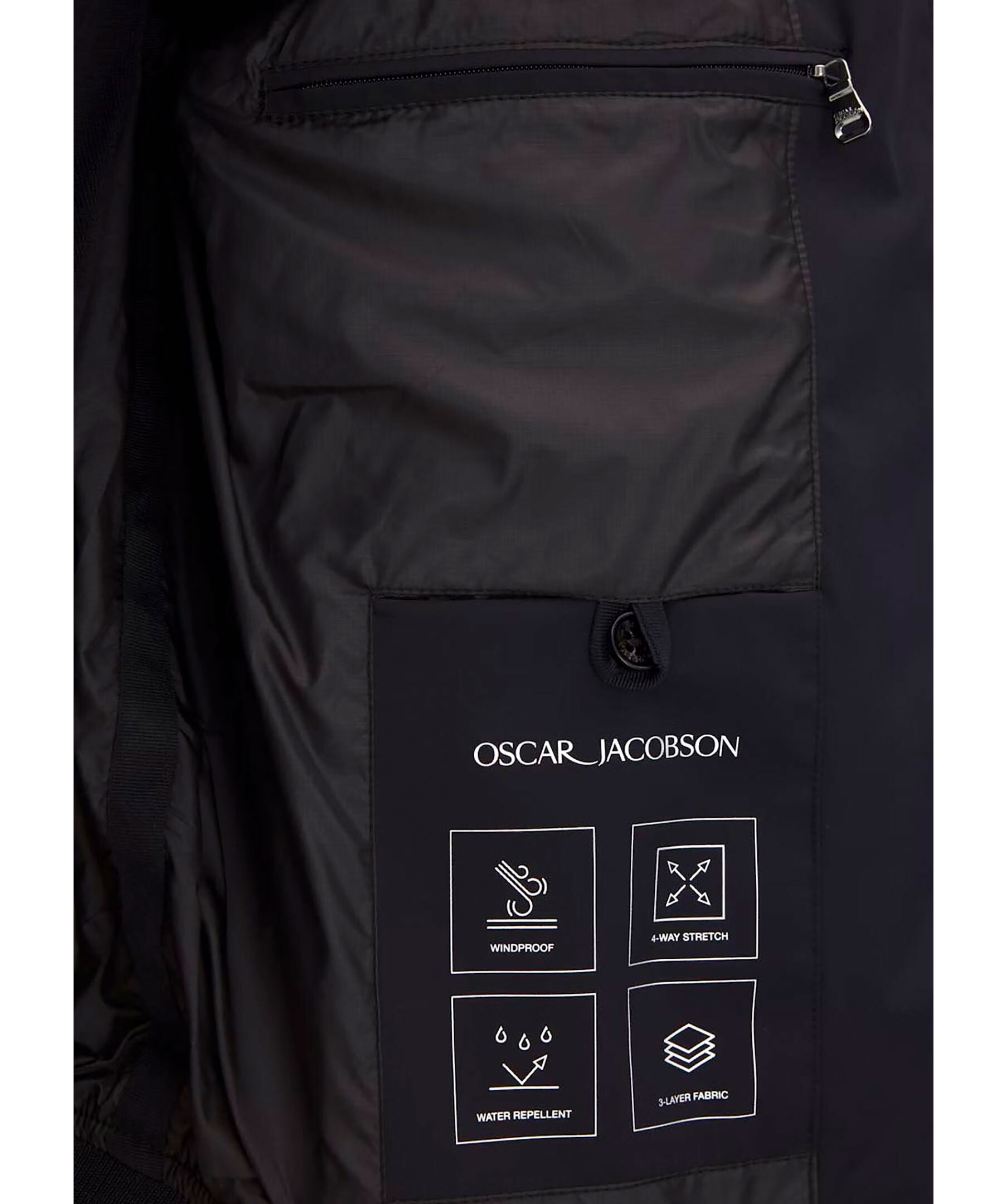 Mörkblå bomberjacka från Oscar Jacobson. Jackan är vattenavvisande, vintålig och har 4-vägsstretch. Jackan är en kortare modell med mudd vid ärm och jackslut. Den har tre innerfickor och framfickor med dragkedja. Tillverkad av en nylonblandning.