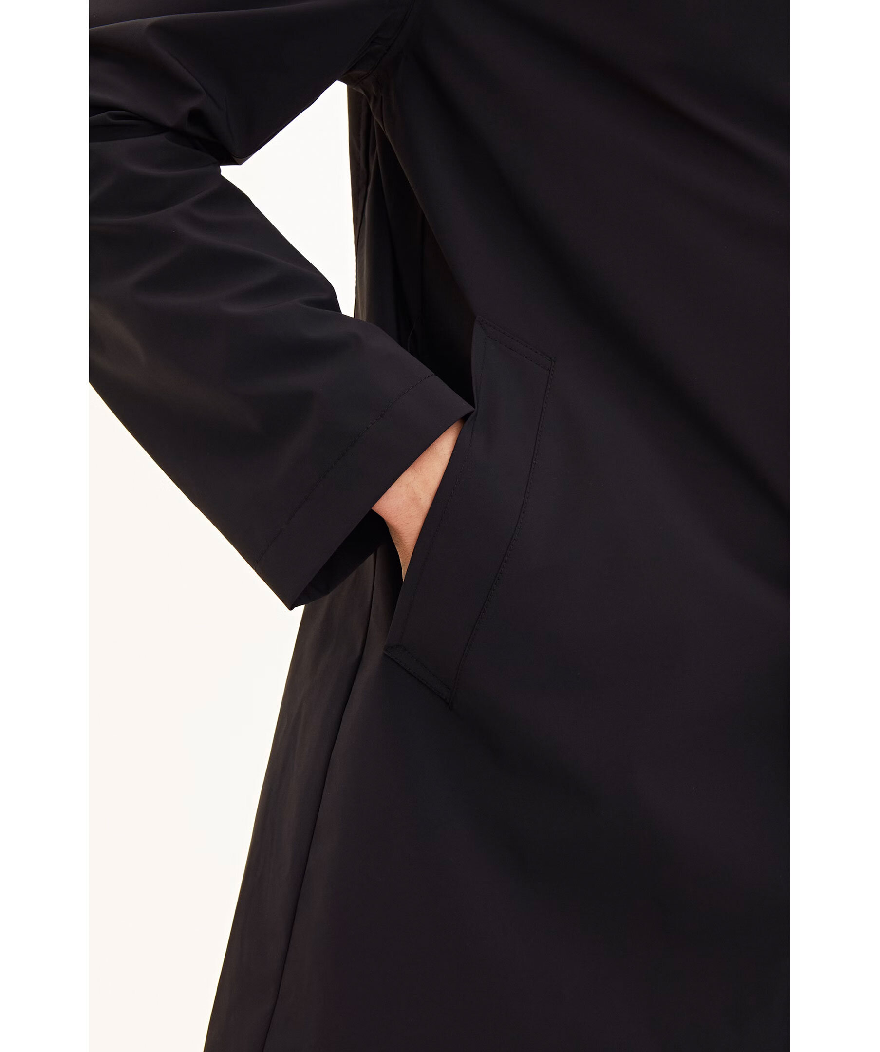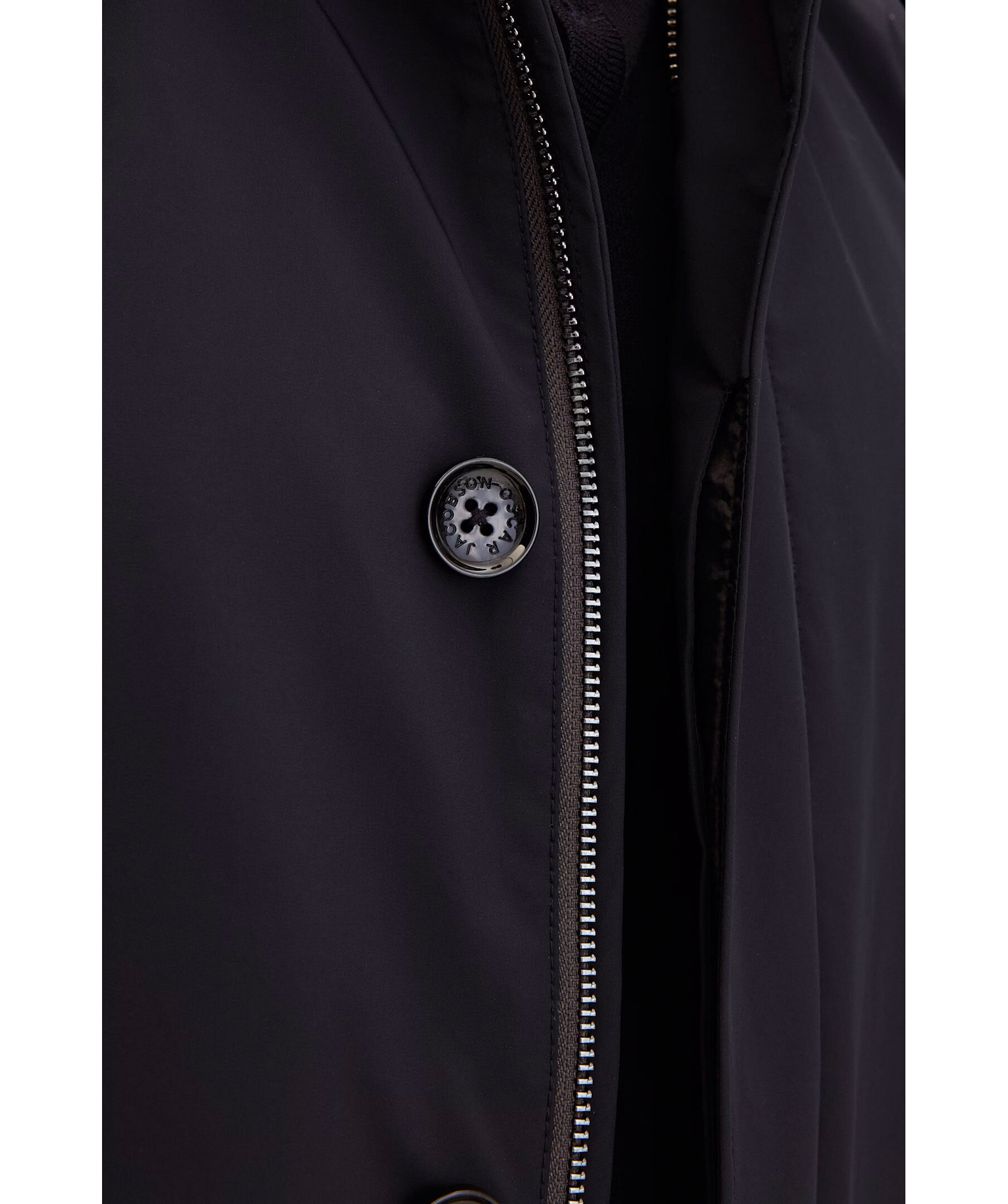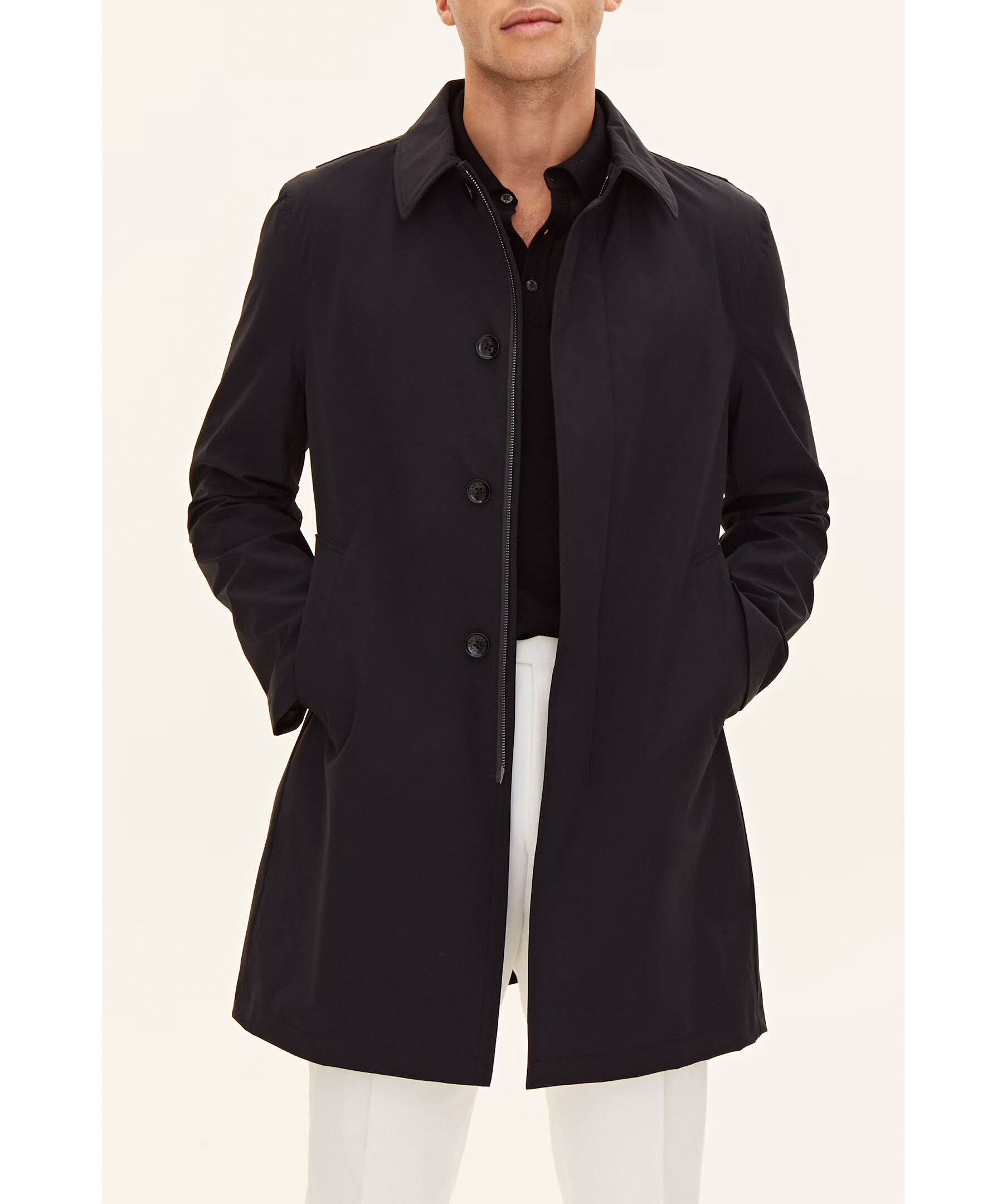 Mörkblå Car Coat från Oscar Jacobson. Gjord i Nylon Shell och är designad för att vara ett heltäckande skalplagg till din vardag och fungera till både formell kostym och lediga jeans. Utöver det vattenavvisande och vattentäta yttertyget så har rocken tejpade sömmar i axel och rygg för att hålla dig torr i tuffare väderförhållanden. Insidan av rocken är täckt i ett slitstarkt ripstop-foder och innehåller tre innerfickor samt knappar till infästning av våra liner-västar. Nylon Shell är vårt tre-lagers skalmaterial, framtaget för att skydda mot väder och vind helt utan att kompromissa på rörlighet, andningsförmåga eller stil.