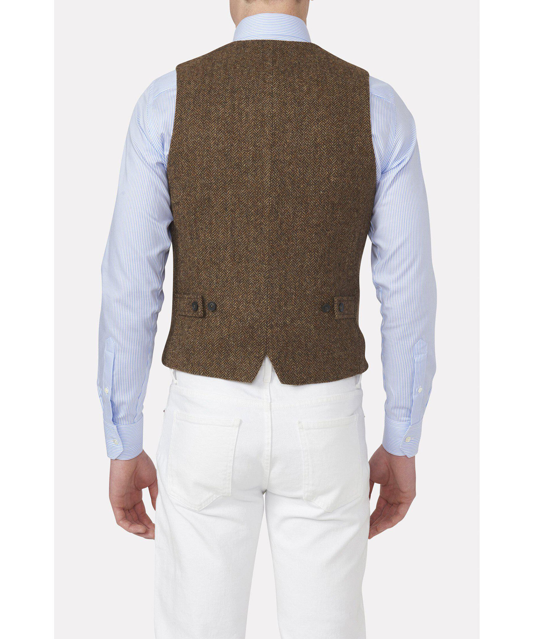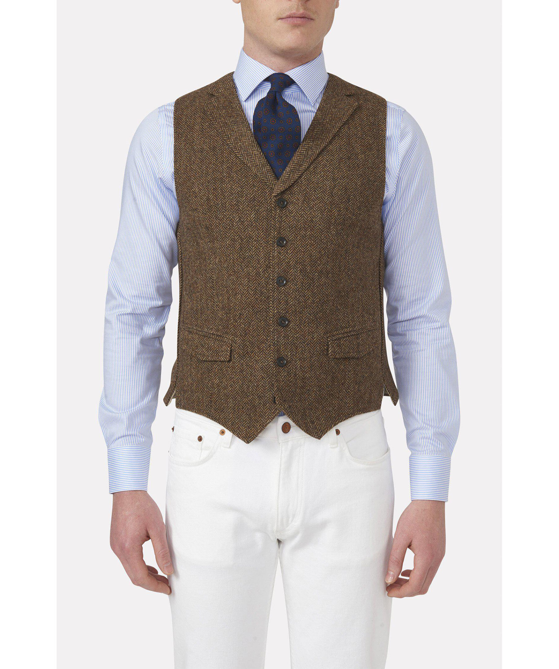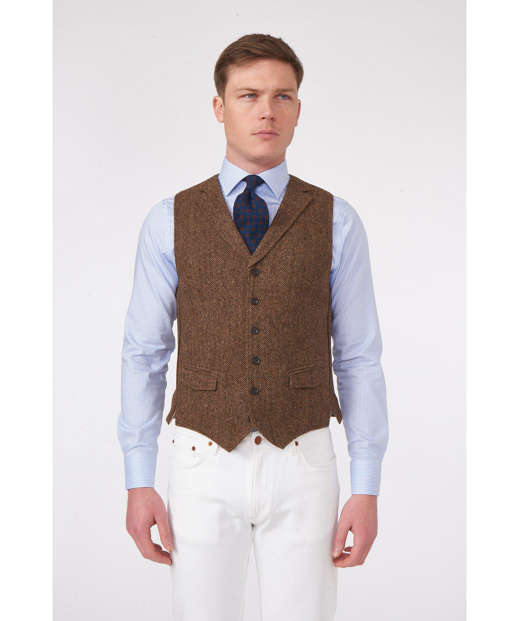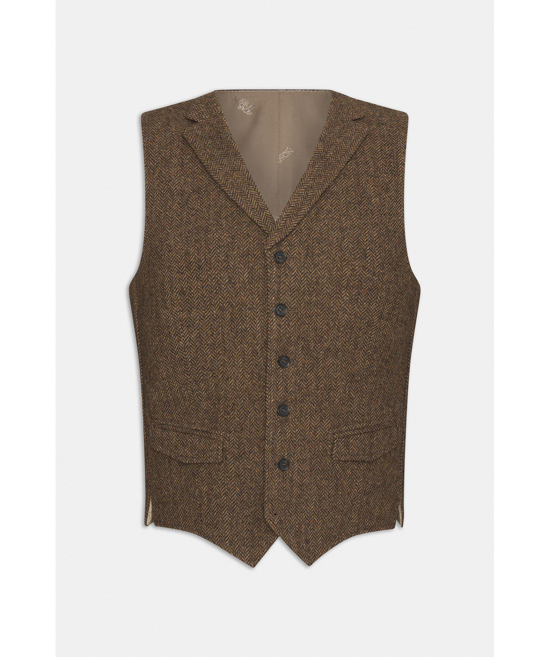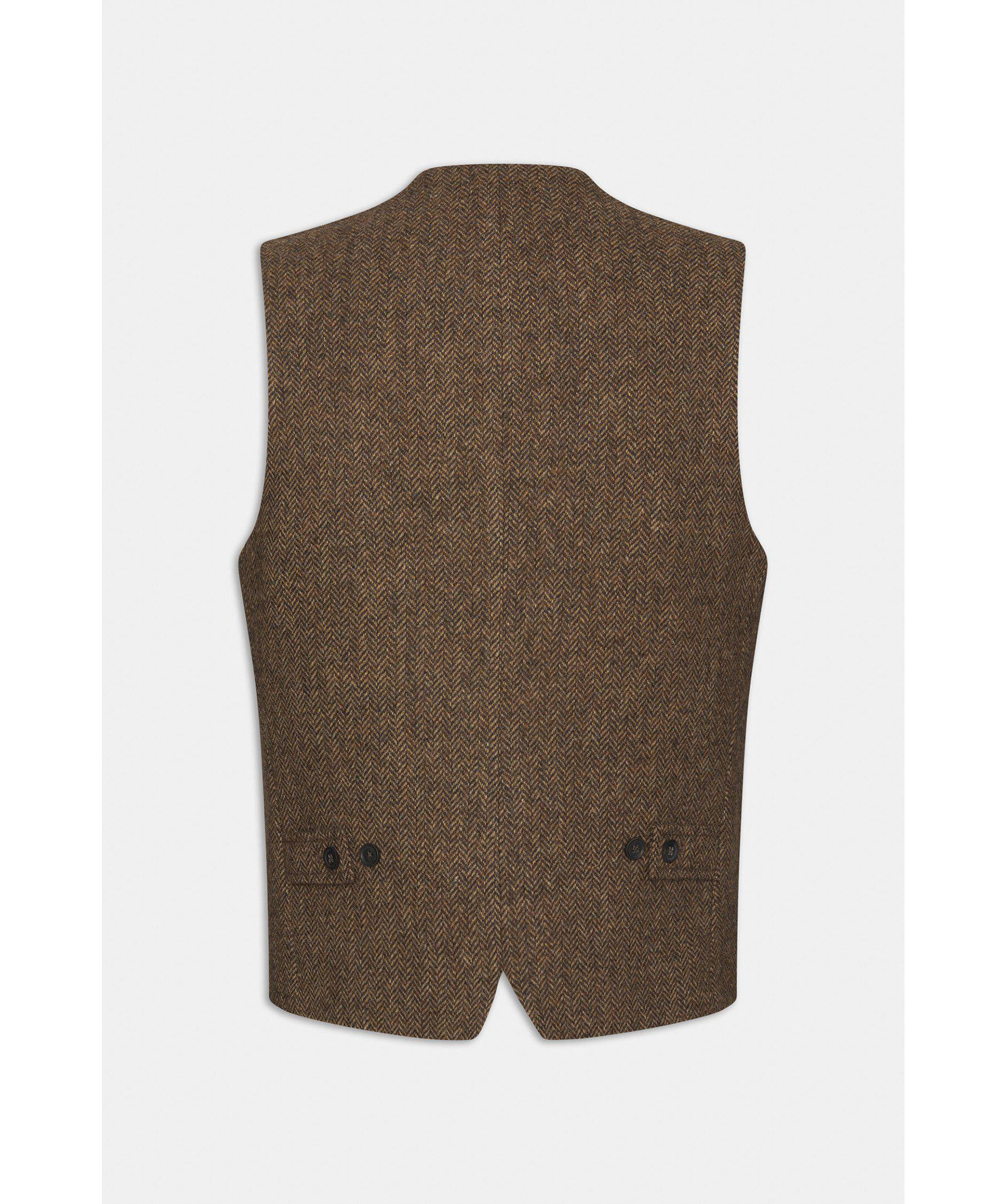 Väst med slag och täckt rygg i ett klassiskt tweedtyg i fiskbensmönster från Brittiska väveriet Moon.